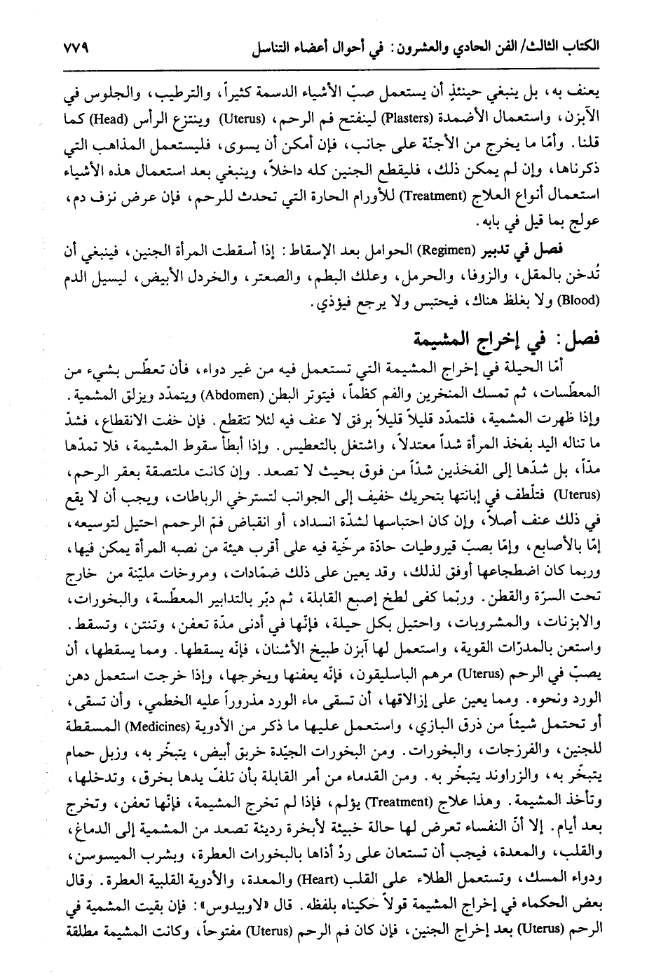 يعنف بِهِ بل يتبغي حِينَئِذٍ أَن يسْتَعْمل صب الْأَشْيَاء الدسمة كثيرا والترطيب وَالْجُلُوس فِي الابزن وَاسْتِعْمَال الأضمدة لينفتح فَم الرَّحِم وينتزع الرَّأْس كَمَا قُلْنَا. وَأما مَا يخرج من الأجنة على جَانب فَإِن أمكن أَن يسوى فليستعمل الْمذَاهب الَّتِي ذَكرنَاهَا وَإِن لم يُمكن ذَلِك فليقطع الْجَنِين كُله دَاخِلا وَيَنْبَغِي بعد اسْتِعْمَال هَذِه الْأَشْيَاء اسْتِعْمَال أَنْوَاع العلاج للأورام الحارة الَّتِي تحدث للرحم فَإِن عرض نزف دم عولج بِمَا قيل فِي بَابه. فصل فِي تَدْبِير الْحَوَامِل بعد الْإِسْقَاط إِذا أسقطت الْمَرْأَة الْجَنِين فَيَنْبَغِي أَن تُدخن بالمقل والزوفا والحرمل وعلك البطم والصعتر والخردل الْأَبْيَض ليسيل الدَّم وَلَا يغلظ هُنَاكَ فيحتبس وَلَا يرجع فيؤذي. فصل فِي إِخْرَاج المشيمة أما الْحِيلَة فِي إِخْرَاج المشيمة الَّتِي تسْتَعْمل فِيهِ من غير دَوَاء فَأن تعطس بِشَيْء من المعطسات ثمَّ تمسك المنخرين والفم كظما فيتوتر الْبَطن ويتمدد ويزلق المشيمة. وَإِذا ظَهرت المشيمة فلتمدد قَلِيلا قَلِيلا بِرِفْق لَا عنف فِيهِ لِئَلَّا تَنْقَطِع. فَإِن خفت الِانْقِطَاع فَشد مَا تناله الْيَد بفخذ الْمَرْأَة شداً معتدلاً واشتغل بالتعطيس. لهاذا أَبْطَأَ سُقُوط المشيمة فَلَا تمدها مدا بل شدها إِلَى الفخذين شدا من فَوق بِحَيْثُ لَا تصعد. وَإِن كَانَت ملتصقة بقعر الرَّحِم فتلطف فِي إبانتها بتحريك خَفِيف إِلَى الجوانب لتسترخي الرباطات وَيجب أَن لَا يَقع فِي ذَلِك عنف أصلا. وَإِن كَانَ احتباسها لشدَّة انسداد أَو انقباض فَم الرَّحِم احتيل لتوسيعه إِمَّا بالأصابع وَإِمَّا بصب قيروطيات حادة مرخية فِيهِ على أقرب هَيْئَة من نصبة الْمَرْأَة يُمكن فِيهَا وَرُبمَا كَانَ اضطجاعها أوفق لذَلِك وَقد يعين على ذَلِك ضمادات ومروخات ملينة من خَارج تَحت السُّرَّة والقطن. وَرُبمَا كفى لطخ إِصْبَع الْقَابِلَة ثمَّ دبر بالتدابير المعطسة والبخورات والأبزنات والمشروبات واحتيل بِكُل حِيلَة فَإِنَّهَا فِي أدنى مُدَّة تعفن وتنتن وَتسقط. واستعن بالمدرات القوية وَاسْتعْمل لَهَا آبزن طبيخ الأشنان فَإِنَّهُ يُسْقِطهَا. وَمِمَّا يُسْقِطهَا أَن يصبّ فِي الرَّحِم مرهم الباسليقون فَإِنَّهُ يعفنها ويخرجها. وَإِذا خرجت اسْتعْمل دهن الْورْد وَنَحْوه. . وَمِمَّا يعين على إزلاقها أَن تسقى مَاء الْورْد مذروراً عَلَيْهِ الخطمي وَأَن تسقى أَو تحْتَمل شَيْئا من فرق الْبَازِي وَاسْتعْمل عَلَيْهَا مَا ذكر من الْأَدْوِيَة المسقطة للجنين والفرزجات والبخور ات. وَمن البخورات الجيدة خربق أيبض يتبخر بِهِ وزبل حمام يتبخّر بِهِ والزراوند يتبخر بِهِ. وَمن القدماء من أَمر الْقَابِلَة بِأَن تلف يَدهَا بخرق وَتدْخلهَا وَتَأْخُذ المشيمة. وَهَذَا علاج يؤلم فَإِذا لم تخرج المشيمة فَإِنَّهَا تعفن وَتخرج بعد أَيَّام. إِلَّا أَن النُّفَسَاء تعرض لَهَا حَالَة خبيثة لأبخرة رَدِيئَة تصعد من المشيمة إِلَى الدِّمَاغ وَالْقلب والمعدة فَيجب أَن تستعان على ردّ أذاها بالبخورات العطرة وبشرب الميسوسن ودواء الْمسك وتستعمل الطلاء على الْقلب والمعدة والأدوية القلبية العطرة. وَقَالَ بعض الْحُكَمَاء فِي إِخْرَاج المشيمة قولا حكيناه بِلَفْظِهِ. قَالَ الاوبيحوس: فَإِن بقيت المشيمة فِي الرَّحِم بعد إِخْرَاج الْجَنِين فَإِن كَانَ فَم الرَّحِم مَفْتُوحًا وَكَانَت المشيمة مُطلقَة