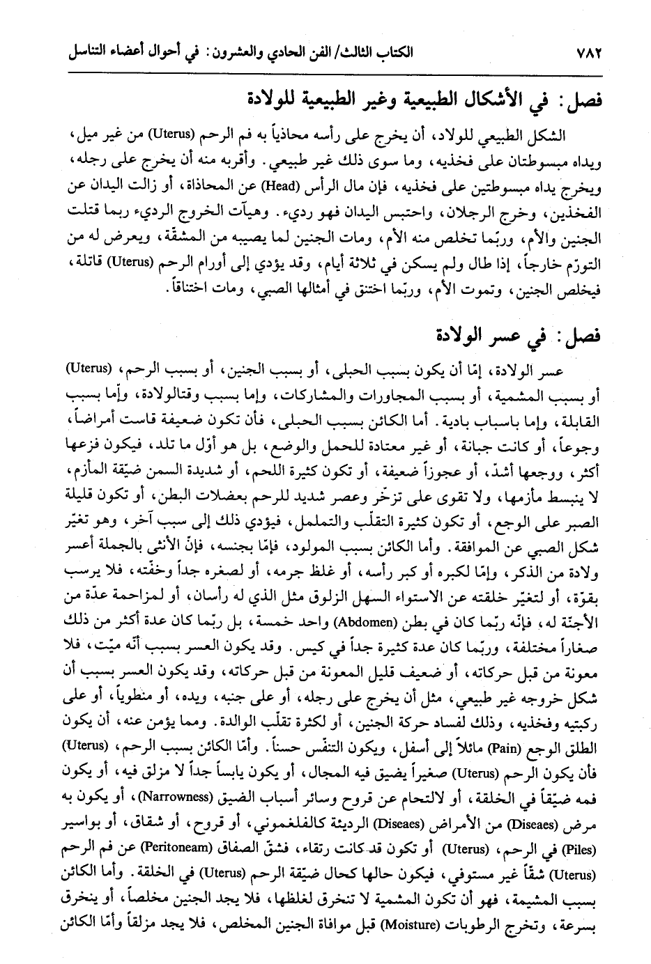 فصل فِي الأشكال الطبيعية وَغير الطبيعية للولادة الشكل الطبيعي للولاد أَن يخرج على رَأسه محاذياَ بِهِ فَم الرَّحِم من غير ميل ويداه مبسوطتان على فَخذيهِ وَمَا سوى ذَلِك غير طبيعي. وأقربه مِنْهُ أَن يخرج على رجله وَيخرج يَدَاهُ مبسوطتين على فَخذيهِ فَإِن مَال الرَّأْس عَن الْمُحَاذَاة أَو زَالَت اليدان عَن الفخذين وَخرج الرّجلَانِ وَاحْتبسَ اليدان فَهُوَ رَدِيء. وهيئات الْخُرُوج الرَّدِيء رُبمَا قتلت الْجَنِين وَالأُم وَرُبمَا تخلص مِنْهُ الْأُم وَمَات الْجَنِين لما يُصِيبهُ من المشقه ويعرض لَهُ من التورم خَارِجا إِذا طَال وَلم يسكن فِي ثَلَاثَة أَيَّام وَقد يُؤَدِّي إِلَى أورام الرَّحِم قاتلة فيخلص الْجَنِين وَتَمُوت الْأُم وَرُبمَا اختنق فِي أَمْثَالهَا الصَّبِي وَمَات اختناقاً.