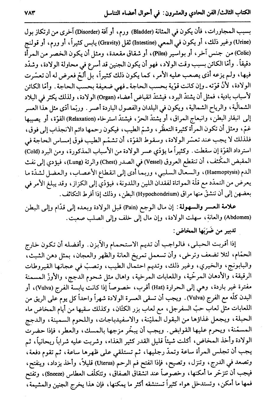 بِسَبَب المجاورات والمشاركات وَإِمَّا بِسَبَب وَقت الْولادَة وَإِمَّا بِسَبَب الْقَابِلَة وَإِمَّا أما الْكَائِن بِسَبَب الحبلى فَأن تكون ضَعِيفَة قاست أمراضاً وجوعاً أَو كَانَت جبانة أَو غير مُعْتَادَة للْحَمْل والوضع بل هُوَ أول مَا تَلد فَيكون فزعها أَكثر ووجعها أَشد أَو عجوزاَ ضَعِيفَة أَو تكون كَثِيرَة اللَّحْم أَو شَدِيدَة السّمن ضيقَة المأزم لَا ينبسظ مأزمها وَلَا تقوى على تزخر وعصر شَدِيد للرحم بعضلات الْبَطن أَو تكون قَليلَة الصَّبْر على الرجع أَو تكون كَثِيرَة التقلب والتململ فَيُؤَدِّي ذَلِك إِلَى سَبَب آخر وَهُوَ تغير شكل الصَّبِي عَن الْمُوَافقَة. وَأما الْكَائِن بِسَبَب الْمَوْلُود فإمَّا بِجِنْسِهِ فَإِن الْأُنْثَى بِالْجُمْلَةِ أعْسر ولادَة من الذّكر وَإِمَّا لكبره أَو كبر رَأسه أَو غلظ جرمه أَو لصغره جدا وَخِفته فَلَا يرسب بِقُوَّة أَو لتغير خلقته عَن الاسْتوَاء السهل الزلوق مثل الَّذِي لَهُ رأسان أَو لمزاحمة عدَّة من الأجنة لَهُ فَإِنَّهُ رُبمَا كَانَ فِي بطن وَاحِد خَمْسَة بل رُبمَا كَانَ عدَّة أَكثر من ذَلِك صغَارًا مُخْتَلفَة وَرُبمَا كَانَ عدَّة كَثِيرَة جدا فِي كيس. وَقد يكون الْعسر بِسَبَب أَنه ميت فَلَا مَعُونَة من قبل حركاته أَو ضَعِيف قَلِيل المعونة من قبل حركاته وَقد يكون الْعسر بِسَبَب أَن شكل خُرُوجه غير طبيعي مثل أَن يخرج على رجله أَو على جنبه وَيَده أَو منطوياً أَو على رُكْبَتَيْهِ وفخذيه وَذَلِكَ لفساد حَرَكَة الْجَنِين أَو لِكَثْرَة تقلب الوالدة. وَمِمَّا يؤمنَ عَنهُ أَن يكون الطلق والوجع مائلاً إِلَى أَسْفَل وَيكون التنفس حسنا. وَأما الْكَائِن بِسَبَب الرَّحِم فَأن يكون الرَّحِم صَغِيرا يضيق فِيهِ المجال أَو يكون يَابسا جدا لَا مزلق فِيهِ أَو يكون فَمه ضيقا جدا فِي الْخلقَة أَو لالتحام عَن قُرُوح وَسَائِر أَسبَاب الضّيق أَو يكون بِهِ مرض من الْأَمْرَاض الرَّديئَة كالفلغموني أَو قُرُوح أَو شقَاق أَو بواسير فِي الرَّحِم أَو تكون قد كَانَت رتقاء فشق الصفاق عَن فَم الرَّحِم شقاً غير مُسْتَوْفِي فَيكون حَالهَا كَحال ضيقَة الرَّحِم فِي الْخلقَة. وَأما الْكَائِن بِسَبَب المشيمة فَهُوَ أَن تكون المشيمة لَا تنخرق لغلظها فَلَا يجد الْجَنِين مخلصاً أَو ينخرق بِسُرْعَة وَتخرج الرطوبات قبل موافاة الْجَنِين المخلص فَلَا يجد مزلقاً. وَأما الْكَائِن بِسَبَب المجاورات فَأن يكون فِي المثانة ورم أَو آفَة أُخْرَى من ارتكاز بَوْل وَغير ذَلِك أَو يكون فِي المعي ثقل يَابِس كثيرا أَو ورم أَو قولنج من جنس آخر أَو بواسير أَو شقَاق مقعدة وَمثل أَن يكون الخصر من الْمَرْأَة دَقِيقًا. وَأما الْكَائِن بِسَبَب وَقت الولاد فَهُوَ أَن يكون الْجَنِين قد أسْرع فِي محاولة الْولادَة وشدد فِيهَا وَلم يزعه أَذَى يصعب عَلَيْهِ الْأَمر كَمَا يكون ذَلِك كثيرا بل ألح فَعرض لَهُ أَن تعسرت الْولادَة لِأَن قوته - وَإِن كَانَت قَوِيَّة بِحَسب الْحَاجة - فَهِيَ ضَعِيفَة بِحَسب الْحَاجة. وَلما الْكَائِن لأسباب بادية فَمثل أَن يشْتَد الْبرد فيشتد انقباض أَعْضَاء الْولادَة وَلذَلِك يكثر فِي الْبِلَاد الشمالية والرياح الشمالية وَيكون فِي الْبلدَانِ والفصول الْبَارِدَة أعْسر. وَرُبمَا أَشد مثل هَذَا الْعسر إِلَى انبقار الْبَطن وانبعاج المراق أَو يشْتَد الْحر فيشتدّ استرخاء الْقُوَّة أَو يُصِيبهَا غم وَمثل أَن تكون الْمَرْأَة كَثِيرَة التعطر وشم الطّيب فَيكون رَحمهَا دَائِم الإنجذاب إِلَى فَوق فَلذَلِك لَا يجب عِنْد تعسر الْولادَة وَسُقُوط الْقُوَّة أَن تشمم الطّيب فَوق إمساس الْحَاجة فِي اسْتِرْدَاد الْقُوَّة إِن سَقَطت. وَكَثِيرًا مَا يُؤَدِّي عسر الْولادَة من الْأَسْبَاب الْمَذْكُورَة وَمن الْبرد المقبض المكثف أَن تَنْقَطِع الْعُرُوق فِي الصَّدْر والرئة فَيُؤَدِّي إِلَى نفث الدَّم والسعال السلبي وَرُبمَا أدّى إِلَى 