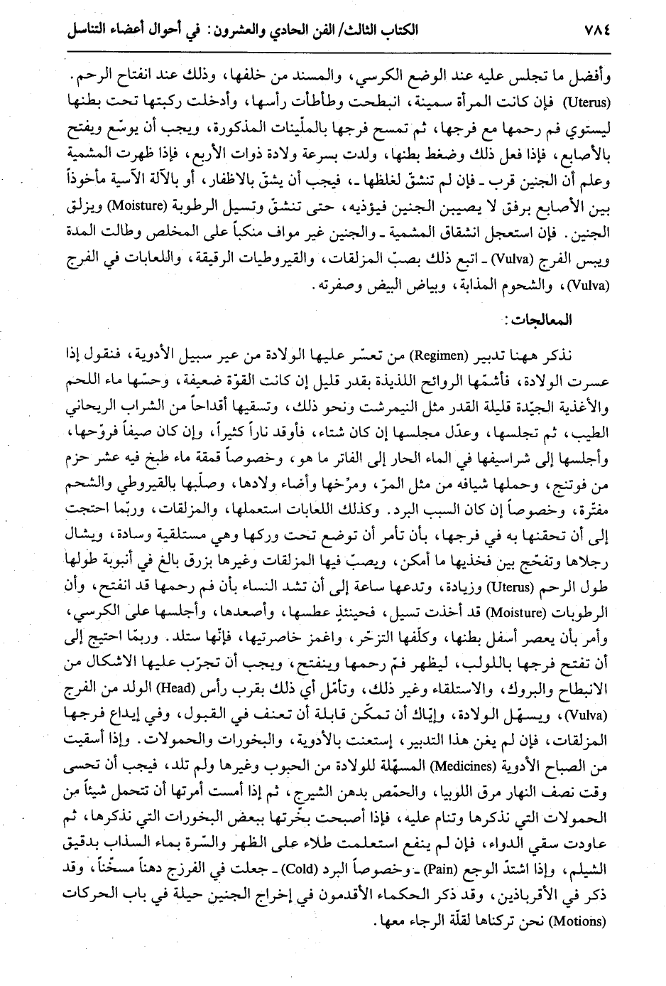 وَأفضل مَا تجْلِس عَلَيْهِ عِنْد الْوَضع الْكُرْسِيّ والمسند من خلفهَا وَذَلِكَ عِنْد انفتاح الرَّحِم. فَإِن كَانَت الْمَرْأَة سَمِينَة انبطحت وطأطأت رَأسهَا وأدخلت ركبتها تَحت بَطنهَا ليستوي فَم رَحمهَا مَعَ فرجهَا ثمَّ تمسح فرجهَا بالملينات الْمَذْكُورَة وَيجب أَن يُوسع وَيفتح بالأصابع فَإِذا فعل ذَلِك وضغط بَطنهَا ولدت بِسُرْعَة ولادَة ذَوَات الْأَرْبَع فَإِذا ظَهرت المشيمة وَعلم أَن الْجَنِين قرب - فَإِن لم تنشقّ لغلظها! فَيجب أَن يشق بالأظفار أَو بالالة الآسية مأخوذاً بَين الْأَصَابِع بِرِفْق لَا يصيبن الْجَنِين فيؤذيه حَتَّى تَنْشَق وتسيل الرُّطُوبَة ويزلق الْجَنِين فَإِن استعجل انْشِقَاق المشيمة - والجنين غير مواف منكبا على المخلص وطالت الْمدَّة ويبس الْفرج - اتبع ذَلِك بصب المزلقات والقيروطيات الرقيقة واللعابات فِي الْفرج والشحوم المذابة وَبَيَاض الْبيض وصفرته. المعا لجات: نذْكر هَهُنَا تَدْبِير من تعسر عَلَيْهَا الْولادَة من غير سَبِيل الْأَدْوِيَة فَنَقُول إِذا عسرت الْولادَة فأشقها الروائح اللذيذة بِقدر قَلِيل إِن كَانَت الْقُوَّة ضَعِيفَة وحسها مَاء اللَّحْم والأغذية الجيدة قَليلَة الْقدر مثل النيمبرشت وَنَحْو ذَلِك وَتَسْقِيهَا أقداحاً من الشَّرَاب الريحاني الطّيب ثمَّ تجلسها وعدّل مجلسها إِن كَانَ شتاء فَأوقد نَارا كثيرا وَإِن كَانَ صيفاً فروحها وأجلسها إِلَى شراسيفها فِي المَاء الْحَار إِلَى الفاتر مَا هُوَ وخصوصاً قمقة مَاء طبخ فِيهِ عشر حزم من فوتنج وَحملهَا شيافة من مثل المر ومرخها وأعضاء ولادها وصلبها بالقيروطي والشحم مفتّرة وخصوصاً إِن كَانَ السَّبَب الْبرد. وَكَذَلِكَ اللعابات استعملها والمزلقات وَرُبمَا احتجت إِلَى أَن تحقنها بِهِ فِي فرجهَا بِأَن تَأمر أَن تُوضَع تَحت وركها وَهِي مستلقية وسَادَة ويشال رجلاها وتفحج بَين فخذيها مَا أمكن وَيصب فِيهَا المزلقات وَغَيرهَا بزرق بَالغ فِي أنبوبة طولهَا طول الرَّحِم وَزِيَادَة وتدعها سَاعَة إِلَى أَن تشهد النِّسَاء بِأَن فَم رَحمهَا قد انْفَتح وَأَن الرطوبات قد أخفت تسيل فَحِينَئِذٍ عطسها وأصعدها وأجلسها على الْكُرْسِيّ وَأمر بِأَن يعصر أَسْفَل بَطنهَا وكلفها التزحر وأغمز خاصرتيها فَإِنَّهَا ستلد. وَرُبمَا احْتِيجَ إِلَى أَن تفتح فرجهَا باللولب ليظْهر فَم رَحمهَا وينفتح وَيجب أَن تجرب عَلَيْهَا الأشكال من الانبطاح والبروك والاستلقاء وَغير ذَلِك وَتَأمل أَي ذَلِك يقرب رَأس الْوَلَد من الْفرج ويسهل الْولادَة وَإِيَّاك أَن تمكّن قَابِلَة أَن تعنف فِي الْقبُول وَفِي إِيدَاع فرجهَا المزلقات فَإِن لم يغن هَذَا التَّدْبِير إستعنت بالأدوية والبخورات والحمولات. وَإِذا أسقيت من الصَّباح الْأَدْوِيَة المسهلة للولادة من الْحُبُوب وَغَيرهَا وَلم تَلد فَيجب أَن تحسى وَقت نصف النَّهَار مرق اللوبيا والحمص بدهن الشيرج ثمَّ إِذا أمست أَمَرتهَا أَن تتحمل شَيْئا من الحمولات الَّتِي نذكرها وتنام عَلَيْهِ فاذا أَصبَحت بخرتها بِبَعْض البخورات الَّتِي نذكرها ثمَّ عاودت سقِِي الدَّوَاء فَإِن لم ينفع اسْتعْملت طلاء على الظّهْر والسرة بِمَاء السذاب بدقيق الشيلم وَإِذا اشتدّ الوجع - وخصوصاً الْبرد - جعلت فِي الفرزج دهناً مسخّناً وَقد ذكر فِي الأقرباذين وَقد ذكر الْحُكَمَاء الأقدمون فِي إِخْرَاج الْجَنِين حِيلَة فِي بَاب الحركات نَحن تركناها لقلَّة الرَّجَاء مَعهَا.
