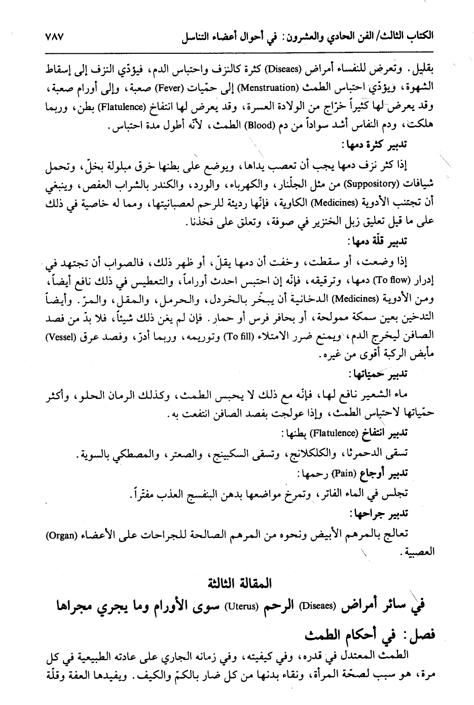 بِقَلِيل. وَتعرض للنفساء أمراض كَثِيرَة كالنزف واحتباس الدَّم فَيُؤَدِّي النزف إِلَى إِسْقَاط الشَّهْوَة وَيُؤَدِّي احتباس الطمث إِلَى حمّيات صعبة والى أورام صعبة وَقد يعرض لَهَا كثيرا خرّاج من الْولادَة الْعسرَة وَقد يعرض لَهَا انتفاخ بطن وَرُبمَا هَلَكت وَدم النّفاس أَشد سواداَ من دم الطمث لِأَنَّهُ أطول مُدَّة احتباس. تَدْبِير كَثْرَة دَمهَا: إِذا كثر نزف دَمهَا يجب أَن تعصب يداها وَيُوضَع على بَطنهَا خرق مبلولة بخل وَتحمل شيافات من مثل الجلنار والكهرباء والورد والكندر بِالشرابِ العفص وَيَنْبَغِي أَن تجتنب الْأَدْوِيَة الكاوية فَإِنَّهَا رَدِيئَة للرحم لعصبانيتها وَمِمَّا لَهُ خاصية فِي ذَلِك على مَا قيل تَعْلِيق زبل الْخِنْزِير فِي صوفة وَتعلق على فَخذهَا. تَدْبِير قلَّة دَمهَا: إِذا وضعت أَو أسقطت وَخفت أَن دَمهَا يقلّ أَو ظهر ذَلِك فَالصَّوَاب أَن تجتهد فِي إدرار دَمهَا وترقيقه فَإِنَّهُ إِن احْتبسَ أحدث أوراماَ والتعطيس فِي ذَلِك نَافِع أَيْضا وَمن الْأَدْوِيَة الدخانية أَن يبخر بالخردل والحرمل والمقل والمر. وَأَيْضًا التدخين بِعَين سَمَكَة مملوحة أَو بحافر فرس أَو حمَار. فَإِن يغن ذَلِك شَيْئا فَلَا بُد من فصد الصَّافِن ليخرج الدَّم وَيمْنَع ضَرَر الامتلاء وتوريمه وَرُبمَا أدر وفصد عرق مأبض الرّكْبَة أقوى من غَيره. تَدْبِير حمّياتها: مَاء الشّعير نَافِع لَهَا فَإِنَّهُ مَعَ ذَلِك لَا يحبس الطمث وَكَذَلِكَ الرُّمَّان الحلو وَأكْثر حمّياتها لاحتباس الطمث وَإِذا عولجت بفصد الصَّافِن انتفعت بِهِ. تَدْبِير انتفاخ بَطنهَا: تسقى الدحمرثا والكلكلانج وتسقى السكبينج والصعتر والمصطكي بِالسَّوِيَّةِ. تَدْبِير أوجاع رَحمهَا: تجْلِس فِي المَاء الفاتر وتمرخ موَاضعهَا بدهن البنفسج العذب مفتراً. تدبيرجراحها: تعالج بالمرهم الْأَبْيَض وَنَحْوه من المراهم الصَّالِحَة للجراحات على الْأَعْضَاء العصبية. سَائِر أمراض الرَّحِم سوى الأورام وَمَا يجْرِي مجْراهَا فصل فِي أَحْكَام الطمث الطمث المعتدل فِي قدره وَفِي كيفيته وَفِي زَمَانه الْجَارِي على عَادَته الطبيعية فِي كل مرّة هُوَ سَبَب لصِحَّة الْمَرْأَة ونقاء بدنهَا من كل ضار بالكمّ والكيف. ويفيدها الْعِفَّة وَقلة