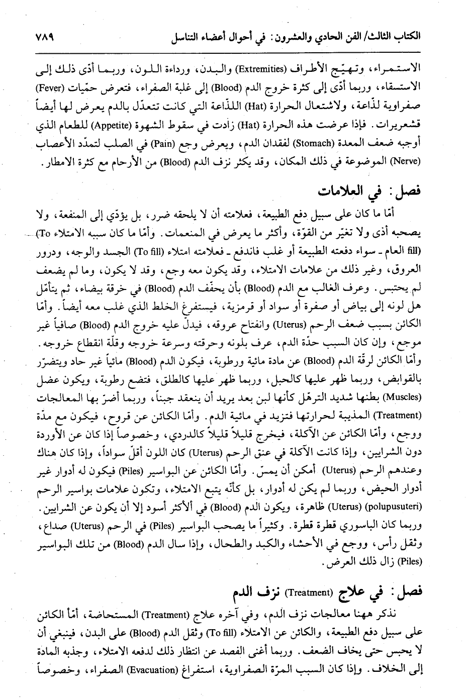 الاستمراء وتهيج الْأَطْرَاف وَالْبدن ورداءة اللَّوْن وَرُبمَا أدّى ذَلِك إِلَى الاسْتِسْقَاء. وَرُبمَا أدّى كَثْرَة خُرُوج الدَّم إِلَى غَلَبَة الصَّفْرَاء فتعرض حميات صفراوية لذاعة والاشتغال الْحَرَارَة اللذاعة الَّتِي كَانَت تتعدل بِالدَّمِ يعرض لَهَا أَيْضا فشعريرات. فَإِذا عرضت هَذِه الْحَرَارَة زَادَت فِي سُقُوط الشَّهْوَة للطعام الَّذِي أوجده ضعف الْمعدة لفقدان الدَّم ويعرض وجع فِي الصلب لتمتد الأعصاب الْمَوْضُوعَة فِي ذَلِك الْمَكَان وَقد يكثر نزف الدَّم من الْأَرْحَام مَعَ كَثْرَة الأمطار. فصل فِي العلامات أما مَا كَانَ على سَبِيل دفع الطبيعة فعلامته أَن لَا يلْحقهُ ضَرَر بل يُؤَدِّي إِلَى الْمَنْفَعَة وَلَا يَصْحَبهُ أَذَى وَلَا تغيّر من الْقُوَّة وَأكْثر مَا يعرض فِي الْمُنَعَّمَاتِ وَأما مَا كَانَ سَببه الامتلاء الْعَام - سَوَاء دَفعته الطبيعة أَو غلب فَانْدفع - فعلامته امتلاء الْجَسَد وَالْوَجْه ودرور الْعُرُوق وَغير ذَلِك من عَلَامَات الامتلاء وَقد يكون مَعَه وجع وَقد لَا يكون وَمَا لم يضعف لم يحتبس. وَيعرف الْغَالِب مَعَ الدَّم بِأَن يجفف الدَّم فِي خرقَة بَيْضَاء ثمَّ يتَأَمَّل هَل لَونه إِلَى بيا. ض أَو صفرَة أَو سَواد أَو قرمزية فيستفرغ الْخَلْط الَّذِي غلب مَعَه أَيْضا وَأما الْكَائِن بِسَبَب ضعف الرَّحِم وانفتاح عروقه فيدلّ عَلَيْهِ خُرُوج الدَّم صافياً غير موجع وَإِن كَانَ السَّبَب حدّة الدَّم عرف بلونه وحرقته وَسُرْعَة خُرُوجه وَقلة انْقِطَاع خُرُوجه. وَأما الْكَائِن لرقة الدَّم عَن مَادَّة مائية ورطوبة فَيكون الدَّم مائياً غير حاد ويتضرّر بالقوابض وَرُبمَا ظهر عَلَيْهَا كالحبل وَرُبمَا ظهر عَلَيْهَا كالطلق فتضع رُطُوبَة وَيكون عضل بَطنهَا شَدِيد الترهل كَأَنَّهَا لبن بعد يُرِيد أَن ينْعَقد جبنا وَرُبمَا أضرّ بهَا المعالجات المذيبة لحرارتها فتزيد فِي مائية الدَّم وَأما الْكَائِن عَن قُرُوح فَيكون مَعَ مدّة ووجع. وَأما الْكَائِن عَن الآكلة فَيخرج قَلِيلا قَلِيلا كالدردي وخصوصاً إِذا كَانَ عَن الأوردة دون الشرايين وَإِذا كَانَت الآكلة فِي عنق الرَّحِم كَانَ اللَّوْن أقل سواداً لماذا كَانَ هُنَاكَ وَعند فَم الرَّحِم أمكن أَن يمس. وَأما الْكَائِن عَن البواسير فَيكون لَهُ أدوار غير أدوار الْحيض وَرُبمَا لم يكن لَهُ بل كَأَنَّهُ يتبع الامتلاء وَتَكون عَلَامَات بواسير الرَّحِم ظَاهِرَة وَيكون الدَّم فِي اللأكثر أسود إِلَّا أَن يكون عَن الشرايين. وَرُبمَا كَانَ الباسوري قَطْرَة قَطْرَة وَكَثِيرًا مَا يصحب البواسير فِي الرَّحِم صداع وَثقل رَأس ووجع فِي الأحشاء والكبد وَالطحَال وَإِذا سَالَ الدَّم من تِلْكَ البواسير زَالَ ذَلِك الْعرض. فصل فِي علاج نزف الدَّم نذْكر هَهُنَا معالجات نزف الدَّم وَفِي آخِره علاج الْمُسْتَحَاضَة أما الْكَائِن على سَبِيل دفع الطبيعة والكائن عَن الامتلاء وَثقل الدَّم على الْبدن فَيَنْبَغِي أَن لَا يحبس حَتَّى يخَاف الضعْف. وَرُبمَا أغْنى الفصد عَن انْتِظَار ذَلِك لدفعه الامتلاء وجذبه الْمَادَّة إِلَى الخَلاف إِذا كَانَ السَّبَب المرّة الصفراوية استفرغ الصَّفْرَاء وخصرصاً