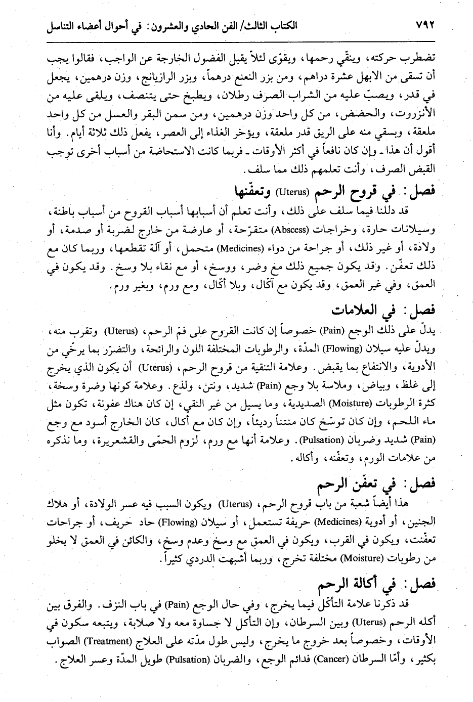 تضطرب حركته وينقّى رَحمهَا ويقوّى لِئَلَّا يقبل الفضول الْخَارِجَة عَن الْوَاجِب فَقَالُوا يجب أَن تسقى من الأبهل عشرَة دَرَاهِم من بزر النعنع درهما وبزر الرازيانج وزن! دِرْهَمَيْنِ يَجْعَل فِي قدر وَيصب عَلَيْهِ من الشَّرَاب الصّرْف رطلان ويطبخ حَتَّى ينتصف ويلقى عَلَيْهِ من الأنزروت والحضض من كل وَاحِد وزن دِرْهَمَيْنِ وَمن سمن الْبَقر وَالْعَسَل من كل وَاحِد ملعقة ويسقى مِنْهُ على الرِّيق قدر ملعقة وَيُؤَخر الْغذَاء إِلَى الْعَصْر يفعل ذَلِك ثَلَاثَة أَيَّام. وَأَنا أَقُول أَن هَذَا - وَإِن كَانَ نَافِعًا فِي أَكثر الاوقات - فَرُبمَا كَانَت الِاسْتِحَاضَة من أَسبَاب أُخْرَى توجب الْقَبْض الصّرْف وَأَنت تعلم ذَلِك مِمَّا سلف. فصل فِي قُرُوح الرَّحِم وتعفنها قد دللنا فِيمَا سلف على ذَلِك وَأَنت تعلم أَن أَسبَابهَا أَسبَاب القروح من أَسبَاب باطنة وسيلانات حارة وخراجات متقرحة أَو عارضة من خَارج لضربة أَو لصدمة أَو ولادَة أَو غير ذَلِك أَو جِرَاحَة من لِوَاء متحمل أَو آلَة تقطعها وَرُبمَا كَانَ مَعَ ذَلِك تعفن. وَقد يكون جَمِيع ذَلِك مَعَ وضر ووسخ أَو مَعَ نقاء بِلَا وسخ. وَقد يكون فِي العمق وَفِي غير العمق وَقد يكون مَعَ آكال وَبلا آكال وَمَعَ ورم وَبِغير ورمٍ. فصل فِي العلامات يدل على ذَلِك الوجع خُصُوصا إِن كَانَت القروح على فَم الرَّحِم وتقرب مِنْهُ ويدلّ عَلَيْهِ سيلان الْمدَّة والرطوبات الْمُخْتَلفَة اللَّوْن والرائحة والتضرر بِمَا يُرْخِي من الْأَدْوِيَة وَالِانْتِفَاع بِمَا يقبض. وعلامة التنقية من قُرُوح الرَّحِم أَن يكون الَّذِي يخرج إِلَى غلظ وَبَيَاض وملاسة بِلَا وجع شَدِيد ونتن ولذع. وعلامة كَونهَا وضرة وسخة كَثْرَة الرطوبات الصديدية وَمَا يسيل من غير النقي إِن كَانَ هُنَاكَ عفونةَ تكون مثل مَاء اللَّحْم وَإِن كَانَ توسخ كَانَ منتناً رديئاً وَإِن كَانَ مَعَ آكال كَانَ الْخَارِج أسود مَعَ وجع شَدِيد وضربان. وعلامة أَنَّهَا مَعَ ورم لُزُوم الْحمى والقشعريرة وَمَا نذكرهُ من عَلَامَات الورم وتعفنه وأكاله. فصل فِي تعفن الرَّحِم هَذَا أيضاَ شُعْبَة من بَاب قُرُوح الرَّحِم وَيكون السَّبَب فِيهِ عسر الْولادَة أَو هَلَاك الْجَنِين أَو أدوية حريفة تسْتَعْمل أَو سيلان حاد حريف أَو جراحات تعفنت وَيكون فِي الْقرب وَيكون فِي العمق مَعَ وسخ وَعدم وسخ والكائن فِي العمق لَا يَخْلُو من رطوبات مُخْتَلفَة تخرج وَرُبمَا أشبهت الدردي كثيرا. فصل فِي أكالة الرَّحِم قد ذكرنَا عَلامَة التأكل فِيمَا يخرج وَفِي حَال الوجع فِي بَاب النزف. وَالْفرق بَين أَكلَة الرَّحِم وَبَين السرطان إِن التأكل لَا جساوة مَعَه وَلَا صلابة ويتبعه سُكُون فِي الْأَوْقَات وخصوصاً بعد خُرُوج مَا يخرج وَلَيْسَ طول مدّته على العلاج الصَّوَاب بِكَثِير وَأما. السرطان فدائم الوجع والضربان طَوِيل الْمدَّة وعسر العلاج.