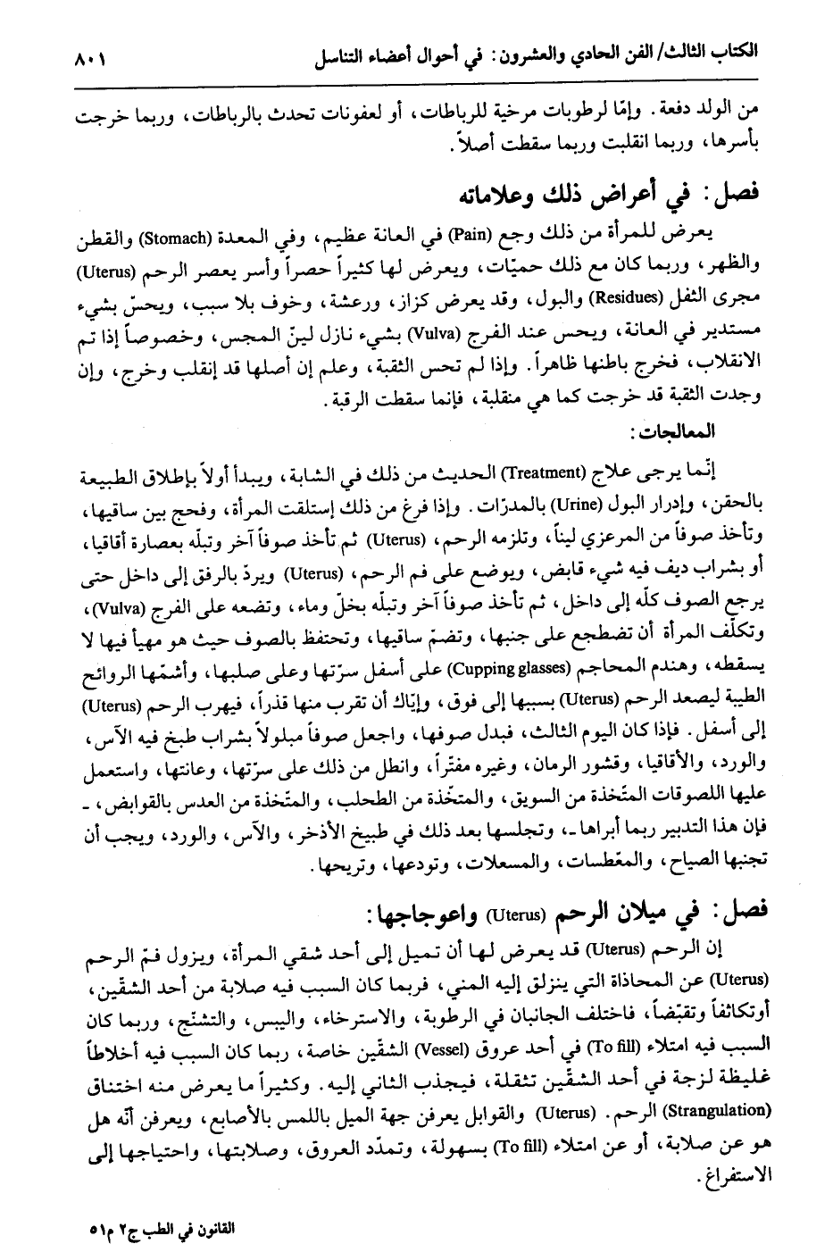 من الْوَلَد دفْعَة. وَإِمَّا لرطوبات مرخية للرباطات أَو لعفونات تحدث بالرباطات وَرُبمَا خرجت بأسرها وَرُبمَا انقلبت وَرُبمَا سَقَطت أصلا. فصل فِي أَعْرَاض ذَلِك وعلاماته يعرض للْمَرْأَة من ذَلِك وجع فِي الْعَانَة عَظِيم وَفِي الْمعدة والقطن وَالظّهْر وَرُبمَا كَانَ مَعَ ذَلِك حمّيات ويعرض لَهَا كثيرا حصر وَأسر يعصر الرَّحِم مجْرى الثفل وَالْبَوْل وَقد يعرض كزاز ورعشة وَخَوف بِلَا سَبَب ويحسّ بِشَيْء مستدير فِي الْعَانَة ويحس عِنْد الْفرج بِشَيْء نَازل ليّن المجس وخصوصاً إِذا تمّ الانقلاب فَخرج بَاطِنهَا ظَاهرا. وَإِذا لم تحس الثقبة وَعلم إِن أَصْلهَا قد إنقلب وَخرج وَإِن وجدت الثقبة قد خرجت كَمَا هِيَ غير منقلبة فَإِنَّمَا سَقَطت الرَّقَبَة. المعالجات إِنَّمَا يرجي علاج الحَدِيث من ذَلِك فِي الشَّابَّة وَيبدأ أَولا بِإِطْلَاق الطبيعة بالحقن وإدرار الْبَوْل بالمدرات. وَإِذا فرغ من ذَلِك إستلقت الْمَرْأَة وفحج بَين سَاقيهَا وَتَأْخُذ صُوفًا من المرعزي لينًا وَتلْزَمهُ الرَّحِم ثمَّ تَأْخُذ صُوفًا اَخر وتبله بعصارة أقاقيا أَو بشراب ديف فِيهِ شَيْء قَابض وَيُوضَع على فَم الرَّحِم ويردّ بالرفق إِلَى دَاخل حَتَّى يرجع الصُّوف كُله إِلَى دَاخل ثمَّ تَأْخُذ صُوفًا آخر وتبله بخلّ وَمَاء وتضعه على الْفرج وتكلف الْمَرْأَة أَن تضطجع على جنبها وتضم سَاقيهَا وتحتفظ بالصوف حَيْثُ هُوَ مُهَيَّأ فِيهَا لَا يسْقطهُ وهندم المحاجم على أَسْفَل سرتها وعَلى صلبها وأشمها الروائح الطّيبَة ليصعد الرَّحِم بِسَبَبِهَا إِلَى فَوق وَإِيَّاك أَن تقرب مِنْهَا قذراً فيهرب الرَّحِم إِلَى أَسْفَل. فَإِذا كَانَ الْيَوْم الثَّالِث فبدل صوفها وَاجعَل صُوفًا مبلولاً بشراب طبخ فِيهِ الآس والورد والأقاقيا وقشور الرُّمَّان وَغَيره مفتراً وانطل من ذَلِك على سرّتها وعانتها وَاسْتعْمل عَلَيْهَا اللصوقات المتخذة من السويق والمتخذة من الطحلب والمتخذة من العدس بالقوابض - فَإِن هَذَا التَّدْبِير رُبمَا أبرأها وتجلسها بعد ذَلِك فِي طبيخ الأذخر والآس والورد وَيجب أَن تجنبها الصياح والمعطّسات والمسعلات وتودعها وتريحها. فصل فِي ميلان الرَّحِم واعوجاجها إِن الرَّحِم قد يعرض لَهَا أَن تميل إِلَى أحد شقي الْمَرْأَة وَيَزُول فَم الرَّحِم عَن الْمُحَاذَاة الَّتِي ينزلق إِلَيْهِ الْمَنِيّ فَرُبمَا كَانَ السَّبَب فِيهِ صلابة من أحد الشقين أَو تكاثفاً وتقبّضاً فَاخْتلف الجانبان فِي الرُّطُوبَة والسصترخاء واليبس والتشتج وَرُبمَا كَانَ السَّبَب فِيهِ امتلاء فِي أحد عروق الشقين خَاصَّة وَرُبمَا كَانَ السَّبَب فِيهِ أخلاطاً غَلِيظَة لزجة فِي أحط الشقين تثقله فيجذب الثَّانِي إِلَيْهِ. وَكَثِيرًا مَا يعرض مِنْهُ اختناق الرَّحِم. والقوابل يعرفن جِهَة الْميل باللمس بالأصابع ويعرفن أَنه هَل هُوَ عَن صلابة أَو عَن امتلاء بسهولة وتمدّد الْعُرُوق وصلابتها واحتياجها إِلَى الاستفراغ.