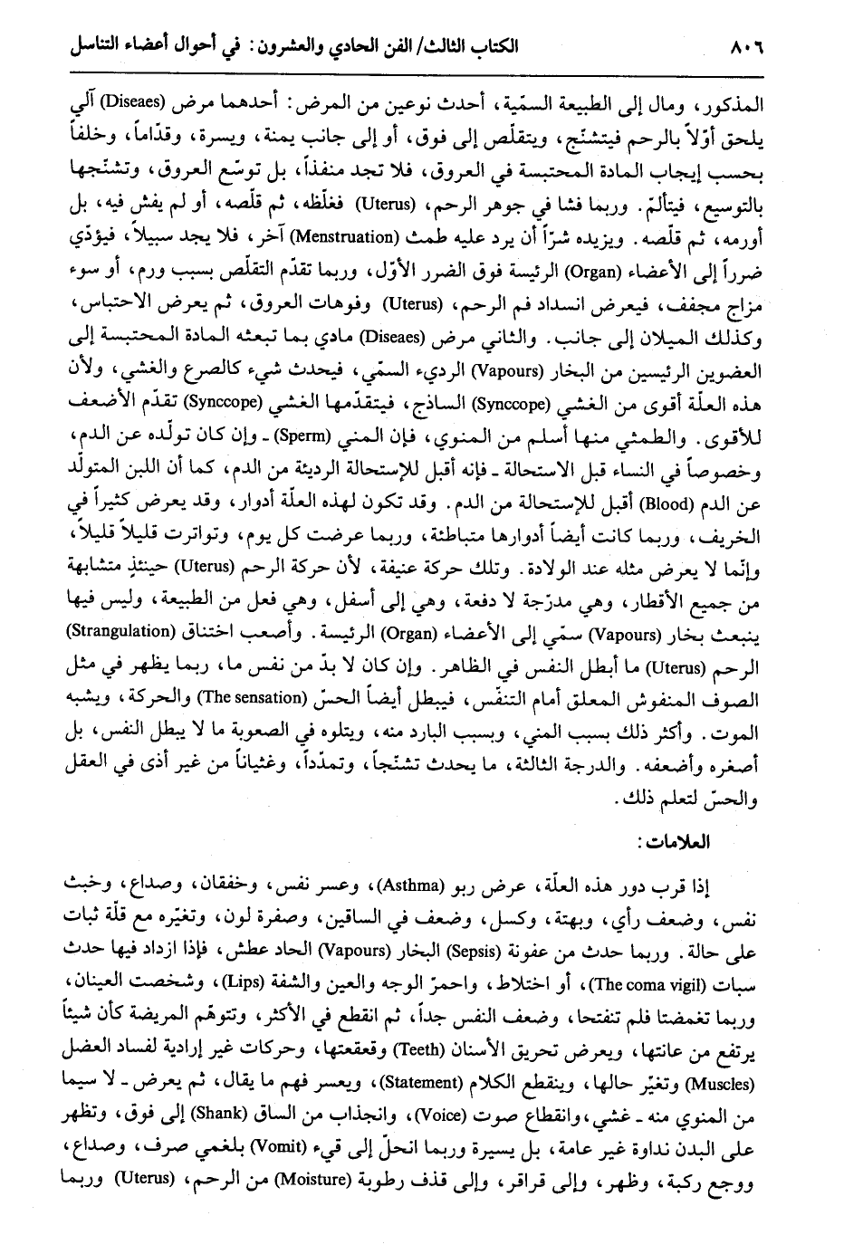 الْمَذْكُور وَمَال إِلَى الطبيعة السمّية أحدث نَوْعَيْنِ من الْمَرَض: أَحدهمَا: مرض آلي يلْحق أَولا بالرحم فيتشنج ويتقلّص إِلَى فَوق أَو إِلَى جَانب يمنة ويسرة وقدّاماً وخلفاً بِحَسب إِيجَاب الْمَادَّة المحتبسة فِي الْعُرُوق فَلَا تَجِد منفذاً بل توسع الْعُرُوق وتشنّجها بالتوسيع فيتألم. وَرُبمَا فَشَا فِي جَوْهَر الرَّحِم فغلّظه ثمَّ قلصه أَو لم يفش فِيهِ بل أورمه ثمَّ قلصه. ويزيده شرا أَن يرد عَلَيْهِ طمث آخر فَلَا يجد سَبِيلا فَيُؤَدِّي ضَرَرا إِلَى الْأَعْضَاء الرئيسة فَوق الضَّرَر الأول وَرُبمَا تقدم التقلص بِسَبَب ورم أَو سوء مزاج مجفف فَيعرض انسداد فَم الرَّحِم وفوهات الْعُرُوق ثمَّ يعرض الاحتباس وَكَذَلِكَ الميلان إِلَى جَانب. وَالثَّانِي: مرض مادي بِمَا تبعثه الْمَادَّة المحتبسة إِلَى العضوين الرئيسين من البخار الرَّدِيء السمي فَيحدث شَيْء كالصرع والغشي وَلِأَن هَذِه الْعلَّة أقوى من الغشي الساذج فيتقدمها الغشي تقدم الأضعف للاقوى. والطمثي مِنْهَا أسلم من الْمَنوِي فَإِن الْمَنِيّ - لمان كَانَ تولده عَن الدَّم وخصوصاً فِي النِّسَاء قبل الاستحالة - فَإِنَّهُ أقبل للإستحالة الرَّديئَة من الدَّم كَمَا أَن اللَّبن الْمُتَوَلد عَن الدَّم أقبل للإستحالة من الدَّم. وَقد تكون لهَذِهِ الْعلَّة أدوار وَقد يعرض كثيراَ فِي الخريف وَرُبمَا كَانَت أَيْضا أدوارها متباطئة وَرُبمَا عرضت كل يَوْم وتواترت قليلاٌ قَلِيلا وَإِنَّمَا لَا يعرض مثله عِنْد الْولادَة. وَتلك حَرَكَة عنيفة لِأَن حَرَكَة الرَّحِم حِينَئِذٍ متشابهة من جَمِيع الأقطار وَهِي مدرّجة لَا دفْعَة وَهِي إِلَى أَسْفَل وَهِي فعل من الطبيعة وَلَيْسَ فِيهَا ينبعث بخار سمي إِلَى الْأَعْضَاء الرئيسة. وأصعب اختناق الرَّحِم مَا أبطل النَّفس فِي الظَّاهِر. وَإِن كَانَ لَا بُد من نفس مَا رُبمَا يظْهر فِي مثل الصُّوف المنفوش الْمُعَلق أَمَام التنفس فَيبْطل أَيْضا الْحس وَالْحَرَكَة وَيُشبه الْمَوْت. وَأكْثر ذَلِك بِسَبَب الْمَنِيّ وبسبب الْبَارِد مِنْهُ ويتلوه فِي الصعوبة مَا لَا يبطل النَّفس بل أصغره وأضعفه والدرجة الثَّالِثَة مَا يحدث تشئجاً وتمدداً وغثياناً من غير أَذَى فِي الْعقل والحس لتعلم ذَلِك. العلامات: إِذا قرب دور هَذِه الْعلَّة عرض ربو وعسر نفس وخفقان وصداع وخبث نفس وَضعف رَأْي وبهتة وكسل وَضعف فِي السَّاقَيْن وصفرة لون وتغيره مَعَ قلَّة ثبات على حَالَة. وَرُبمَا حدث من عفونة البخار الحاد عَطش فَإِذا ازْدَادَ فِيهَا حدث سبات أَو اخْتِلَاط واحمر الْوَجْه وَالْعين والشفة وشخصت العينان وَرُبمَا تغمضتا فَلم تنفتحا وَضعف النَّفس جدا ثمَّ انْقَطع فِي. الْأَكْثَر وتتوهّم الْمَرِيضَة كَأَن شَيْئا يرْتَفع من عانتها ويعرض تحريق الْأَسْنَان وقعقعتها وحركات غير إرادية لفساد العضل وَتغَير حَالهَا وَيَنْقَطِع الْكَلَام ويعسر فهم مَا يُقَال ثمَّ يعرض - لَا سِيمَا من الْمَنوِي مِنْهُ - غشي وَانْقِطَاع صَوت وانجذاب من السَّاق إِلَى فَوق وَتظهر على الْبدن نداوة غير عَامَّة بل يسيرَة وَرُبمَا انحل إِلَى قيء بلغمي صرف وصداع ووجع ركبة وَظهر والى قراقر وَإِلَى قذف رُطُوبَة من الرَّحِم وَرُبمَا