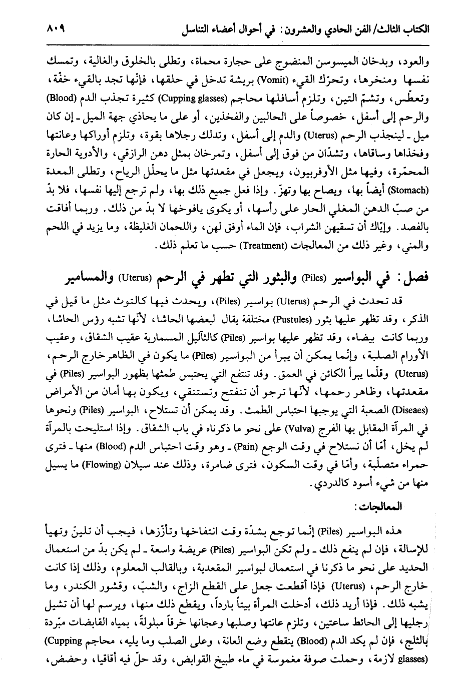 وَالْعود وبدخان الميسوسن المنضوج على حِجَارَة محماة وتطلى بالخلوق والغالية وَتمسك نَفسهَا ومنخرها وتحرك الْقَيْء بريشة تدخل فِي حلقها فَإِنَّهَا تَجِد بالقيء خفَّة وتعطس وتشم التِّين وَتلْزم أسافلها محاجم كَثِيرَة تجذب الدَّم وَالرحم إِلَى أَسْفَل خُصُوصا على الحالبين والفخذين أَو على مَا يُحَاذِي جِهَة الْميل - إِن كَانَ ميل - لينجذب الرَّحِم وَالدَّم إِلَى أَسْفَل وتدلك رجلاها بِقُوَّة وَتلْزم أوراكها وعانتها وفخذاها وساقاها وتشدّان من فَوق إِلَى أَسْفَل وتمرخان بِمثل دهن الرازقي والأدوية الحارة المحمّرة وفيهَا مثل الأوفربيون وَيجْعَل فِي مقعدتها مثل مَا يحلل الرِّيَاح وتطلى الْمعدة أَيْضا بهَا ويصاح بهَا وتهز. وَإِذا فعل جَمِيع ذَلِك بهَا وَلم ترجع إِلَيْهَا نَفسهَا فَلَا بُد من صبّ الدّهن المغلي الْحَار على رَأسهَا أَو يكوى يافوخها لَا بُد من ذَلِك. وَرُبمَا أفاقت بالفصد وَإِيَّاك أَن تسقيهن الشَّرَاب فَإِن المَاء أوفق لَهُنَّ واللحمان الغليظة وَمَا يزِيد فِي اللَّحْم والمني وَغير ذَلِك من المعالجات حسب مَا تعلم ذَلِك. فصل فِي البواسير والتوث والبثور الَّتِي تظهر فِي الرَّحِم والمسامير قد تحدث فِي الرَّحِم بواسير وَيحدث فِيهَا كالتوث مثل مَا قيل فِي الذّكر وَقد تظهر عَلَيْهَا بثور مُخْتَلفَة يُقَال لبعضها الحاشا لِأَنَّهَا - لشبه رُؤُوس الحاشا وَرُبمَا كَانَت بَيْضَاء وَقد تظهر عَلَيْهَا بواسير كالثآليل المسمارية عقيب الشقاق وعقيب الأورام الصلبة وَإِنَّمَا يُمكن أَن يبرأ من البواسير مَا يكون فِي الظَّاهِر خَارج الرَّحِم وقلّما يبرأ الْكَائِن فِي العمق. وَقد تنْتَفع الَّتِي يحتبس طمثها بِظُهُور البواسير فِي مقعدتها وَظَاهر رَحمهَا لِأَنَّهَا ترجو أَن تنفتح وتستنقي وَيكون بهَا أَمَان من الْأَمْرَاض الصعبة الَّتِي يُوجِبهَا احتباس الطمث. وَقد يُمكن أَن تستلاح البواسير وَنَحْوهَا فِي الْمرْآة الْمُقَابل بهَا الْفرج على نَحْو مَا ذَكرْنَاهُ فِي بَاب الشقاق. وَإِذا استليحت بِالْمَرْأَةِ لم يخل أما أَن تستلاح فِي وَقت الوجع - وَهُوَ وَقت احتباس الدَّم مِنْهَا - فترى حَمْرَاء متصلبة وَأما فِي وَقت السّكُون فترى ضامرة وَذَلِكَ عِنْد سيلان مَا يسيل مِنْهَا من شَيْء أسود كالدردي. المعالجات: هَذ البواسير إِنَّمَا توجع بِشدَّة وَقت انتفاخها وتأززها فَيجب أَن تليّن وتهيأ للإسالة فَإِن لم ينفع ذَلِك - وَلم تكن البواسير عريضة وَاسِعَة - لم يكن بُد من اسْتِعْمَال الْحَدِيد على نَحْو مَا ذكرنَا فِي اسْتِعْمَال البواسير المقعمية وبالقالب الْمَعْلُوم وَذَلِكَ إِذا كَانَت خَارج الرَّحِم فَإِذا أقطعت جعل على الْقطع الزاج والشب وقشور الكندر وَمَا يشبه ذَلِك. فَإِذا أُرِيد ذَلِك أدخلت الْمَرْأَة بيتاَ بَارِدًا وَيقطع ذَلِك مِنْهَا ويرسم لَهَا أَن تشيل رِجْلَيْهَا إِلَى الْحَائِط ساعتين وَتلْزم عانتها وصلبها وعجانها خرقاً مبلولةً بمياه القابضات مبردة بالثلج فَإِن لم يكد الدَّم يَنْقَطِع وضع على الْعَانَة وعَلى الصلب وَمَا يَلِيهِ محاجم لَازِمَة وحملت صوفة مغموسة فِي مَاء طبيخ القوابض وَقد حل فِيهِ أقاقيا وحضض