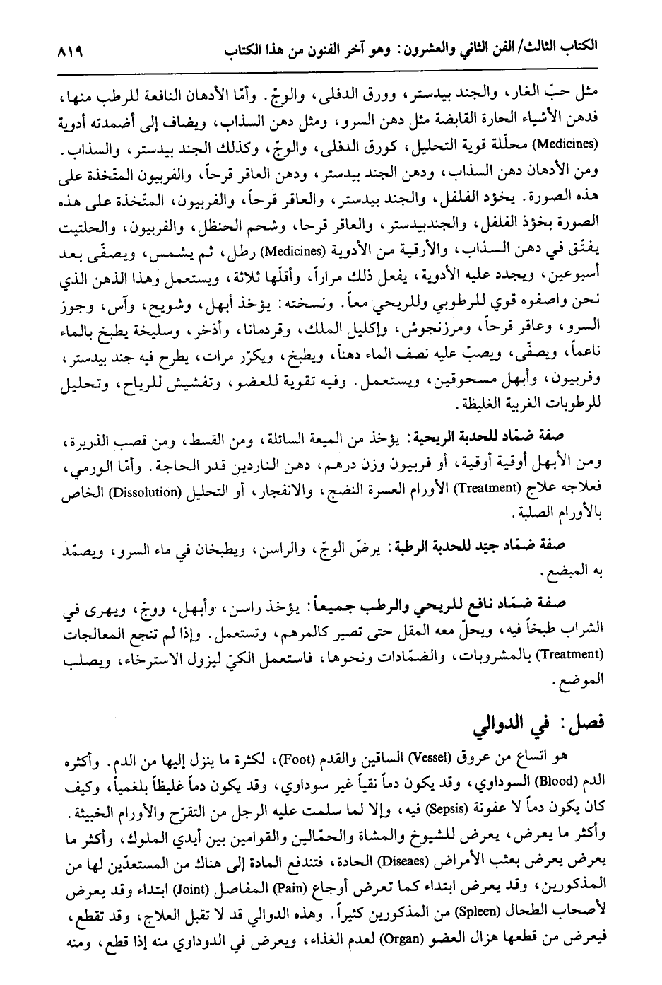 مثل حبّ الْغَار والجندبيدستر وورق الدفلى والوج. وَأما الأدهان النافعة للرطب مِنْهَا فدهن الْأَشْيَاء الحارة القابضة مثل دهن السرو وَمثل دهن السذاب ويضاف إِلَى أضمدته أدوية محلّلة قَوِيَّة التَّحْلِيل كورق الدفلى والوج وَكَذَلِكَ الجندبيدستر والسذاب. وَمن الأدهان دهن السذاب ودهن الجندبيدستر ودهن العاقرقرحا والفربيون المتخذة على هَذِه الصُّورَة. يُؤْخَذ الفلفل والجندبيدستر والعاقرقرحا وشحم الحنظل والفربيون والحلتيت يفتق فِي دهن السذاب وللأوقية من الْأَدْوِيَة رَطْل ثمَّ يشمس ويصفى بعد أسبوعين ويجدد عَلَيْهِ الْأَدْوِيَة يفعل ذَلِك مرَارًا وأقلها ثَلَاثَة وَيسْتَعْمل. وَهَذَا الدّهن الَّذِي نَحن واصفوه قوي للرطوبي وللريحي معأ. ونسخته: يُؤْخَذ أبهل شويح وآس وَجوز السرو وعاقرقرحا ومرزنجوش وإكليل الْملك وقردمانا وإذخر وسليخة يطْبخ بِالْمَاءِ نَاعِمًا ويصفّى وَيصب عَلَيْهِ نصف المَاء دهناً ويطبخ يُكَرر مَرَّات يطْرَح فِيهِ جندبيدستر وفربيون وأبهل مسحوقين وَيسْتَعْمل. وَفِيه تَقْوِيَة للعضو وتفشيش للرياح وَتَحْلِيل للرطوبات الغريبة الغليظة. صفة ضمّاد للحدبة الريحية: يُؤْخَذ من الميعة السائلة وَمن الْقسْط وَمن قصب الفريرة وَمن الأبهل أُوقِيَّة أُوقِيَّة أَو فربيون وزن دِرْهَم دهن الناردين قدر الْحَاجة. وَأما الورمي فعلاجه علاج الأورام الْعسرَة النضج والانفجار أَو التَّحْلِيل الْخَاص بالأورام الصلبة. صفة ضماد جيد للحدبة الرّطبَة: يرض الوج والراسن ويطبخان فِي مَاء السرو ويضمد بِهِ المبضع. صفة ضماد ناف للريحي وَالرّطب جَمِيعًا: يُؤْخَذ راسن وأبهل وَوَج ويهرى فِي الشَّرَاب طبخاً فِيهِ ويحلّ مَعَه الْمقل حَتَّى تصير كالمرهم وتستعمل. وَإِذا لم تنجع المعالجات بالمشروبات والضمّادات وَنَحْوهَا فَاسْتعْمل الكيّ ليزول الاسترخاء ويصلب الْموضع. فصل فِي الدوالي: هُوَ اتساع من عروق السَّاقَيْن والقدم لِكَثْرَة مَا ينزل إِلَيْهَا من الدَّم. وكثره الدَّم السوداوي وَقد يكون دَمًا نقياً غير سوداوي وَقد يكون دَمًا غليظاً بلغمياَ وَكَيف كَانَ يكون دَمًا لَا عفونة فِيهِ وَإِلَّا لما سلمت عَلَيْهِ الرجل من التقرح والأورام الخبيثة. وَأكْثر مَا يعرض يعرض للشيوخ والمشاة والحمالين والقوامين بَين أَيدي الْمُلُوك وَأكْثر مَا يعرض يعرض بعثب الْأَمْرَاض الحادة فتندفع الْمَادَّة إِلَى هُنَاكَ من المستعدين لَهَا من الْمَذْكُورين وَقد يعرض ابْتِدَاء كَمَا تعرض أوجاع المفاصل ابْتِدَاء. وَقد يعرض لأَصْحَاب الطحال من الْمَذْكُورين كثيرا. وَهَذِه الدوالي قد لَا تقبل العلاج وَقد ثقطع فَيعرض من قطعهَا هزال الْعُضْو لعدم سواقي الْغذَاء ويعرض فِي الدوالي مِنْهُ إِذا قطع وَمِنْه