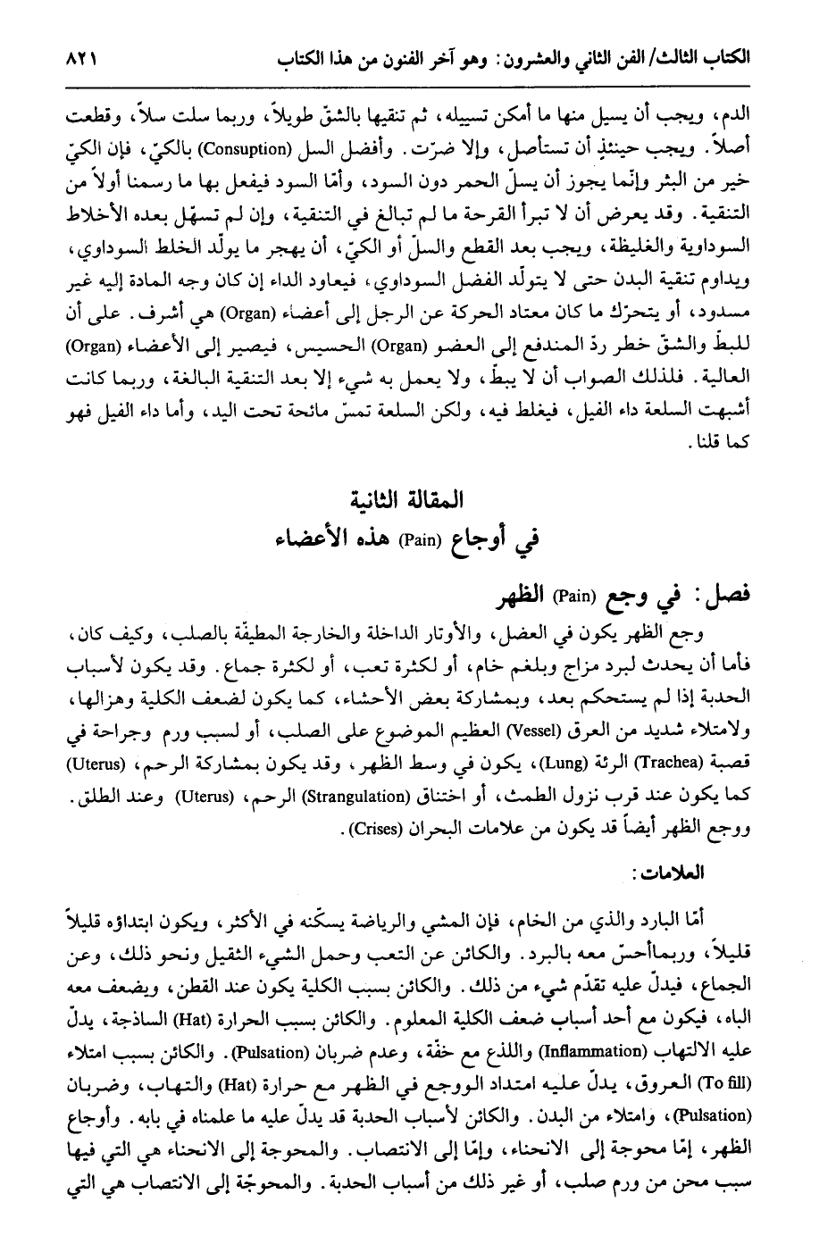 الدَّم وَيجب أَن يسيل مِنْهَا مَا أمكن تسييله ثمَّ تنقيها بالشق طَويلا وَرُبمَا سلت سلا وفطعت أصلا. وَيجب حيمئذ أَن تستأصل وَإِلَّا ضرت. وَأفضل السل بالكي فَإِن الكي خير من البثر وَإِنَّمَا يجوز أَن يسل الْحمر دون السود وَأما السود فيفعل بهَا مَا رسمنا أَولا من التنقية. وَقد يعرض أَن لَا تَبرأ القرحة مَا لم تبالغ فِي التنقية وَإِن لم تسهل بعده الأخلاط السوداوية والغليظة وَيجب بعد الْقطع والسل أَو الكيّ أَن يهجر مَا يُولد الْخَلْط السوداوي ويداوم تنقية الْبدن حَتَّى لَا يتَوَلَّد الْفضل السوداوي فيعاود المَاء إِن كَانَ وَجه الْمَادَّة إِلَيْهِ غير مسدود أَو يَتَحَرَّك مَا كَانَ مُعْتَاد الْحَرَكَة عَن الرجل إِلَى أَعْضَاء هِيَ أشرف على أَن للبط والشق خطر رد المندفع إِلَى الْعُضْو الحسيس فَيصير إِلَى الْأَعْضَاء الْعَالِيَة. فَلذَلِك الصَّوَاب أَن لَا يبط وَلَا يعْمل بِهِ شَيْء إِلَّا بعد التنقية الْبَالِغَة وَرُبمَا كَانَت أشبهت السّلْعَة دَاء الْفِيل فيغلط فِيهِ وَلَكِن السّلْعَة تمس مائحة تَحت الْيَد وَأما دَاء الْفِيل فَهُوَ كَمَا قُلْنَا. أوجاع هَذِه الْأَعْضَاء فصل فِي وجع الظّهْر: وجع الظّهْر يكون فِي العضل والأوتار الدَّاخِلَة والخارجة المطيفة بالصلب. وَكَيف كَانَ فَأَما أَن يحدث لبرد مزاج وبلغم خام أَو لِكَثْرَة تَعب أَو لِكَثْرَة جماع. وَقد يكون لأسباب الحمية إِذا لم يستحكم بعد وبمشاركة بعض الأحشاء كَمَا يكون لضعف الْكُلية وهزالها ولامتلاء شَدِيد من الْعرق الْعَظِيم الْمَوْضُوع على الصلب أَو لسَبَب ورم وجراحة فِي قَصَبَة الرئة وَيكون فِي وسط الظّهْر وَقد يكون بمشاركة الرَّحِم كَمَا يكون عِنْد قرب نزُول الطمث أَو اختناق الرَّحِم وَعند الطلق. ووجع الظّهْر أَيْضا قد يكوق من عَلَامَات البحران. العلامات: أما الْبَارِد وَالَّذِي من الخام فَإِن الْمَشْي والرياضة يسكنهُ فِي الْأَكْثَر وَيكون ابتداؤه قَلِيلا قَلِيلا وَرُبمَا أحس مَعَه بالبرد. والكائن عَن التَّعَب وَحمل الشَّيْء الثقيل وَنَحْو ذَلِك وَعَن الْجِمَاع فَيدل عَلَيْهِ تقدم شَيْء من ذَلِك. والكائن بِسَبَب الْكُلية يكن عِنْد الْقطن ويضعف مَعَه الباه فَيكون مَعَ أحد أَسبَاب ضعف الْكُلية الْمَعْلُوم. والكائن بِسَبَب الْحَرَارَة الساذجة يدل عَلَيْهِ الالتهاب واللذع مَعَ خفَّة وَعدم ضَرْبَان. والكائن بِسَبَب امتلاء الْعُرُوق يدل عَلَيْهِ امتداد الوجع فِي الظّهْر مَعَ حرارة والتهاب وضربان وامتلاء من الْبدن. والكائن لأسباب الحدبة قد يدل عَلَيْهِ مَا علمناه فِي بَابه. وأوجاع الظّهْر إِمَّا محوجة إِلَى الانحناء وَإِمَّا إِلَى الانتصاب. والمحوجة إِلَى الانحناء هِيَ الَّتِي فِيهَا سَبَب محن من ورم صلب أَو غير ذَلِك من أَسبَاب الحدبة. والمحوجة إِلَى الانتصاب هِيَ الَّتِي