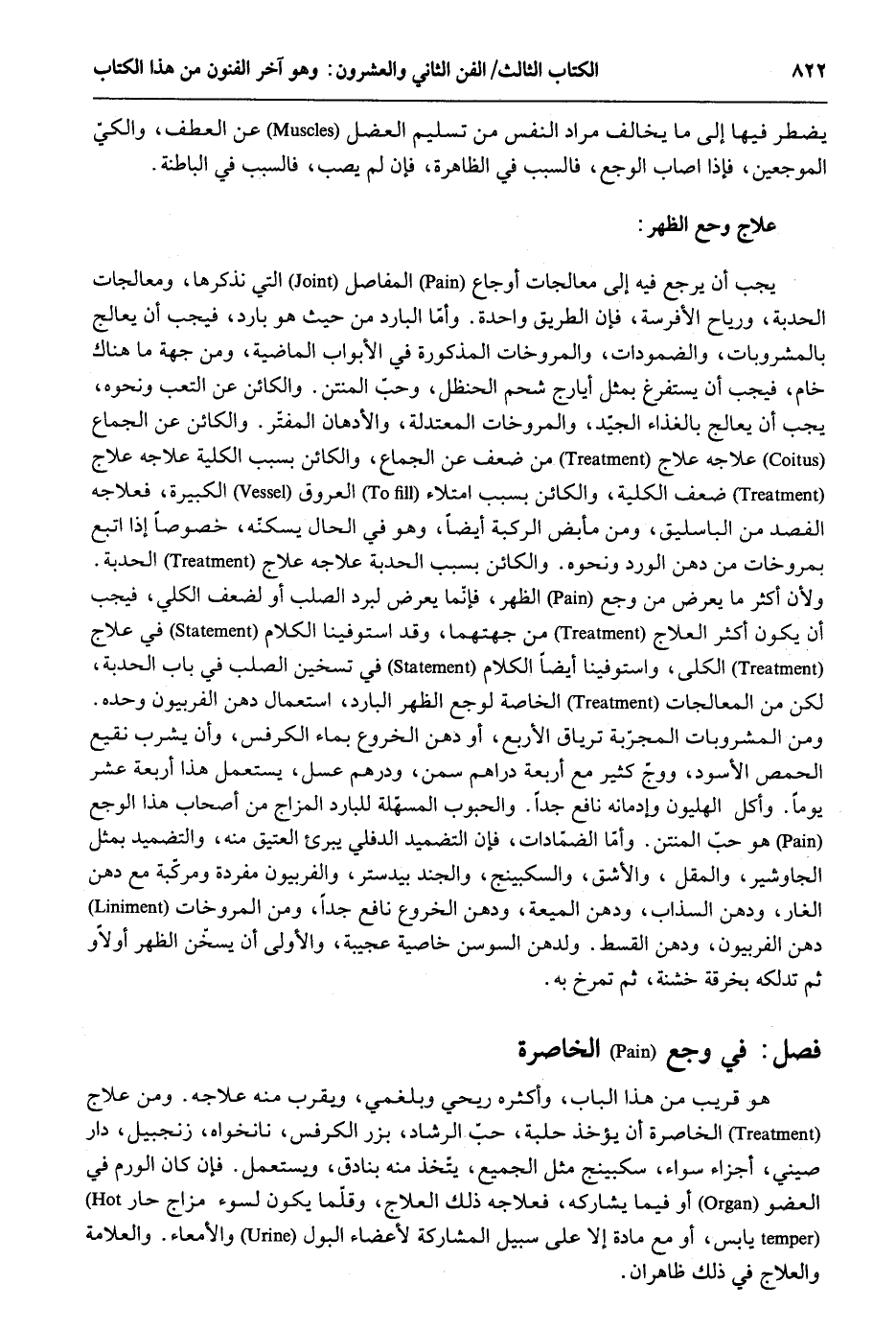 يضْطَر فِيهَا إِلَى مَا يُخَالف مواد النَّفس من تَسْلِيم العضل عَن الْعَطف والكي الموجعين فَإِذا أصَاب الوجع فالسبب فِي الظَّاهِرَة فَإِن لم يصب فالسبب فِي الْبَاطِنَة. علاج وجع الظّهْر: يجب أَن يرجع فِيهِ إِلَى معالجات أوجاع المفاصل الَّتِي نذكرها ومعالجات الحدبة ورياح الأفرسة فَإِن الطَّرِيق وَاحِدَة. وَأما الْبَارِد من حَيْثُ هُوَ بَارِد فَيجب أَن يعالج بالمشروبات والضمودات والمروخات الْمَذْكُورَة فِي الْأَبْوَاب الْمَاضِيَة وَمن جِهَة مَا هُنَاكَ خام فَيجب أَن يستفرغ بِمثل أيارج شَحم الحنظل وَحب المنتن والكائن عَن التَّعَب وَنَحْوه يجب أَن يعالج بالغذاء الْجيد والمروخات المعتدلة والأدهان المفترة. والكائن عَن الْجِمَاع علاجه علاج من ضعف عَن الْجِمَاع والكائن بِسَبَب الْكُلية علاجه علاج ضعف الْكُلية والكائن بِسَبَب امتلاء الْعُرُوق الْكَبِيرَة فعلاجه الفصد من الباسليق وَمن مأبض المركبة أَيْضا وَهُوَ فِي الْحَال يسكنهُ خُصُوصا إِذا اتبع بمروخات من دهن الْورْد وَنَحْوه. والكائن بِسَبَب الحدبة علاجه علاج الحدبة. وَلِأَن أَكثر مَا يعرض من وجع الظّهْر فَإِنَّمَا يعرض لبرد الصلب أَو لضعف الْكُلِّي فَيجب أَن يكون أَكثر العلاج من جهتهما وَقد اسْتَوْفَيْنَا الْكَلَام فِي علاج الكلى واستوفينا أَيْضا الْكَلَام فِي تسخين الصلب فِي بَاب الحدبة لَكِن من المعالجات الْخَاصَّة لوجع الظّهْر الْبَارِد اسْتِعْمَال دهن الفربيون وَحده. وَمن المشروبات المجربة ترياق الْأَرْبَع أَو دهن الخروع بِمَاء الكرفس وَأَن يشرب نَقِيع - الحمص الْأسود وَوَج كثير من أَرْبَعَة دَرَاهِم سمن وَدِرْهَم عسل يسْتَعْمل هَذَا أَرْبَعَة عشر يَوْمًا وَأكل الهليون وإدمانه نَافِع جدا والحبوب المسهلة للبارد المزاج من أَصْحَاب هَذَا الوجع هُوَ حب المنتن. وَأما الضمادات فَإِن التضميد الدفلي يبرىء الْعَتِيق مِنْهُ والتضميد بِمثل الجاوشير والمقل والأشق وَا لسكبينج والجندبيمستر والفربيون مُفْردَة ومركبة مَعَ دهن الْغَار ودهن السذاب ودهن الميعة. ودهن الخروع نَافِع جدا. وَمن المروخات دهن الفربيون ودهن الْقسْط. ولدهن السوسن خاصية عَجِيبَة وَالْأولَى أَن يسخن الظّهْر أَولا ثمَّ تدلكه بِخرقَة خشنة ثمَّ تمرخ فصل فِي وجع الخاصرة: هُوَ قريب من هَذَا الْبَاب وَأَكْثَره ريحي وبلغمي وَيقرب مِنْهُ علاجه. وَمن علاج الخاصرة أَن يُؤْخَذ حلبة حب الرشاد بزر الكرفس نانخواه زنجبيل دارصيني أَجزَاء سَوَاء سكبينج مثل الْجَمِيع يتَّخذ مِنْهُ بَنَادِق وَيسْتَعْمل. فَإِن كَانَ الورم فِي الْعُضْو أَو فِيمَا يُشَارِكهُ فعلاجه ذَلِك العلاج وقلما يكون لسوء مزاج حَار يَابِس أَو مَعَ مَادَّة إِلَّا على سَبِيل الْمُشَاركَة لأعضاء الْبَوْل والأمعاء. والعلامة والعلاج فِي ذَلِك ظاهران.