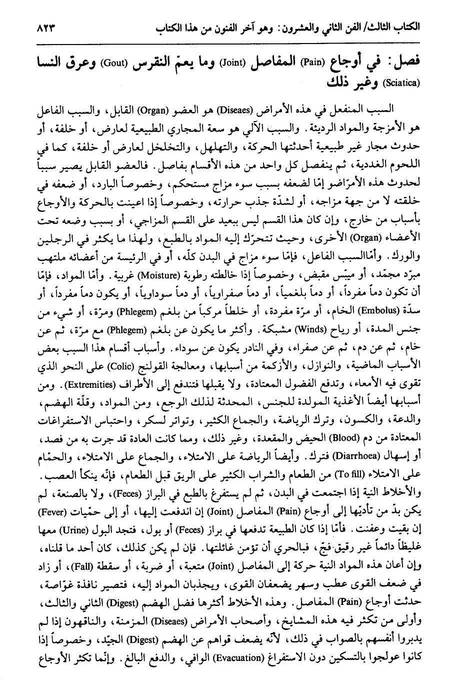 فصل فِي أوجاع المفاصل وَمَا يعم النقرس وعرق النسا وَغير ذَلِك: السَّبَب المنفعل فِي هَذِه الْأَمْرَاض هُوَ اَلعضو الْقَابِل وَالسَّبَب الْفَاعِل هُوَ الأمزجة والمواد الرَّديئَة وَالسَّبَب الآلي هُوَ سَعَة المجاري الطبيعية لعَارض أَو خلفة أَو حُدُوث مجار غير طبيعية أحدثتها الْحَرَكَة والتهلهل والتخلخل لعَارض أَو خلفة كَمَا فِي اللحوم الغمدية ثمَّ ينْفَصل كل وَاحِد من هَذِه الْأَقْسَام بفاصل. فالعضو الْقَابِل يصير سَببا لحدوث هَذِه الْأَمْرَاض إِمَّا لضَعْفه بِسَبَب سوء مزاج مستحكم وخصوصاً الْبَارِد أَو ضعفه فِي خلقته لَا من جِهَة مزاجه أَو لشدَّة جذب حرارته وخصوصاً إِذا أعينت بالحركة والأوجاع بِأَسْبَاب من خَارج. وَإِن كَانَ هَذَا الْقسم لَيْسَ بِبَعِيد على الْقسم المزاجي أَو بِسَبَب وَضعه تَحت الْأَعْضَاء الْأُخْرَى وَحَيْثُ تتحرك إِلَيْهِ الْموَاد بالطبع وَلِهَذَا مَا يكثر فِي الرجلَيْن والورك. وَأما السَّبَب الْفَاعِل فإمَّا سوء مزاج فِي الْبدن كُله أَو فِي الرئيسة من أَعْضَائِهِ ملتهب مبرد مجمد أَو ميبس مقبض وخصوصاً إِذا خالطته رُطُوبَة غَرِيبَة. وَأما الْموَاد فإمَّا أَن تكون دَمًا مُفردا أَو دَمًا بلغمياً أَو دَمًا صفراوياً أَو دَمًا سوداوياَ أَو يكون دَمًا مُفردا أَو سدة الخام أَو مرّة مُفْردَة أَو خلطاً مركباَ من بلغم وَمرَّة أَو شَيْء من جنس الْمدَّة أَو ريَاح مشبكة. وَأكْثر مَا يكون عَن بلغم مَعَ مرّة ثمَّ عَن خام ثمَّ عَن دم ثمَّ عَن صفراء وَفِي النَّادِر يكون عَن سَوْدَاء. وَأَسْبَاب أَقسَام هَذَا السَّبَب بعض الْأَسْبَاب الْمَاضِيَة والنوازل والأزكمة من أَسبَابهَا ومعالجة القولنج على النَّحْو الَّذِي تقوى فِيهِ الأمعاء وتدفع الفضول الْمُعْتَادَة وَلَا يقبلهَا فتندفع إِلَى الْأَطْرَاف. وَمن أَسبَابهَا أَيْضا الأغذية المولدة للْجِنْس المحدثة لذَلِك الوجع وَمن الْموَاد وَقلة الهضم والدعة والسكون وَترك الرياضة وَالْجِمَاع الْكثير وتواتر السكر واحتباس الاستفراغات الْمُعْتَادَة من دم الْحيض والمقعدة وَغير ذَلِك وَمِمَّا كَانَت الْعَادة قد جرت بِهِ من قصد أوإسهال فَترك. وأيضاَ الرياضة على الإمتلاء وَالْجِمَاع على الامتلاء وَالْحمام على الامتلاء من الطَّعَام وَالشرَاب الْكثير على الرِّيق قبل الطَّعَام فَإِنَّهُ ينْكَأ العصب والأخلاط النِّيَّة إِذا اجْتمعت فِي الْبدن ثمَّ لم يستفرغ بالطبع فِي البرَاز وَلَا بالصنعة لم يكن بُد من تأدّيها إِلَى أوجاع المفاصل إِن اندفعت إِلَيْهَا أَو إِلَى حمّيات إِن بقيت وعفنت. فَأَما إِذا كَانَت الطبيعة تدفعها فِي برَاز أَو بَوْل فتجد الْبَوْل مَعهَا غليظاً دَائِما غير رَقِيق فج فبالحري أَن تؤمن غائلتها. فَإِن لم يكن كَذَلِك كَانَ أحد مَا قُلْنَاهُ وَإِن أعَان هَذِه الْموَاد النِّيَّة حَرَكَة إِلَى المفاصل متعبة أَو ضَرْبَة أَو سقطة أَو زَاد فِي ضعف القوى عطب وسهر يُضعفَانِ القوى ويجذبان الْموَاد إِلَيْهِ فَتَصِير نَافِذَة غواصة حدثت أوجاع المفاصل. وَهَذِه الأخلاط أَكْثَرهَا فضل الهضم الثَّانِي وَالثَّالِث. وَأولى من تكْثر - فِيهِ هَذِه الْمَشَايِخ أَصْحَاب الْأَمْرَاض المزمنة والناقهون إِذا لم يدبروا أنفسهم بِالصَّوَابِ فِي ذَلِك لِأَنَّهُ يضعف قواهم عَن الهضم الْجيد وخصوصاً إِذا كَانُوا عولجوا بالتسكين دون الاستفراغ الوافي وَالدَّفْع الْبَالِغ. وَإِنَّمَا تكْثر الأوجاع فِي