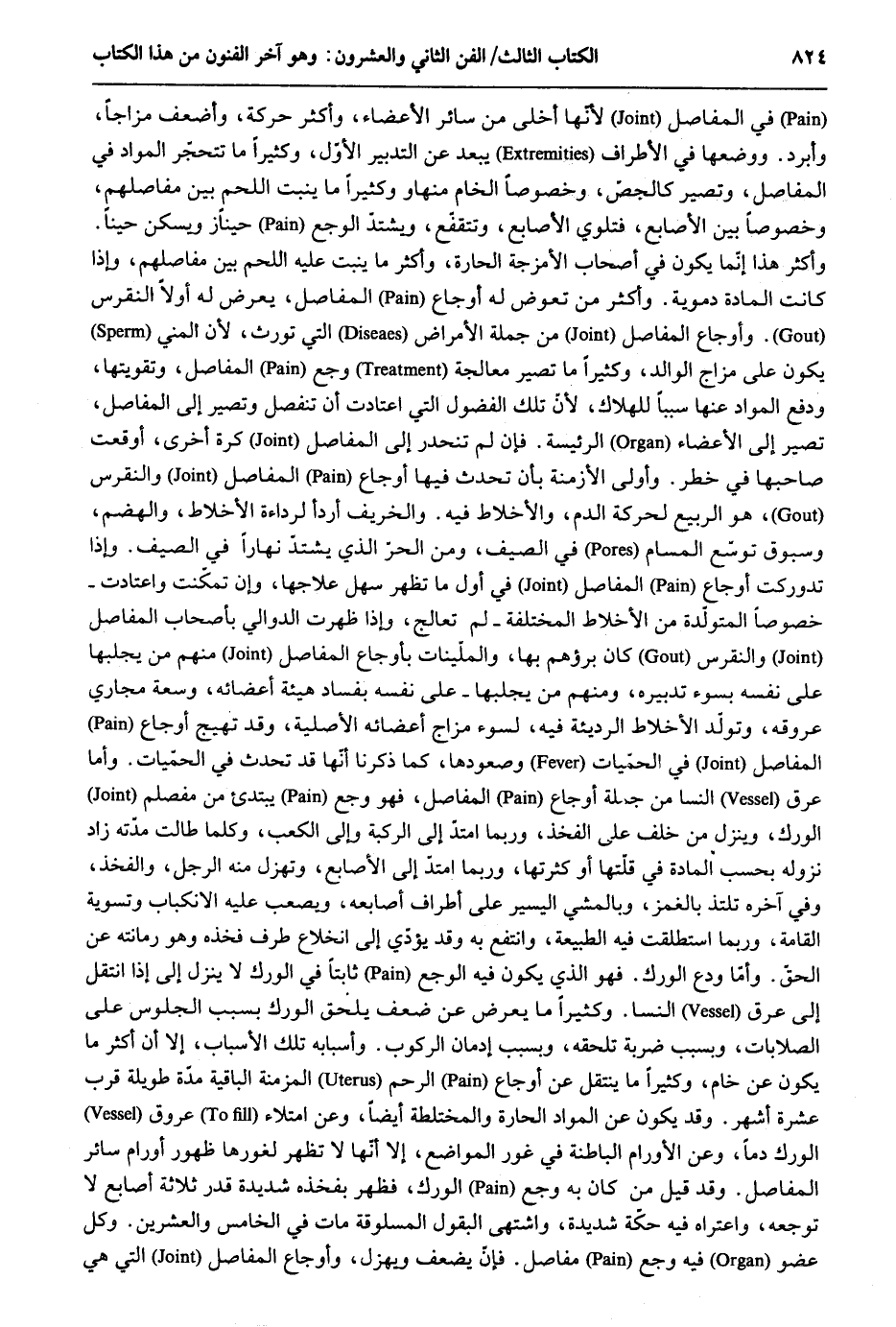 المفاصل لِأَنَّهَا أخلى من سَائِر الْأَعْضَاء وَأكْثر حَرَكَة وأضعف مزاجاً وأبرد. ووضعها فِي الْأَطْرَاف يبعد عَن التَّدْبِير الأول وَكَثِيرًا مَا تتحجر الْموَاد فِي المفاصل وَتصير كالجص وخصوصاً الخام مِنْهَا وَكَثِيرًا مَا ينْبت اللَّحْم بَين مفاصلهم وخصوصاً بَين الْأَصَابِع فتلوي الْأَصَابِع وتتقفع ويشتد الوجع حينا ويسكن حينا. وَأكْثر هَذَا إِنَّمَا يكون فِي أَصْحَاب الأمزجة الحارة وَأكْثر مَا ينْبت عَلَيْهِ اللَّحْم بَين مفاصلهم وَإِذا كَانَت الْمَادَّة دموية. وَأكْثر من تعرض لَهُ أوجاع المفاصل يعرض لَهُ أَولا النقرس. وأوجاع المفاصل من جملَة الْأَمْرَاض الَّتِي تورث لِأَن الْمَنِيّ يكون على مزاج الْوَالِد وَكَثِيرًا مَا تصير معالجة وجع المفاصل وتقويتها وَدفع الْموَاد عَنْهَا سَببا للهلاك لِأَن تِلْكَ الفضول الَّتِي اعتادت أَن تنفصل وَتصير إِلَى المفاصل تصير إِلَى الْأَعْضَاء الرئيسة. فَإِن لم تنحدر إِلَى المفاصل كرة أُخْرَى أوقعت صَاحبهَا فِي خطر. وَأولى الْأَزْمِنَة بِأَن تحدث فِيهَا أوجاع المفاصل والنقرس هُوَ الرّبيع لحركة الدَّم والأخلاط فِيهِ. والخريف أردأ لرداءة الأخلاط والهضم وسبوق توسع المسام فِي الصَّيف وَمن الْحر الَّذِي يشْتَد نَهَارا فِي الصَّيف. وَإِذا تدوركت أوجاع المفاصل فِي أول مَا تظهر سهل علاجها وَإِن تمكنت واعتادت خُصُوصا المتولدة من الأخلاط الْمُخْتَلفَة لم تعالج. وَإِذا ظَهرت الدوالي بأصحاب المفاصل والنقرس كَانَ برؤهم بهَا والملينات بأوجاع المفاصل مِنْهُم من يجلبها على نَفسه بِسوء تَدْبيره وَمِنْهُم من يجلبها على نَفسه بِفساد هَيْئَة أَعْضَائِهِ وسعة مجاري عروقه وتولد الأخلاط الرَّديئَة فِيهِ لسوء مزاج أَعْضَائِهِ الْأَصْلِيَّة. وَقد تهيج أوجاع المفاصل فِي الحميات وصعودها كَمَا ذكرنَا أَنَّهَا قد تحدث فِي الحميات. وَأما عرق النسا من جملَة أوجاع المفاصل فَهُوَ وجع يَبْتَدِئ من مفصل الورك وينزّل من خلف على الْفَخْذ وَرُبمَا امْتَدَّ إِلَى الرّكْبَة وَإِلَى الكعب وَكلما طَالَتْ مدَّته زَاد نُزُوله بِحَسب الْمَادَّة فِي قلتهَا أَو كثرتها وَرُبمَا امْتَدَّ إِلَى الْأَصَابِع وتهزل مِنْهُ الرجل والفخذ وَفِي آخِره تلتذ بالغمز وبالمشي الْيَسِير على أَطْرَاف أَصَابِعه ويصعب عَلَيْهِ الانكباب وتسوية الْقَامَة وَرُبمَا استطلقت فِيهِ الطبيعة وانتفع بِهِ وَقد يُؤَدِّي إِلَى انخلاع طرف فَخذه وَهُوَ رمانته عَن الْحق. وَأما وجع الورك فَهُوَ الَّذِي يكون فِيهِ الوجع ثَابتا فِي الورك لَا ينزل إِلَّا إِذا انْتقل إِلَى عرق النسا. وَكَثِيرًا مَا يعرض عَن ضعف يلْحق الورك بِسَبَب الْجُلُوس على الصلابات وبسبب ضَرْبَة تلْحقهُ وبسبب إدمان الركرب. وأسبابه تِلْكَ الْأَسْبَاب إِلَّا أَن أَكثر مَا يكون عَن خام وَكَثِيرًا مَا ينْتَقل عَن أوجاع الرَّحِم المزمنة الْبَاقِيَة مُدَّة طَوِيلَة قرب عشرَة أشهر. وَقد يكون عَن الْموَاد الحارة والمختلطة أَيْضا وَعَن امتلاء عروق الورك دَمًا وَعَن الأورام الْبَاطِنَة فِي غور الْمَوَاضِع إِلَّا أَنَّهَا لَا تظهر لغورها ظُهُور أورام سَائِر المفاصل. وَقد قيل من كَانَ بِهِ وجع الورك فَظهر بفخذه حمرَة شَدِيدَة قدر ثَلَاثَة أَصَابِع لَا توجعه واعتراه فِيهِ حكة شَدِيدَة واشتهى الْبُقُول المسلوقة مَاتَ فِي الْخَامِس وَالْعِشْرين. وكل عُضْو فِيهِ وجع مفاصل فَإِنَّهُ يضعف ويهزل وأوجاع المفاصل الَّتِي هِيَ