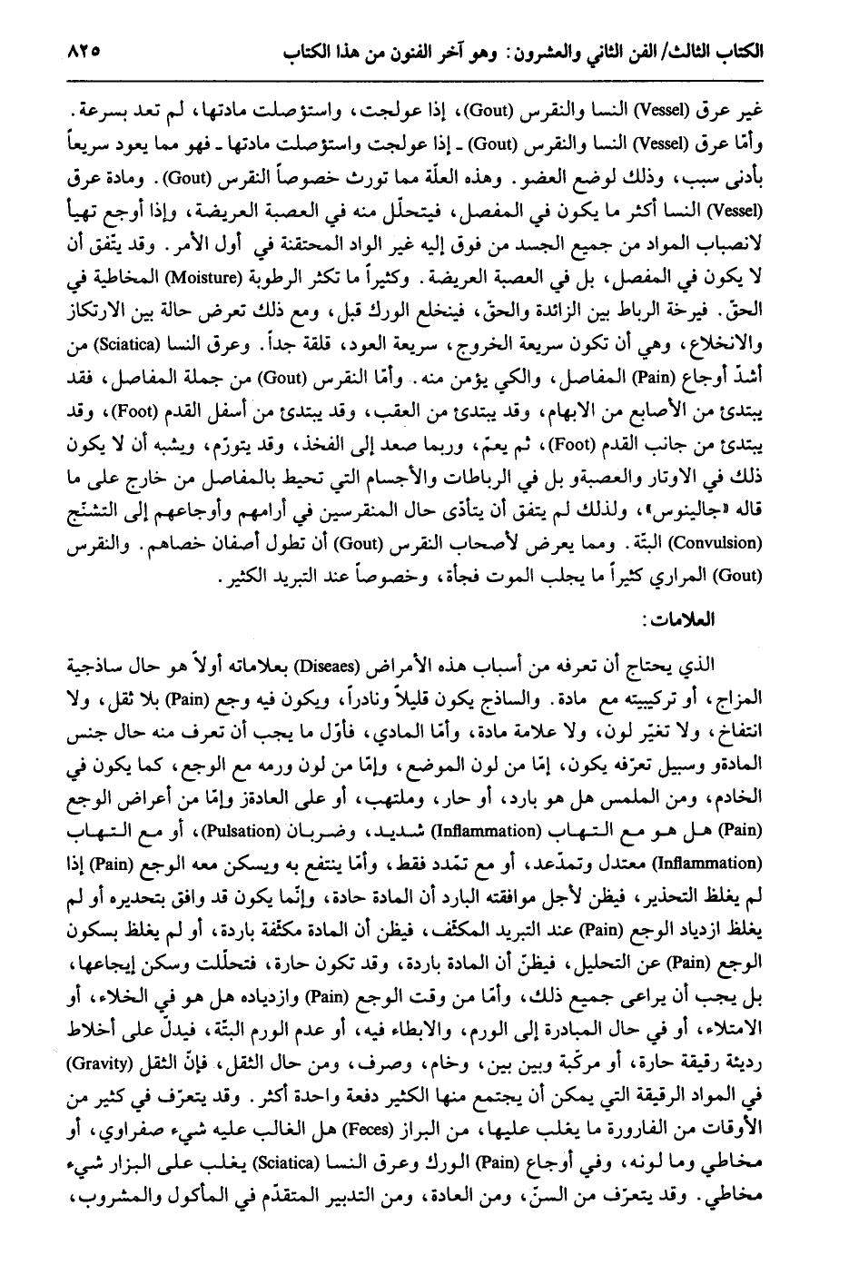غير عرق النسا والنقرس إِذا عولجت واستؤصلت مادتها لم تعد بِسُرْعَة. وَأما عرق النسا والنقرس إِذا عولجت واستؤصلت مادتها فَهُوَ مِمَّا يعود سَرِيعا بِأَدْنَى سَبَب وَذَلِكَ لوضع الْعُضْو. وَهَذِه الْعلَّة مِمَّا تورث خُصُوصا النقرس. ومادة عرق النسا أَكثر مَا يكون فِي الْمفصل فيتحلل مِنْهُ فِي الْعصبَة العريضة وَإِذا أوجع تهَيَّأ لانصباب الْموَاد من جَمِيع الْجَسَد من فَوق إِلَيْهِ غير الْموَاد المحتقنة فِي أول الْأَمر. وَفد يتَّفق أَن لَا يكون فِي الْمفصل بل فِي الْعصبَة العريضة. وَكَثِيرًا مَا تكْثر الرُّطُوبَة المخاطية فِي الْحق فيرخي الرِّبَاط الَّذِي بَين الزَّائِدَة وَالْحق فينخلع الورك قبل وَمَعَ ذَلِك تعرض حَالَة بَين الارتكاز والانخلاع وَهِي أَن تكون سريعة الْخُرُوج سريعة الْعود قلقة جدا. وعرق النسا من أَشد أوجاع المفاصل والكي يُؤمن مِنْهُ. وَأما النقرس من جملَة أوجاع المفاصل فقد يَبْتَدِئ من الْأَصَابِع من الْإِبْهَام وَقد يَبْتَدِئ من الْعقب وَقد يَبْتَدِئ من أَسْفَل الْقدَم وَقد يَبْتَدِئ من جَانب الْقدَم ثمَّ يعم وَرُبمَا صعد إِلَى الْفَخْذ وَقد يتورم وَيُشبه أَن لَا يكون ذَلِك فِي الأوتار والعصبة بل فِي الرباطات والأجسام الَّتِي تحيط بالمفاصل من خَارج على مَا قَالَه جالينوس وَلذَلِك لم يتَّفق أَن يتَأَدَّى حَال المنقرسين فِي أورامهم وأوجاعهم إِلَى التشنج الْبَتَّةَ. وَمِمَّا يعرض لأَصْحَاب النقرس أَن تطول أصفان خصاهم. العلامات: الَّذِي يحْتَاج أَن تعرفه من أَسبَاب هَذِه الْأَمْرَاض بعلاماته أَولا هُوَ حَال ساذجية المزاج أَو تركيبيته مَعَ مَادَّة. والساذج يكون قَلِيلا ونادراً وَيكون فِيهِ وجع بِلَا ثقل وَلَا انتفاخ وَلَا تغير لون وَلَا عَلامَة مَادَّة. وَأما المادي فَأول مَا يجب أَن تعرف مِنْهُ حَال جنس الْمَادَّة وسبيل تعرفه يكون إِمَّا من لون الْموضع وَإِمَّا من لون ورمه مَعَ الوجع كَمَا يكون فِي الخام وَمن الملمس هَل هُوَ بَارِد أَو حَار وملتهب أَو على الْعَادة. وَإِمَّا من أَعْرَاض الوجع هَل هُوَ مَعَ التهاب شَدِيد وضربان أَو مَعَ التهاب معتدل وتمدد أَو مَعَ تمدّد فَقَط وَأما مِمَّا ينْتَفع بِهِ ويسكن مَعَه الوجع إِذا لم يغلظ التخدير فيظن لأجل مُوَافَقَته للبارد أَن الْمَادَّة حادة وَإِنَّمَا يكون قد وَافق بتخديره أَو لم يغلظ ازدياد الوجع عِنْد التبريد المكثف فيظن أَن الْمَادَّة مكثفة بَارِدَة أَو لم يغلظ بِسُكُون الوجع عَن التَّحْلِيل فيظن أَن الْمَادَّة بَارِدَة وَقد تكون حارة فتحللت وَسكن إيجاعها بل يجب أَن يُرَاعى جَمِيع ذَلِك. وَأما من وَقت الوجع وازدياده هَل هُوَ فِي الْخَلَاء أَو الامتلاء أَو فِي حَال الْمُبَادرَة إِلَى الورم والإبطاء فِيهِ أَو عدم الورم الْبَتَّةَ فَيدل على أخلاط رَدِيئَة رقيقَة حارة أَو مركبة وَبَين بَين وخام وَصرف وَمن حَال الثّقل فَإِن الثّقل فِي الْموَاد الرقيقة الَّتِي يُمكن أَن يجْتَمع مِنْهَا الْكثير دفْعَة وَاحِدَة أَكثر. وَقد يتعرف فِي كثير من الْأَوْقَات من القارورة مَا يغلب عَلَيْهِ من البرَاز هَل الْغَالِب عَلَيْهِ شَيْء صفراوي أَو مخاطي وَمَا لَونه وَفِي أوجاع الورك وعرق النسا يغلب على البرَاز شَيْء مخاطيّ. وَقد يتعرف من السنّ وَمن الْعَادة وَمن. التَّدْبِير الْمُتَقَدّم فِي الْمَأْكُول والمشروب