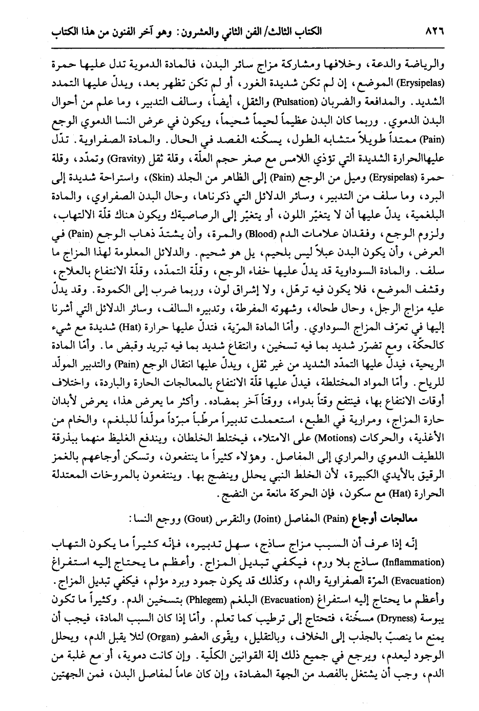 والرياضة والدعة وخلافها ومشاركة مزاج سَائِر الْبدن. فالمادة الدموية تدل عَلَيْهَا حمرَة الْموضع إِن لم تكن شَدِيدَة الْغَوْر أَو لم تكن تظهر بعد وَيدل عَلَيْهَا التمدد الشَّديد والمدافعة والضربان والثقل أَيْضا وسالف التَّدْبِير وَمَا علم من أَحْوَال الْبدن الدموي. وَرُبمَا كَانَ الْبدن عَظِيما لحيماً شحيماً وَيكون فِي عرق النسا الدموي الوجع ممتداً طَويلا متشابه الطول يسكّنه الفصد فِي الْحَال. والمادة الصفراوية تدل عَلَيْهَا الْحَرَارَة الشَّدِيدَة الَّتِي تؤذي اللامس مَعَ صغر حجم الْعلَّة وَقلة ثقل وتمدد وَقلة حمرَة وميل من الوجع إِلَى الظَّاهِر من الْجلد واستراحة شَدِيدَة إِلَى الْبرد وَمَا سلف من التَّدْبِير وَسَائِر الدَّلَائِل الَّتِي ذَكرنَاهَا وَحَال الْبدن الصفراوي والمادة البلغمية يدل عَلَيْهَا أَن لَا يتغيّر اللَّوْن أَو يتَغَيَّر إِلَى الرصاصية وَيكون هُنَاكَ قلَّة الالتهاب وَلُزُوم الوجع وفقدان عَلَامَات الدَّم والمرة وَأَن يشْتَد ذهَاب الوجع فِي الْعرض وَأَن يكون الْبدن عبلاً لَيْسَ بلحيم بل هُوَ شحيم. والدلائل الْمَعْلُومَة لهَذَا المزاج مَا سلف. والمادة السوداوية قد يدل عَلَيْهَا خَفَاء الوجع وَقلة التمدد وَقلة الِانْتِفَاع بالعلاج وقشف الْموضع فَلَا يكون فِيهِ ترهّل وَلَا إشراق لون وَرُبمَا ضرب إِلَى الكمودة. وَقد يدل عَلَيْهِ مزاج الرجل وَحَال طحاله وشهوته المفرطة وتدبيره السالف وَسَائِر الدَّلَائِل الَّتِي أَشَرنَا إِلَيْهَا فِي تعرف المزاج السوداوي. وَأما الْمَادَّة المرية فتدل عَلَيْهَا حرارة شَدِيدَة مَعَ شَيْء كالحكة وَمَعَ تضرر شَدِيد بِمَا فِيهِ تسخين وانتفاع شَدِيد بِمَا فِيهِ تبريد وَقبض مَا. وَأما الْمَادَّة الريحية فَيدل عَلَيْهَا التمدد الشَّديد من غير ثقل وَيدل عَلَيْهَا انْتِقَال الوجع وَالتَّدْبِير المولد للرياح. وَأما الْموَاد المختلطة فَيدل عَلَيْهَا قلَّة الِانْتِفَاع بالمعالجات الحارة والباردة وَاخْتِلَاف أَوْقَات الِانْتِفَاع بهَا فينتفع وقتا بدواء ووقتاً آخر بمضاده. وَأكْثر مَا يعرض هَذَا يعرض لأبدان حارة المزاج مرارية فِي الطَّبْع اسْتعْملت تدبيراً مرطباً مبرداً مولداً للبلغم والخام من الأغذية والحركات على الامتلاء فيختلط الخلطان ويندفع الغليظ مِنْهُمَا ببذرقة اللَّطِيف الدموي والمراري إِلَى المفاصل. وَهَؤُلَاء كثيرا مَا يَنْتَفِعُونَ وتسكن أوجاعهم بالغمز الرَّقِيق بِالْأَيْدِي الْكَبِيرَة لِأَن الْخَلْط اللبني يتَحَلَّل وينضج بهَا. وينتفعون بالمروخات المعتدلة الْحَرَارَة مَعَ سُكُون فَإِن الْحَرَكَة مَانِعَة من النضج. معالجات أوجاع المفاصل والنقرس ووجع النسا: إِنَّه إِذا عرف أَن السَّبَب مزاج ساذج سهل تَدْبيره فَإِنَّهُ كثيرا مَا يكون التهاب ساذج بِلَا ورم فَيَكْفِي تَبْدِيل المزاج. وَأعظم مَا يحْتَاج إِلَيْهِ استفراغ الصفراوية وَالدَّم وَكَذَلِكَ قد يكون جمود وَبرد مؤلم فَيَكْفِي تَبْدِيل المزاج. وَأعظم مَا يحْتَاج إِلَيْهِ استفراغ البلغم بتسخين الدَّم. وَكَثِيرًا مَا تكون يبوسة مسخنة فتحتاج إِلَى ترطيب كَمَا تعلم. وَأما إِذا كَانَ السَّبَب الْمَادَّة فَيجب أَن يمْنَع مَا ينصب بالجذب إِلَى الْخلاف وبالتقليل وَيُقَوِّي الْعُضْو لِئَلَّا يقبل الدَّم ويحلل الْمَوْجُود ليعدم وَيرجع فِي جَمِيع ذَلِك إِلَى القوانين الْكُلية. وَإِن كَانَت دموية أَو مَعَ غَلَبَة من الدَّم وَجب أَن يشْتَغل بالفصد من الْجِهَة المضادة وَإِن كَانَ عَاما لمفاصل الْبدن فَمن الْجِهَتَيْنِ