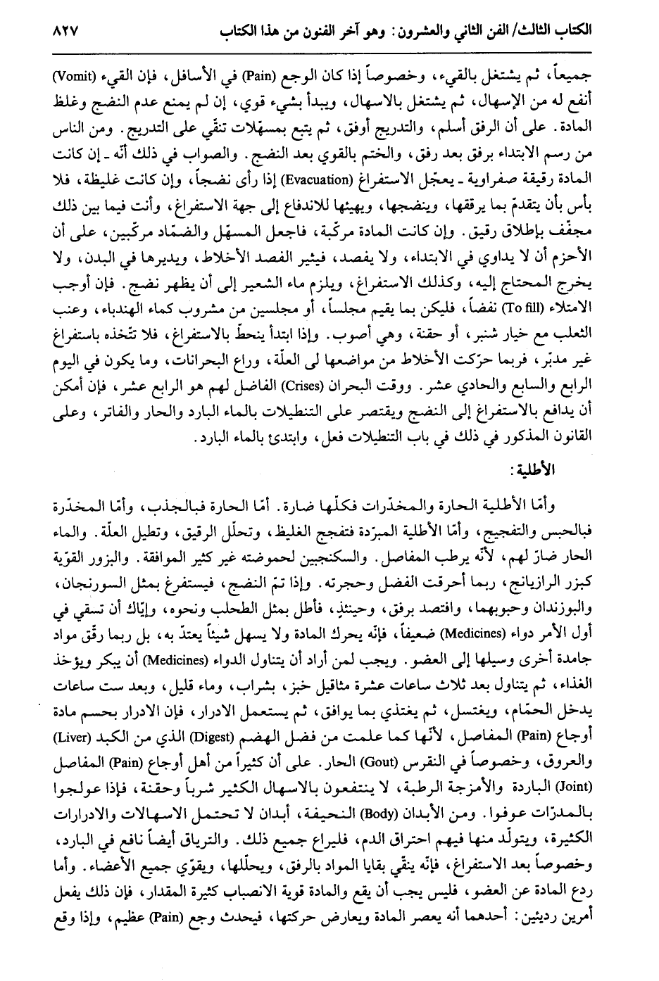 جَمِيعًا ثمَّ يشْتَغل بالقيء وخصوصاً إِذا كَانَ الوجع فِي الأسافل فَإِن الْقَيْء أَنْفَع لَهُ من الإسهال ثمَّ يشْتَغل بالإسهال وَيبدأ بِشَيْء قوي إِن لم يمْنَع عدم النضج وَغلظ الْمَادَّة. على أَن الرِّفْق أسلم والتدريج أوفق ثمَّ يتبع بمسهلات تنقي على التدريج. وَمن النَّاس من رسم الِابْتِدَاء بِرِفْق بعد رفق والختم بِالْقَوِيّ بعد النضج. وَالصَّوَاب فِي ذَلِك أَنه إِن كَانَت الْمَادَّة رقيقَة صفراوية يعجل الاستفراغ إِذا رأى نضجاً وَإِن كَانَت غَلِيظَة فَلَا بَأْس بِأَن يتَقَدَّم بِمَا يرققها وينضجها ويهيئها للاندفاع إِلَى جِهَة الاستفراغ وَأَنت فِيمَا بَين ذَلِك مجفف بِإِطْلَاق رَقِيق. وَإِن كَانَت الْمَادَّة مركبة فَاجْعَلْ المسهل والضماد مركبين على أَن الأحزم أَن لَا يداوي فِي الِابْتِدَاء وَلَا يفصد فيثير الفصد الأخلاط ويديرها فِي الْبدن وَلَا يخرج الْمُحْتَاج إِلَيْهِ وَكَذَلِكَ الاستفراغ وَيلْزم مَاء الشّعير إِلَى أَن يظْهر نضج. فَإِن أوجب الامتلاء نفضاً فَلْيَكُن بِمَا يُقيم مَجْلِسا أَو مجلسين من مشروب كَمَاء الهندبا وعنب الثَّعْلَب مَعَ خِيَار شنبر أَو حقنة وَهِي أصوب. وَإِذا ابْتَدَأَ ينحط بالاستفراغ فَلَا. تتخذه باستفراغ غير مُدبر فَرُبمَا حركت الأخلاط منمواضعها إِلَى الْعلَّة وراع البحرانات وَمَا يكون فِي الْيَوْم الرَّابِع وللسابع وَالْحَادِي عشر. وَوقت البحران الْفَاضِل لَهُم هُوَ الرَّابِع عشر فَإِن أمكن أَن يدافع بالاستفراغ إِلَى النضج ويقتصر على التنطيلات بِالْمَاءِ الْبَارِد والحار والفاتر وعَلى الفانون الْمَذْكُور فِي ذَلِك فِي بَاب التنطيلات فعل وابتدئ بِالْمَاءِ الْبَارِد. الأطلية: وَأما الأطلية الحارة والمخدرات فَكلهَا ضارة. أما الحارة فبالجذب وَأما المخدرة فبالحبس والتفجيج وَأما الأطلية المبردة فتفجج الغليظ وتحلل الرَّقِيق وتطيل الْعلَّة. وَالْمَاء الْحَار ضار لَهُم لِأَنَّهُ يرطب المفاصل. والسكنجبين لحموضته غير كثير الْمُوَافقَة. والبزور القوية كبزر الرازيانج رُبمَا أحرقت الْفضل وحجرته. وَإِذا تمّ النضج فيستفرغ بِمثل السورنجان والبوزندان وحبوبهما وافتصد بِرِفْق وَحِينَئِذٍ فاطلِ بِمثل الطحلب وَنَحْوه وَإِيَّاك أَن تَسْقِي فِي أول الْأَمر دَوَاء ضَعِيفا فَإِنَّهُ يحرّك الْمَادَّة وَلَا يسهل شَيْئا يعتدّ بِهِ بل رُبمَا رقّق مواد جامدة أُخْرَى وسيلها إِلَى الْعُضْو. وَيجب لمن أَرَادَ أَن يتَنَاوَل الدَّوَاء أَن يبكر وَيُؤْخَذ الْغذَاء ثمَّ يتَنَاوَل بعد ثَلَاث سَاعَات عشرَة مَثَاقِيل خبز بشراب وَمَاء قَلِيل وَبعد سِتّ سَاعَات يدْخل الْحمام ويغتسل ثمَّ يغتذي بِمَا يُوَافق ثمَّ يسْتَعْمل الإدرار فَإِن الإدرار بجسم مَادَّة أوجاع المفاصل لِأَنَّهَا كَمَا علمت من فضل الهضم الَّذِي من الكبد وَالْعُرُوق وخصوصاً فِي النقرس الْحَار. على أَن كثيرا من أهل أوجاع المفاصل الْبَارِدَة والأمزجة الرّطبَة لَا يَنْتَفِعُونَ بالإسهال الْكثير شرباً وحقنة فَإِذا عولجوا بالمدرّات عوفوا. وَمن الْأَبدَان النحيفة أبدان لَا تحْتَمل الإسهالات والإدرارات الْكَثِيرَة ويتولّد مِنْهَا فيهم احتراق الدَّم فليراعَ جَمِيع ذَلِك. والترياق أَيْضا نَافِع فِي الْبَارِد وخصوصاً بعد الاستفراغ فَإِنَّهُ ينقي بقايا الْموَاد بالرفق ويحلْلها وَأما ردع الْمَادَّة عَن الْعُضْو فَلَيْسَ يجب أَن يَقع والمادة قَوِيَّة الانصباب كَثِيرَة الْمِقْدَار فَإِن ذَلِك يفعل أَمريْن رديئين: أَحدهمَا أَنه يعصر الْمَادَّة ويعارض حركتها فَيحدث وجع عَظِيم وَإِذا وَقع
