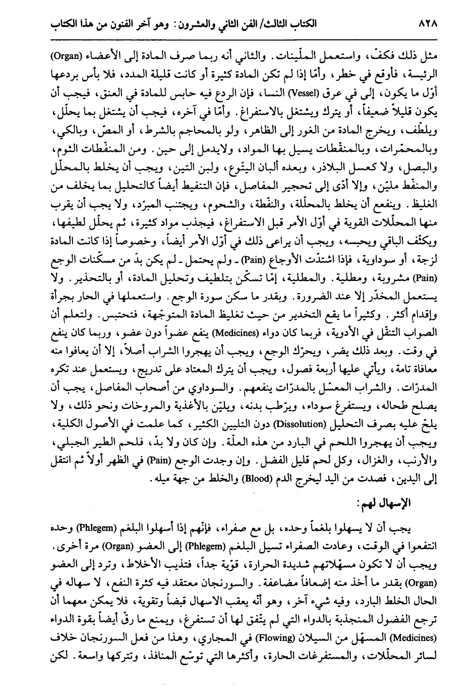 مثل ذَلِك فَكف وَاسْتعْمل الملينات. وَالثَّانِي أَنه رُبمَا صرف الْمَادَّة إِلَى الْأَعْضَاء الرئيسة فأوقع فِي خطر وَأما إِذا لم تكن الْمَادَّة كَثِيرَة أَو كَانَت قَليلَة المدد فَلَا بَأْس بردعها أول مَا يكون إِلَّا فِي عرق النسا فَإِن الردع فِيهِ حَابِس للمادة فِي الْعُنُق فَيجب أَن يكون قَلِيلا ضَعِيفا أَو يتْرك ويشتغل بالاستفراغ. وَأما فِي آخِره فَيجب أَن يشْتَغل بِمَا يحلل ويلطّف وَيخرج الْمَادَّة من الْغَوْر إِلَى الظَّاهِر وَلَو بالمحاجم بِالشّرطِ أَو المص وبالكي وبالمحمّرات وبالمنفّطات يسيل بهَا الْموَاد وَلَا يدمل إِلَى حِين. وَمن المنفطات الثوم والبصل وَلَا علاج كعسل البلاذر وَبعده ألبان اليتّوع وَلبن التِّين وَيجب أَن يخلط بالمحلل والمنفط مليّن وَإِلَّا أدّى إِلَى تحجير المفاصل فَإِن التنفيط أَيْضا كالتحليل بِمَا يخلف من الغليظ. وينفع أَن يخلط بالمحللة والمنفطة والشحوم ويجتنب المبرّد وَلَا يجب أَن يقرب مِنْهَا المحللات القوية فِي أول الْأَمر قبل الاستفراغ فيجذب مواد كَثِيرَة ثمَّ يحلل لطيفها ويكثف الْبَاقِي ويحبسه وَيجب أَن يُرَاعى ذَلِك فِي أول الْأَمر أَيْضا وخصوصاً إِذا كَانَت الْمَادَّة لزجة أَو سوداوية فَإِذا اشتدّت الأوجاع وَلم يحْتَمل لم يكن بدّ من مسكنات الوجع مشروبة ومطلية. والمطلية إِمَّا وَلَا يسْتَعْمل المخدر إِلَّا عِنْد الضَّرُورَة وبقدر مَا سكن سُورَة الوجع. واستعملها فِي الْحَار بجرأة وإقدام أَكثر. وَكَثِيرًا مَا يَقع التخدير من حَيْثُ تَغْلِيظ الْمَادَّة المتوجهة فتحتبس. ولتعلم أَن الصَّوَاب التنقل فِي الْأَدْوِيَة فَرُبمَا كَانَ دَوَاء ينفع عضوا دون عُضْو وَرُبمَا كَانَ ينفع فِي وَقت. وَبعد ذَلِك يضر ويحرك الوجع وَيجب أَن يهجروا الشَّرَاب أصلا إِلَّا أَن يُعافوا مِنْهُ معافاة تَامَّة وَيَأْتِي عَلَيْهَا أَرْبَعَة فُصُول وَيجب أَن يتْرك الْمُعْتَاد على تدريج وَيسْتَعْمل عِنْد تَركه المدرات. وَالشرَاب المعسل بالمدرات يَنْفَعهُمْ. والسوداوي من أَصْحَاب المفاصل يجب أَن يصلح طحاله ويستفرغ سَوْدَاء ويرطب بدنه. ويلين بالأغذية والمروخات وَنَحْو ذَلِك وَلَا يلحّ عَلَيْهِ بِصَرْف التَّحَلُّل دون التليين الْكثير كَمَا علمت فِي الْأُصُول الْكُلية وَيجب أَن يهجروا اللَّحْم فِي الْبَارِد من هَذِه الْعلَّة. وَإِن كَانَ وَلَا بدّ فلحم الطير الْجبلي والأرنب والغزال وكل لحم قَلِيل الْفضل. وَإِن وجدت الوجع فِي الظّهْر أَولا ثمَّ انْتقل إِلَى الْيَدَيْنِ فصدت من الْيَد ليخرج الدَّم والخلط من جِهَة ميله. الإسهال لَهُم: بجب أَن لَا يسهلوا بلغماً وَحده بل مَعَ صفراء فَإِنَّهُم إِذا أسهلوا البلغم وَحده انتفعوا فِي الْوَقْت وعادت الصَّفْرَاء تسيل البلغم إِلَى الْعُضْو مرّة أُخْرَى. وَيجب أَن لَا تكون مسهلاتهم شَدِيدَة والسورنجان مُعْتَقد فِيهِ كَثْرَة النَّفْع لإسهاله فِي الْحَال الْخَلْط الْبَارِد وَفِيه شَيْء آخر وَهُوَ أَنه يعقب الإسهال قبضا وتقوية فَلَا يُمكن مَعَهُمَا أَن ترجع الفضول المنجذبة بالدواء الَّتِي لم يتَّفق لَهَا أَن تستفرغ وَيمْنَع مَا رق أَيْضا بِقُوَّة الدَّوَاء المسهل من السيلان فِي المجاري وَهَذَا من فعل السورنجان خلافًا لسَائِر المحللات والمستفرغات الحارة وأكثرها الَّتِي توسع المنافذ وتتركها وَاسِعَة. لَكِن