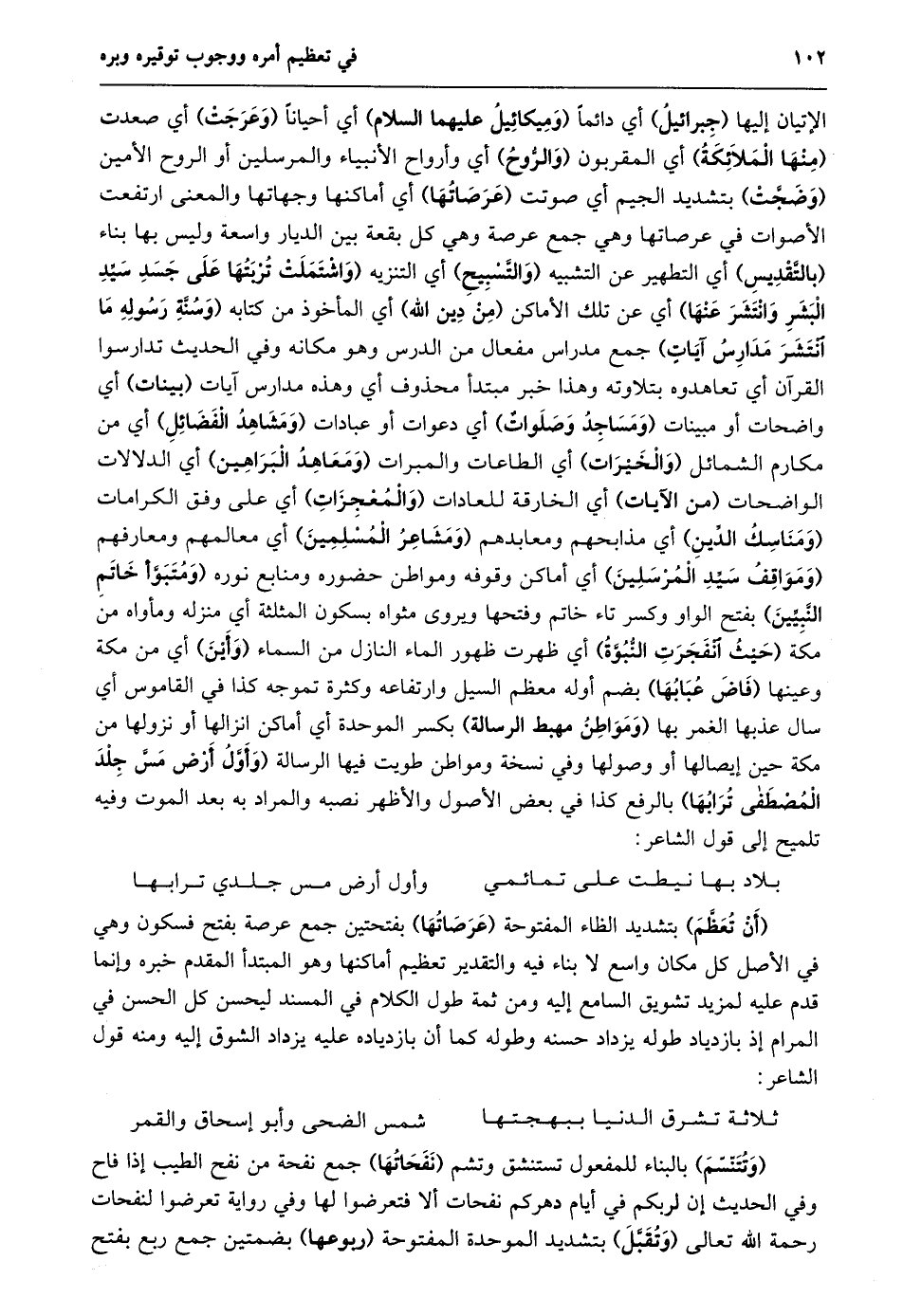 الإتيان إليها (جبرائيل) أي دائما (وميكائيل عليهما السلام) أي أحيانا (وعرجت) أي صعدت (منها الملائكة) أي المقربون (والرّوح) أي وأرواح الأنبياء والمرسلين أو الروح الأمين (وضجّت) بتشديد الجيم أي صوتت (عرصاتها) أي أماكنها وجهاتها والمعنى ارتفعت الأصوات في عرصاتها وهي جمع عرصة وهي كل بقعة بين الديار واسعة وليس بها بناء (بالتّقديس) أي التطهير عن التشبيه (والتّسبيح) أي التنزيه (وَاشْتَمَلَتْ تُرْبَتُهَا عَلَى جَسَدِ سَيِّدِ الْبَشَرِ وَانْتَشَرَ عنها) أي عن تلك الأماكن (من دين الله) أي المأخوذ من كتابه (وسنّة رسوله ما انتشر مدارس آيات) جمع مدارس مفعال من الدرس وهو مكانه وفي الحديث تدارسوا القرآن أي تعاهدوه بتلاوته وهذا خبر مبتدأ محذوف أي وهذه مدارس آيات (بينات) أي واضحات أو مبينات (ومساجد وصلوات) أي دعوات أو عبادات (ومشاهد الفضائل) أي من مكارم الشمائل (والخيرات) أي الطاعات والمبرات (ومعاهد البراهين) أي الدلالات الواضحات (من الآيات) أي الخارقة للعادات (والمعجزات) أي على وفق الكرامات (ومناسك الدّين) أي مذابحهم ومعابدهم (ومشاعر المسلمين) أي معالمهم ومعارفهم (ومواقف سيّد المرسلين) أي أماكن وقوفه ومواطن حضوره ومنابع نوره (ومتبوّأ خاتم النّبيّين) بفتح الواو وكسر تاء خاتم وفتحها ويروى مثواه بسكون المثلثة أي منزله ومأواه من مكة (حيث انفجرت النّبوّة) أي ظهرت ظهور الماء النازل من السماء (وأين) أي من مكة وعينها (فاض عبابها) بضم أوله معظم السيل وارتفاعه وكثرة تموجه كذا في القاموس أي سال عذبها الغمر بها (ومواطن مهبط الرسالة) بكسر الموحدة أي أماكن انزالها أو نزولها من مكة حين إيصالها أو وصولها وفي نسخة وَمُوَاطِنُ طُوِيَتْ فِيهَا الرِّسَالَةُ (وَأَوَّلُ أَرْضٍ مَسَّ جلد المصطفى ترابها) بالرفع كذا في بعض الأصول والأظهر نصبه والمراد به بعد الموت وفيه تلميح إلى قول الشاعر: