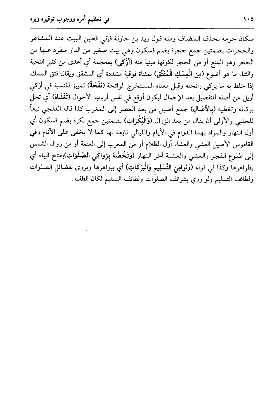 سكان حرمه بحذف المضاف ومنه قول زيد بن حارثة فإني قطين البيت عند المشاعر والحجرات بضمتين جمع حجرة بضم فسكون وهي بيت صغير من الدار منفرد عنها من الحجر وهو المنع أو من الحجر لكونها مبنية منه (أزكى) بمعجمة أي أهدى من كثير التحية والثناء ما هو أضوع (من المسك المفتّق) بمثناة فوقية مشددة أي المشقق ويقال فتق المسك إذا خلط به ما يزكي رائحته وقيل معناه المستخرج الرائحة (نفحة) تمييز للنسبة في أزكي أزيل عن أصله للتفصيل بعد الإجمال ليكون أوقع في نفس أرباب الأحوال (تغشاه) أي تحل بركاته وتغطيه (بالآصال) جمع أصيل من بعد العصر إلى المغرب كذا قاله الدلجي تبعا للحلبي والأولى أن يقال من بعد الزوال (والبكرات) بضمتين جمع بكرة بضم فسكون أي أول النهار والمراد بهما الدوام في الأيام والليالي تابعة لها كما لا يخفى على الأنام وفي القاموس الأصيل العشي والعشاء أول الظلام أو من المغرب إلى العتمة أو من زوال الشمس إلى طلوع الفجر والعشي والعشية آخر النهار (وتخصّه بزواكي الصّلوات) بفتح الياء أي بظواهرها وكذا في قوله (ونوامي التّسليم والبركات) أي ببواهرها ويروى بفضائل الصلوات ولطائف التسليم ولو روي بشرائف الصلوات ولطائف التسليم لكان الطف.