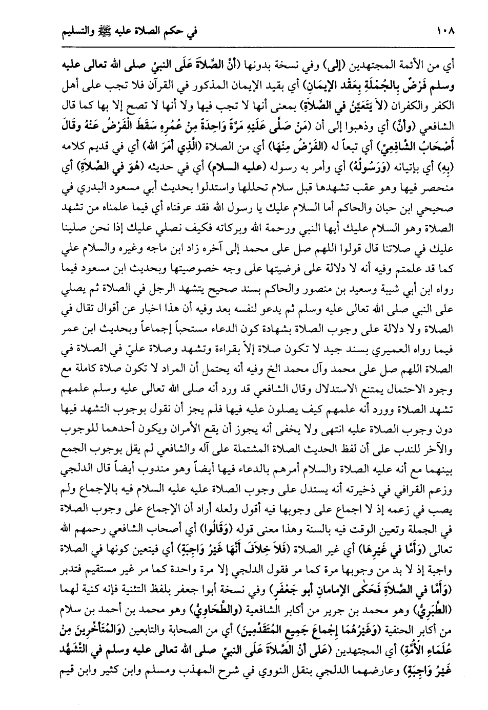 أي من الأئمة المجتهدين (إلى) وفي نسخة بدونها (أنّ الصّلاة على النبيّ صلى الله تعالى عليه وسلم فرض بالجملة بعقد الإيمان) أي بقيد الإيمان المذكور في القرآن فلا تجب على أهل الكفر والكفران (لا يتعيّن في الصّلاة) بمعنى أنها لا تجب فيها ولا أنها لا تصح إلا بها كما قال الشافعي (وأنّ) أي وذهبوا إلى أن (مَنْ صَلَّى عَلَيْهِ مَرَّةً وَاحِدَةً مِنْ عُمُرِهِ سقط الفرض عنه وقال أصحاب الشّافعيّ) أي تبعا له (الفرض منها) أي من الصلاة (الّذي أمر الله) أي في قديم كلامه (به) أي بإتيانه (ورسوله) أي وأمر به رسوله (عليه السلام) أي في حديثه (هو في الصّلاة) أي منحصر فيها وهو عقب تشهدها قبل سلام تحللها واستدلوا بحديث أبي مسعود البدري في صحيحي ابن حبان والحاكم أما السلام عليك يا رسول الله فقد عرفناه أي فيما علمناه من تشهد الصلاة وهو السَّلَامُ عَلَيْكَ أَيُّهَا النَّبِيُّ وَرَحْمَةُ اللَّهِ وَبَرَكَاتُهُ فكيف نصلي عليك إذا نحن صلينا عليك في صلاتنا قال قولوا اللهم صل على محمد إلى آخره زاد ابن ماجه وغيره والسلام علي كما قد علمتم وفيه أنه لا دلالة على فرضيتها على وجه خصوصيتها وبحديث ابن مسعود فيما رواه ابن أبي شيبة وسعيد بن منصور والحاكم بسند صحيح يتشهد الرجل في الصلاة ثم يصلي على النبي صلى الله تعالى عليه وسلم ثم يدعو لنفسه بعد وفيه أن هذا اخبار عن أقوال تقال في الصلاة ولا دلالة على وجوب الصلاة بشهادة كون الدعاء مستحبا إجماعا وبحديث ابن عمر فيما رواه العميري بسند جيد لا تكون صلاة إلّا بقراءة وتشهد وصلاة عليّ في الصلاة في الصلاة اللهم صل على محمد وآل محمد الخ وفيه أنه يحتمل أن المراد لا تكون صلاة كاملة مع وجود الاحتمال يمتنع الاستدلال وقال الشافعي قد ورد أنه صلى الله تعالى عليه وسلم علمهم تشهد الصلاة وورد أنه علمهم كيف يصلون عليه فيها فلم يجز أن نقول بوجوب التشهد فيها دون وجوب الصلاة عليه انتهى ولا يخفى أنه يجوز أن يقع الأمران ويكون أحدهما للوجوب والآخر للندب على أن لفظ الحديث الصلاة المشتملة على آله والشافعي لم يقل بوجوب الجمع بينهما مع أنه عليه الصلاة والسلام أمرهم بالدعاء فيها أيضا وهو مندوب أيضا قال الدلجي وزعم القرافي في ذخيرته أنه يستدل على وجوب الصلاة عليه عليه السلام فيه بالإجماع ولم يصب في زعمه إذ لا اجماع على وجوبها فيه أقول ولعله أراد أن الإجماع على وجوب الصلاة في الجملة وتعين الوقت فيه بالسنة وهذا معنى قوله (وقالوا) أي أصحاب الشافعي رحمهم الله تعالى (وأمّا في غيرها) أي غير الصلاة (فلا خلاف أنّها غير واجبة) أي فيتعين كونها في الصلاة واجبة إذ لا بد من وجوبها مرة كما مر فقول الدلجي إلا مرة واحدة كما مر غير مستقيم فتدبر (وَأَمَّا فِي الصَّلَاةِ فَحَكَى الْإِمَامَانِ أَبُو جَعْفَرٍ) وفي نسخة أبوا جعفر بلفظ التثنية فإنه كنية لهما (الطّبريّ) وهو محمد بن جرير من أكابر الشافعية (والطّحاويّ) وهو محمد بن أحمد بن سلام من أكابر الحنفية (وغيرهما إجماع جميع المتقدّمين) أي من الصحابة والتابعين (والمتأخّرين من علماء الأمّة) أي المجتهدين (عَلَى أَنَّ الصَّلَاةَ عَلَى النَّبِيِّ صَلَّى اللَّهُ تعالى عليه وسلم في التّشهّد غير واجبة) وعارضهما الدلجي بنقل النووي في شرح المهذب ومسلم وابن كثير وابن قيم