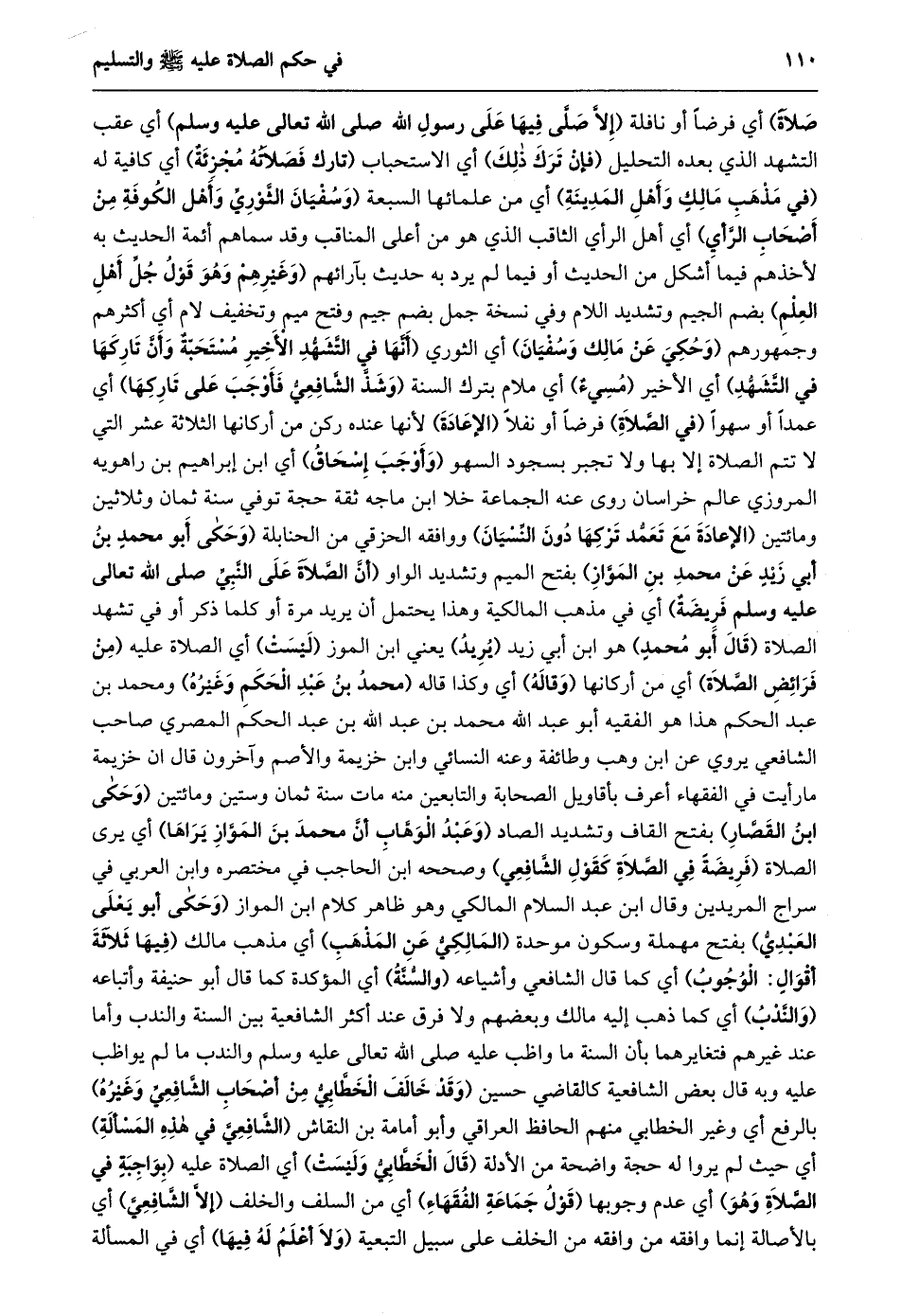 صلاة) أي فرضا أو نافلة (إِلَّا صَلَّى فِيهَا عَلَى رَسُولِ اللَّهِ صَلَّى الله تعالى عليه وسلم) أي عقب التشهد الذي بعده التحليل (فإن ترك ذلك) أي الاستحباب (تارك فصلاته مجزئة) أي كافية له (في مذهب مالك وأهل المدينة) أي من علمائها السبعة (وَسُفْيَانَ الثَّوْرِيِّ وَأَهْلِ الْكُوفَةِ مِنْ أَصْحَابِ الرَّأْيِ) أي أهل الرأي الثاقب الذي هو من أعلى المناقب وقد سماهم أئمة الحديث به لأخذهم فيما أشكل من الحديث أو فيما لم يرد به حديث بآرائهم (وغيرهم وهو قول جلّ أهل العلم) بضم الجيم وتشديد اللام وفي نسخة جمل بضم جيم وفتح ميم وتخفيف لام أي أكثرهم وجمهورهم (وحكي عن مالك وسفيان) أي الثوري (أَنَّهَا فِي التَّشَهُّدِ الْأَخِيرِ مُسْتَحَبَّةٌ وَأَنَّ تَارِكَهَا في التّشهّد) أي الأخير (مسيء) أي ملام بترك السنة (وشذّ الشّافعيّ فأوجب على تاركها) أي عمدا أو سهوا (في الصّلاة) فرضا أو نفلا (الإعادة) لأنها عنده ركن من أركانها الثلاثة عشر التي لا تتم الصلاة إلا بها ولا تجبر بسجود السهو (وأوجب إسحاق) أي ابن إبراهيم بن راهويه المروزي عالم خراسان روى عنه الجماعة خلا ابن ماجه ثقة حجة توفي سنة ثمان وثلاثين ومائتين (الإعادة مع تعمّد تركها دون النّسيان) ووافقه الحزقي من الحنابلة (وَحَكَى أَبُو مُحَمَّدِ بْنُ أَبِي زَيْدٍ عَنْ محمد بن الموّاز) بفتح الميم وتشديد الواو (أنّ الصّلاة على النّبيّ صلى الله تعالى عليه وسلم فريضة) أي في مذهب المالكية وهذا يحتمل أن يريد مرة أو كلما ذكر أو في تشهد الصلاة (قال أبو محمد) هو ابن أبي زيد (يريد) يعني ابن الموز (ليست) أي الصلاة عليه (من فرائض الصّلاة) أي من أركانها (وقاله) أي وكذا قاله (محمد بن عبد الحكم وغيره) ومحمد بن عبد الحكم هذا هو الفقيه أبو عبد الله محمد بن عبد الله بن عبد الحكم المصري صاحب الشافعي يروي عن ابن وهب وطائفة وعنه النسائي وابن خزيمة والأصم وآخرون قال ان خزيمة ما رأيت في الفقهاء أعرف بأقاويل الصحابة والتابعين منه مات سنة ثمان وستين ومائتين (وحكى ابن القصّار) بفتح القاف وتشديد الصاد (وَعَبْدُ الْوَهَّابِ أَنَّ مُحَمَّدَ بْنَ الْمَوَّازِ يَرَاهَا) أي يرى الصلاة (فريضة في الصّلاة كقول الشّافعي) وصححه ابن الحاجب في مختصره وابن العربي في سراج المريدين وقال ابن عبد السلام المالكي وهو ظاهر كلام ابن المواز (وحكى أبو يعلى العبديّ) بفتح مهملة وسكون موحدة (المالكيّ عن المذهب) أي مذهب مالك (فيها ثلاثة أقوال: الوجوب) أي كما قال الشافعي وأشياعه (والسّنّة) أي المؤكدة كما قال أبو حنيفة وأتباعه (والنّدب) أي كما ذهب إليه مالك وبعضهم ولا فرق عند أكثر الشافعية بين السنة والندب وأما عند غيرهم فتغايرهما بأن السنة ما واظب عليه صلى الله تعالى عليه وسلم والندب ما لم يواظب عليه وبه قال بعض الشافعية كالقاضي حسين (وَقَدْ خَالَفَ الْخَطَّابِيُّ مِنْ أَصْحَابِ الشَّافِعِيِّ وَغَيْرُهُ) بالرفع أي وغير الخطابي منهم الحافظ العراقي وأبو أمامة بن النقاش (الشّافعيّ في هذه المسألة) أي حيث لم يروا له حجة واضحة من الأدلة (قال الخطّابيّ وليست) أي الصلاة عليه (بواجبة في الصّلاة وهو) أي عدم وجوبها (قول جماعة الفقهاء) أي من السلف والخلف (إلّا الشّافعيّ) أي بالأصالة إنما وافقه من وافقه من الخلف على سبيل التبعية (ولا أعلم له فيها) أي في المسألة