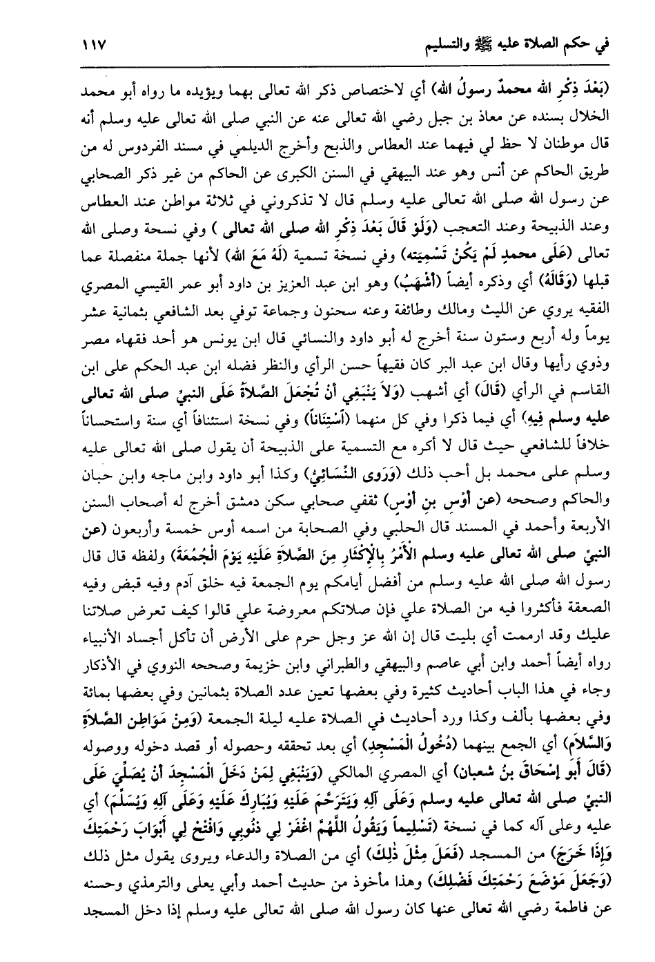 (بعد ذكر الله محمد رسول الله) أي لاختصاص ذكر الله تعالى بهما ويؤيده ما رواه أبو محمد الخلال بسنده عن معاذ بن جبل رضي الله تعالى عنه عن النبي صلى الله تعالى عليه وسلم أنه قال موطنان لا حظ لي فيهما عند العطاس والذبح وأخرج الديلمي في مسند الفردوس له من طريق الحاكم عن أنس وهو عند البيهقي في السنن الكبرى عن الحاكم من غير ذكر الصحابي عَنْ رَسُولِ اللَّهِ صَلَّى اللَّهُ تَعَالَى عَلَيْهِ وسلم قال لا تذكروني في ثلاثة مواطن عند العطاس وعند الذبيحة وعند التعجب (وَلَوْ قَالَ بَعْدَ ذِكْرِ اللَّهِ صَلَّى اللَّهُ تعالى) وفي نسخة وصلى الله تعالى (على محمد لم يكن تسميته) وفي نسخة تسمية (له مع الله) لأنها جملة منفصلة عما قبلها (وقاله) أي وذكره أيضا (أشهب) وهو ابن عبد العزيز بن داود أبو عمر القيسي المصري الفقيه يروي عن الليث ومالك وطائفة وعنه سحنون وجماعة توفي بعد الشافعي بثمانية عشر يوما وله أربع وستون سنة أخرج له أبو داود والنسائي قال ابن يونس هو أحد فقهاء مصر وذوي رأيها وقال ابن عبد البر كان فقيها حسن الرأي والنظر فضله ابن عبد الحكم على ابن القاسم في الرأي (قال) أي أشهب (وَلَا يَنْبَغِي أَنْ تُجْعَلَ الصَّلَاةُ عَلَى النَّبِيِّ صلى الله تعالى عليه وسلم فيه) أي فيما ذكرا وفي كل منهما (استنانا) وفي نسخة استئنافا أي سنة واستحسانا خلافا للشافعي حيث قال لا أكره مع التسمية على الذبيحة أن يقول صلى الله تعالى عليه وسلم على محمد بل أحب ذلك (وروى النّسائيّ) وكذا أبو داود وابن ماجه وابن حبان والحاكم وصححه (عن أوس بن أوس) ثقفي صحابي سكن دمشق أخرج له أصحاب السنن الأربعة وأحمد في المسند قال الحلبي وفي الصحابة من اسمه أوس خمسة وأربعون (عن النبيّ صلى الله تعالى عَلَيْهِ وَسَلَّمَ الْأَمْرَ بِالْإِكْثَارِ مِنَ الصَّلَاةِ عَلَيْهِ يوم الجمعة) ولفظه قال قال رسول الله صلى الله تعالى عليه وسلم من أفضل أيامكم يوم الجمعة فيه خلق آدم وفيه قبض وفيه الصعقة فأكثروا فيه من الصلاة علي فإن صلاتكم معروضة علي قالوا كيف تعرض صلاتنا عليك وقد ارممت أي بليت قال إن الله عز وجل حرم على الأرض أن تأكل أجساد الأنبياء رواه أيضا أحمد وابن أبي عاصم والبيهقي والطبراني وابن خزيمة وصححه النووي في الأذكار وجاء في هذا الباب أحاديث كثيرة وفي بعضها تعين عدد الصلاة بثمانين وفي بعضها بمائة وفي بعضها بألف وكذا ورد أحاديث في الصلاة عليه ليلة الجمعة (ومن مواطن الصّلاة والسّلام) أي الجمع بينهما (دخول المسجد) أي بعد تحققه وحصوله أو قصد دخوله ووصوله (قال أبو إسحاق بن شعبان) أي المصري المالكي (وَيَنْبَغِي لِمَنْ دَخَلَ الْمَسْجِدَ أَنْ يُصَلِّيَ عَلَى النبيّ صلى الله تعالى عليه وسلم وعلى آله ويترحّم عليه ويبارك عليه وعلى آله ويسلّم) أي عليه وعلى آله كما في نسخة (تَسْلِيمًا وَيَقُولُ اللَّهُمَّ اغْفِرْ لِي ذُنُوبِي وَافْتَحْ لي أبواب رحمتك وإذا خرج) من المسجد (فعل مثل ذلك) أي من الصلاة والدعاء ويروى يقول مثل ذلك (وجعل موضع رحمتك فضلك) وهذا مأخوذ من حديث أحمد وأبي يعلى والترمذي وحسنه عن فاطمة رضي الله تعالى عنها كان رسول الله صلى الله تعالى عَلَيْهِ وَسَلَّمَ إِذَا دَخَلَ الْمَسْجِدَ