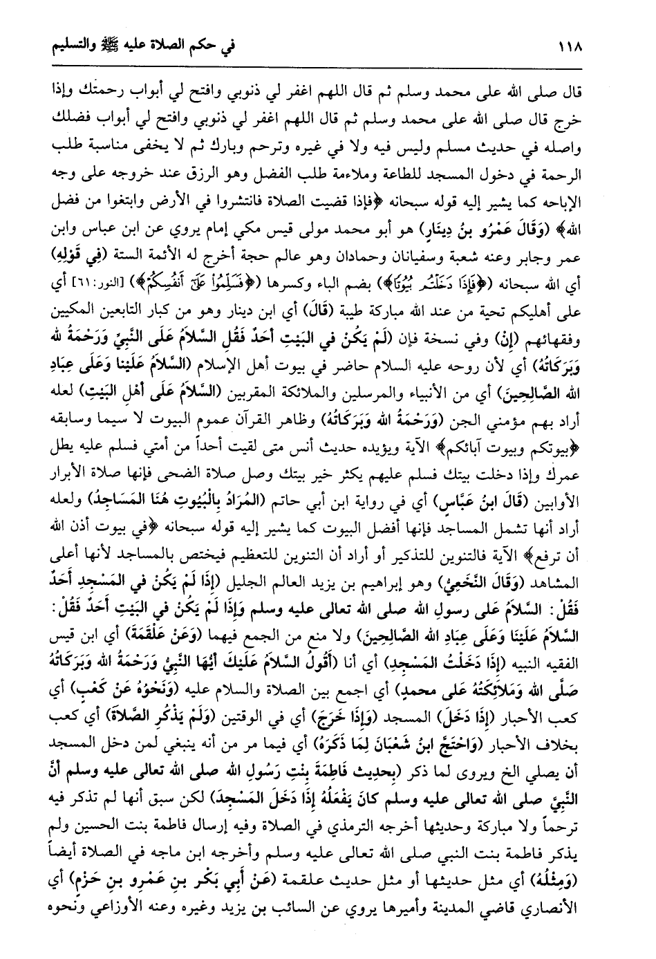 قَالَ صَلَّى اللَّهُ عَلَى مُحَمَّدٍ وَسَلَّمَ ثُمَّ قال اللَّهُمَّ اغْفِرْ لِي ذُنُوبِي وَافْتَحْ لِي أَبْوَابَ رحمتك وإذا خرج قَالَ صَلَّى اللَّهُ عَلَى مُحَمَّدٍ وَسَلَّمَ ثُمَّ قال اللَّهُمَّ اغْفِرْ لِي ذُنُوبِي وَافْتَحْ لِي أَبْوَابَ فضلك واصله في حديث مسلم وليس فيه ولا في غيره وترحم وبارك ثم لا يخفى مناسبة طلب الرحمة في دخول المسجد للطاعة وملاءمة طلب الفضل وهو الرزق عند خروجه على وجه الإباحه كما يشير إليه قوله سبحانه فَإِذا قُضِيَتِ الصَّلاةُ فَانْتَشِرُوا فِي الْأَرْضِ وَابْتَغُوا مِنْ فَضْلِ اللَّهِ (وقال عمرو بن دينار) هو أبو محمد مولى قيس مكي إمام يروي عن ابن عباس وابن عمر وجابر وعنه شعبة وسفيانان وحمادان وهو عالم حجة أخرج له الأئمة الستة (في قوله) أي الله سبحانه (فَإِذا دَخَلْتُمْ بُيُوتاً) بضم الباء وكسرها (فَسَلِّمُوا عَلى أَنْفُسِكُمْ) [النور: 61] أي على أهليكم تحية من عند الله مباركة طيبة (قال) أي ابن دينار وهو من كبار التابعين المكيين وفقهائهم (إن) وفي نسخة فإن (لَمْ يَكُنْ فِي الْبَيْتِ أَحَدٌ فَقُلْ السَّلَامُ على النّبيّ ورحمة لله وبركاته) أي لأن روحه عليه السلام حاضر في بيوت أهل الإسلام (السّلام علينا وعلى عباد الله الصّالحين) أي من الأنبياء والمرسلين والملائكة المقربين (السّلام على أهل البيت) لعله أراد بهم مؤمني الجن (ورحمة الله وبركاته) وظاهر القرآن عموم البيوت لا سيما وسابقه بُيُوتِكُمْ أَوْ بُيُوتِ آبائِكُمْ الآية ويؤيده حديث أنس متى لقيت أحدا من أمتي فسلم عليه يطل عمرك وإذا دخلت بيتك فسلم عليهم يكثر خير بيتك وصل صلاة الضحى فإنها صلاة الأبرار الأوابين (قال ابن عبّاس) أي في رواية ابن أبي حاتم (المراد بالبيوت هنا المساجد) ولعله أراد أنها تشمل المساجد فإنها أفضل البيوت كما يشير إليه قوله سبحانه فِي بُيُوتٍ أَذِنَ اللَّهُ أَنْ تُرْفَعَ الآية فالتنوين للتذكير أو أراد أن التنوين للتعظيم فيختص بالمساجد لأنها أعلى المشاهد (وقال النّخعي) وهو إبراهيم بن يزيد العالم الجليل (إِذَا لَمْ يَكُنْ فِي الْمَسْجِدِ أَحَدٌ فَقُلْ: السّلام على رسول الله صلى الله تعالى عَلَيْهِ وَسَلَّمَ وَإِذَا لَمْ يَكُنْ فِي الْبَيْتِ أَحَدٌ فَقُلْ: