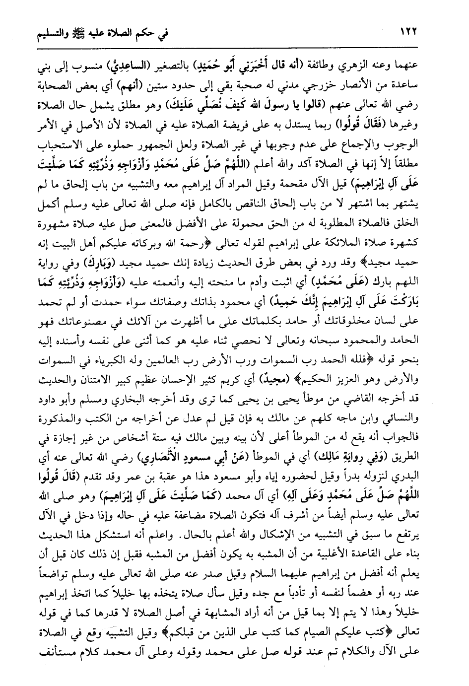 عنهما وعنه الزهري وطائفة (أنه قال أخبرني أبو حميد) بالتصغير (الساعديّ) منسوب إلى بني ساعدة من الأنصار خزرجي مدني له صحبة بقي إلى حدود ستين (أنهم) أي بعض الصحابة رضي الله تعالى عنهم (قَالُوا يَا رَسُولَ اللَّهِ كَيْفَ نُصَلِّي عَلَيْكَ) وهو مطلق يشمل حال الصلاة وغيرها (فقال قولوا) ربما يستدل به على فريضة الصلاة عليه في الصلاة لأن الأصل في الأمر الوجوب والإجماع على عدم وجوبها في غير الصلاة ولعل الجمهور حملوه على الاستحباب مطلقا إلّا إنها في الصلاة آكد والله أعلم (اللَّهُمَّ صَلِّ عَلَى مُحَمَّدٍ وَأَزْوَاجِهِ وَذُرِّيَّتِهِ كَمَا صلّيت على آل إبراهيم) قيل الآل مقحمة وقيل المراد آل إبراهيم معه والتشبيه من باب إلحاق ما لم يشتهر بما اشتهر لا من باب إلحاق الناقص بالكمال فإنه صلى الله تعالى عليه وسلم أكمل الخلق فالصلاة المطلوبة له من الحق محمولة على الأفضل فالمعنى صل عليه صلاة مشهورة كشهرة صلاة الملائكة على إبراهيم لقوله تعالى رَحْمَتُ اللَّهِ وَبَرَكاتُهُ عَلَيْكُمْ أَهْلَ الْبَيْتِ إِنَّهُ حَمِيدٌ مَجِيدٌ وقد ورد في بعض طرق الحديث زيادة إنك حميد مجيد (وبارك) وفي رواية اللهم بارك (على محمّد) أي اثبت وأدم ما منحته إليه وأنعمته عليه (وَأَزْوَاجِهِ وَذُرِّيَّتِهِ كَمَا بَارَكْتَ عَلَى آلِ إِبْرَاهِيمَ إنّك حميد) أي محمود بذاتك وصفاتك سواء حمدت أو لم تحمد على لسان مخلوقاتك أو حامد بكلماتك على ما أظهرت من آلائك في مصنوعاتك فهو الحامد والمحمود سبحانه وتعالى لا نحصي ثناء عليه هو كما أثنى على نفسه وأسنده إليه بنحو قوله فَلِلَّهِ الْحَمْدُ رَبِّ السَّماواتِ وَرَبِّ الْأَرْضِ رَبِّ الْعالَمِينَ وَلَهُ الْكِبْرِياءُ فِي السَّماواتِ وَالْأَرْضِ وَهُوَ الْعَزِيزُ الْحَكِيمُ (مجيد) أي كريم كثير الإحسان عظيم كبير الامتنان والحديث قد أخرجه القاضي من موطأ يحيى بن يحيى كما ترى وقد أخرجه البخاري ومسلم وأبو داود والنسائي وابن ماجه كلهم عن مالك به فإن قيل لم عدل عن أخراجه من الكتب والمذكورة فالجواب أنه يقع له من الموطأ أعلى لأن بينه وبين مالك فيه ستة أشخاص من غير إجازة في الطريق (وفي رواية مالك) أي في الموطأ (عن أبي مسعود الأنصاري) رضي الله تعالى عنه أي البدري لنزوله بدرا وقيل لحضوره إياه وأبو مسعود هذا هو عقبة بن عمر وقد تقدم (قَالَ قُولُوا اللَّهُمَّ صَلِّ عَلَى مُحَمَّدٍ وَعَلَى آله) أي آل محمد (كما صلّيت على آل إبراهيم) وهو صلى الله تعالى عليه وسلم أيضا من أشرف آله فتكون الصلاة مضاعفة عليه في حاله وإذا دخل في الآل يرتفع ما سبق في التشبيه من الإشكال والله أعلم بالحال. واعلم أنه استشكل هذا الحديث بناء على القاعدة الأغلبية من أن المشبه به يكون أفضل من المشبه فقبل إن ذلك كان قبل أن يعلم أنه أفضل من إبراهيم عليهما السلام وقيل صدر عنه صلى الله تعالى عليه وسلم تواضعا عند ربه أو هضما لنفسه أو تأدبا مع جده وقيل سأل صلاة يتخذه بها خليلا كما اتخذ إبراهيم خليلا وهذا لا يتم إلا بما قيل من أنه أراد المشابهة في أصل الصلاة لا قدرها كما في قوله تعالى كُتِبَ عَلَيْكُمُ الصِّيامُ كَما كُتِبَ عَلَى الَّذِينَ مِنْ قَبْلِكُمْ وقيل التشبيه وقع في الصلاة على الآل والكلام تم عند قوله صل على محمد وقوله وعلى آل محمد كلام مستأنف
