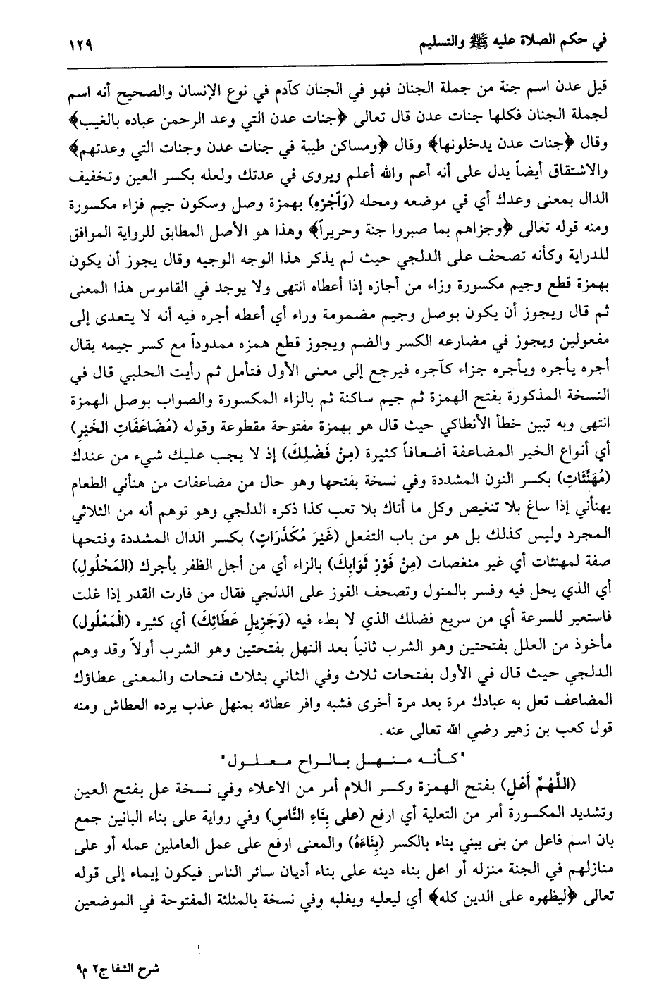 قيل عدن اسم جنة من جملة الجنان فهو في الجنان كآدم في نوع الإنسان والصحيح أنه اسم لجملة الجنان فكلها جنات عدن قال تعالى جَنَّاتِ عَدْنٍ الَّتِي وَعَدَ الرَّحْمنُ عِبادَهُ بِالْغَيْبِ وقال جَنَّاتُ عَدْنٍ يَدْخُلُونَها وقال وَمَساكِنَ طَيِّبَةً فِي جَنَّاتِ عَدْنٍ وجَنَّاتِ عَدْنٍ الَّتِي وَعَدْتَهُمْ والاشتقاق أيضا يدل على أنه أعم والله أعلم ويروى في عدتك ولعله بكسر العين وتخفيف الدال بمعنى وعدك أي في موضعه ومحله (واجزه) بهمزة وصل وسكون جيم فزاء مكسورة ومنه قوله تعالى وَجَزاهُمْ بِما صَبَرُوا جَنَّةً وَحَرِيراً وهذا هو الأصل المطابق للرواية الموافق للدراية وكأنه تصحف على الدلجي حيث لم يذكر هذا الوجه الوجيه وقال يجوز أن يكون بهمزة قطع وجيم مكسورة وزاء من أجازه إذا أعطاه انتهى ولا يوجد في القاموس هذا المعنى ثم قال ويجوز أن يكون بوصل وجيم مضمومة وراء أي أعطه أجره فيه أنه لا يتعدى إلى مفعولين ويجوز في مضارعه الكسر والضم ويجوز قطع همزه ممدودا مع كسر جيمه يقال أجره يأجره ويأجره جزاء كآجره فيرجع إلى معنى الأول فتأمل ثم رأيت الحلبي قال في النسخة المذكورة بفتح الهمزة ثم جيم ساكنة ثم بالزاء المكسورة والصواب بوصل الهمزة انتهى وبه تبين خطأ الأنطاكي حيث قال هو بهمزة مفتوحة مقطوعة وقوله (مضاعفات الخير) أي أنواع الخير المضاعفة أضعافا كثيرة (من فضلك) إذ لا يجب عليك شيء من عندك (مهنّئات) بكسر النون المشددة وفي نسخة بفتحها وهو حال من مضاعفات من هنأني الطعام يهنأني إذا ساغ بلا تنغيص وكل ما أتاك بلا تعب كذا ذكره الدلجي وهو توهم أنه من الثلاثي المجرد وليس كذلك بل هو من باب التفعل (غير مكدّرات) بكسر الدال المشددة وفتحها صفة لمهنئات أي غير منغصات (من فوز ثوابك) بالزاء أي من أجل الظفر بأجرك (المحلول) أي الذي يحل فيه وفسر بالمنول وتصحف الفوز على الدلجي فقال من فارت القدر إذا غلت فاستعير للسرعة أي من سريع فضلك الذي لا بطء فيه (وجزيل عطائك) أي كثيره (المعلول) مأخوذ من العلل بفتحتين وهو الشرب ثانيا بعد النهل بفتحتين وهو الشرب أولا وقد وهم الدلجي حيث قال في الأول بفتحات ثلاث وفي الثاني بثلاث فتحات والمعنى عطاؤك المضاعف تعل به عبادك مرة بعد مرة أخرى فشبه وافر عطائه بمنهل عذب يرده العطاش ومنه قول كعب بن زهير رضي الله تعالى عنه.