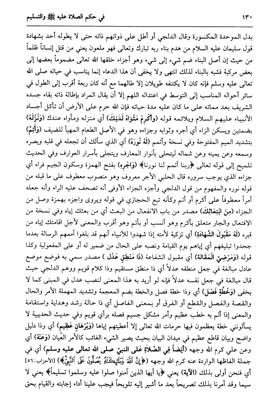 بدل الموحدة المكسورة وقال الدلجي أو أطل على ذواتهم ذاته حتى لا يطوله أحد بشهادة قول سليمان عليه السلام من هدم بناء ربه تبارك وتعالى فهو ملعون يعني من قتل إنسانا ظلما من حيث إن أصل البناء ضم شيء إلى شيء وهو أجزاء خلقها الله تعالى مضموما بعضها إلى بعض مركبة فشبه بالبناء لذلك انتهى ولا يخفى أن هذا الدعاء إنما يناسب في حياته صلى الله تعالى عليه وسلم فإنه كان لا يكتنفه طويلان إلا طالهما مع أنه كان ربعة أقرب إلى الطول في سائر أحواله المناسب إلى التوسط في اعتداله اللهم إلا أن يقال المراد بإطالة ذاته بقاء جسده الشريف بعد مماته على ما كان عليه مدة حياته فإن الله حرم على الأرض أن تأكل أجساد الأنبياء عليهم السلام ويلائمه قوله (وأكرم مثواه لديك) أي منزله ومأواه عندك (ونزله) بضمتين ويسكن الزاء أي أجره وثوابه وجزاءه وهو في الأصل الطعام المهيأ للضيف (وأتمّ) بتشديد الميم المفتوحة وفي نسخة وأتمم (له نوره) أي الذي سألك أن تجعله في قلبه وبصره وسمعه وعن يمينه وعن شماله ليتحلى بأنوار المعارف ويتجلى بأسرار العوارف وفي الحديث تلميح إلى قوله تعالى رَبَّنا أَتْمِمْ لَنا نُورَنا (واجره) بفتح الهمزة وسكون الجيم فراء أي جزاءه الذي يوجب سروره قال الحلبي الأجر معروف وهو منصوب معطوف على ما قبله من قوله نوره والمفهوم من قول الدلجي وأجزه الجزاء الأوفى أنه تصحف عليه الراء وأنه جعله أمرا معطوفا على أكرم أو أتم وكأنه تبع الحجازي في قوله ويروى واجزه بهمزة وصل من الجزاء (من ابتعاثك) مصدر من باب الانفعال من البعث أي من بعثك إياه وفي نسخة من الافتعال والجار متعلق بأكرم وهو أنسب أو بأتم وهو أقرب والمعنى لأجل اقامتك إياه من قبره (له مقبول الشّهادة) أي تزكية لأمته إذا شهدوا للأنبياء أنهم قد بلغوا أممهم الرسالة بعد ما جحدوا تبليغهم أي إياهم يوم القيامة ونصبه على الحال من ضمير له أو على المفعولية وكذا قوله (ومرضيّ المقالة) أي مقبول الشفاعة (ذا منطق عدل) مصدر سمي به فوضع موضع عادل مبالغة في جعل منطقه عدلا أي ذا منطق مستقيم وذا كلام قويم ووهم الدلجي حيث قال مبالغة في جعل نفسه عدلا فإنه لو أريد به هذا المعنى لنصب عدل في المبنى كما لا يخفى (وخطّة فصل) أي وذا خطة فصل والخطة بضم المعجمة وتشديد المهملة الأمر والحال والقصة والفصل والقطع أو الفرق أو بمعنى الفاصل أي ذا حالة رشد وهداية واستقامة والمعنى إذا ألم به خطب عظيم وأمر مشكل جسيم فصله برأي قويم وفي حديث الحديبية لا يسألونني خطة يعظمون فيها حرمات الله تعالى إلا أعطيتهم إياها (وبرهان عظيم) أي وذا دليل واضح وبيان قاطع عظيم في ميدان البيان بحيث يصير الشيء الغائب كالأمر العيان (وعنه) أي وعن علي كرم الله وجهه (أَيْضًا فِي الصَّلَاةِ عَلَى النَّبِيِّ صَلَّى اللَّهُ تعالى عليه وسلم) أي في جملة الفاظها الواردة عنه كرم الله وجهه (إِنَّ اللَّهَ وَمَلائِكَتَهُ يُصَلُّونَ عَلَى النَّبِيِّ) [الْأَحْزَابِ: 56] أي فنحن أولى بذلك (الآية) يعني يا أَيُّهَا الَّذِينَ آمَنُوا صَلُّوا عَلَيْهِ وَسَلِّمُوا تَسْلِيماً يعني لا سيما وقد أمرنا بذلك تصريحا بعد ما أشير إليه تلويحا فيجب علينا أداء إجابته والقيام بحق