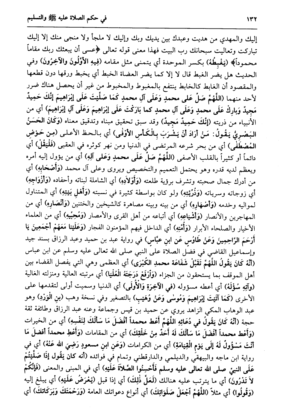 إليك والمهدي من هديت وعبدك بين يديك وبك وَإِلَيْكَ لَا مَلْجَأَ وَلَا مَنْجَى مِنْكَ إِلَّا إليك تباركت وتعاليت سبحانك رب البيت فهذا معنى قوله تَعَالَى عَسى أَنْ يَبْعَثَكَ رَبُّكَ مَقاماً مَحْمُوداً (يغبطه) بكسر الموحدة أي يتمنى مثل مقامه (فيه الأوّلون والآخرون) وفي الحديث هل يضر الغبط قال لا إلا كما يضر العضاة الخبط أي يخبط ورقها دون قطعها والمقصود أن الغابط كالخابط ينتفع بالمغبوط والمخبوط من غير أن يحصل هناك ضرر لأحد منهما (اللَّهُمَّ صَلِّ عَلَى مُحَمَّدٍ وَآلِ مُحَمَّدٍ كَمَا صَلَّيْتَ عَلَى إِبْرَاهِيمَ إِنَّكَ حَمِيدٌ مَجِيدٌ وَبَارِكْ عَلَى مُحَمَّدٍ وَعَلَى آلِ مُحَمَّدٍ كَمَا بَارَكْتَ على إبراهيم وعلى آل إبراهيم) أي من الأنبياء من ذريته (إنّك حميد مجيد) وقد سبق تحقيق مبناه وتدقيق معناه (وَكَانَ الْحَسَنُ الْبَصْرِيُّ يَقُولُ: مَنْ أَرَادَ أَنْ يشرب بالكأس الأوفى) أي بالحظ الأعلى (من حوض المصطفى) أي من بحر شرعه المرتضى في الدنيا ومن نهر كوثره في العقبى (فليقل) أي دائما أو كثيرا بالقلب الأصفى (اللهمّ صلّ على محمد وعلى آله) أي من يؤول إليه أمره ويعظم لديه قدره وهو يحتمل التعميم والتخصيص ويروى وعلى آل محمد (وأصحابه) أي من أدرك جمال صحبته وتشرف برؤية طلعته (وأولاده) أي الشاملة لبناته وأحفاده (وأزواجه) أي زوجاته وسرياته (وذرّيّته) ولو كان بواسطة كثيرة في نسبته (وأهل بيته) أي المتناول لمواليه وخدمه (وأصهاره) أي من بينه وبينه مصاهرة كالشيخين والختنين (وأنصاره) أي من المهاجرين والأنصار (وأشياعه) أي أتباعه من أهل القرى والأمصار (ومحبّيه) أي من العلماء الأخيار والصلحاء الأبرار (وأمّته) أي الداخل فيهم المؤمنون الفجار (وَعَلَيْنَا مَعَهُمْ أَجْمَعِينَ يَا أَرْحَمَ الرَّاحِمِينَ وَعَنْ طاوس عن ابن عبّاس) في رواية عبد بن حميد وعبد الرزاق بسند جيد وإسماعيل القاضي في فضل الصلاة على النبي صلى الله تعالى عليه وسلم عَنِ ابْنِ عَبَّاسٍ (أَنَّهُ كَانَ يَقُولُ اللَّهُمَّ تقبّل شفاعة محمد الكبرى) أي العظمى وهي التي يفصل القضاء بين أهل الموقف بما يستحقون من الجزاء (وارفع درجته العليا) أي مرتبته العالية ومنزلته الغالية (وآته سؤله) أي أعطه مسؤوله (في الآخرة والأولى) أي الدنيا وسميت أولى لتقدمها على الأخرى (كما آتيت إبراهيم وموسى وعن وهيب) بالتصغير وفي نسخة وهب (بن الورد) وهو عبد الوهاب المكي الزاهد يروي عن حميد بن قيس وجماعة وعنه عبد الرزاق وطائفة ثقة حجة (أَنَّهُ كَانَ يَقُولُ فِي دُعَائِهِ اللَّهُمَّ أَعْطِ محمدا أفضل ما سألك لنفسه) أي من الخيرات (وَأَعْطِ مُحَمَّدًا أَفْضَلَ مَا سَأَلَكَ لَهُ أَحَدٌ من خلقك) أي من المقامات (وأعط محمدا أفضل ما أنت مسؤول له إلى يوم القيامة) أي من الكرامات (وعن ابن مسعود رضي الله عنه) أي في رواية ابن ماجه والبيهقي والديلمي والدارقطني وتمام في فوائده (أَنَّهُ كَانَ يَقُولُ إِذَا صَلَّيْتُمْ عَلَى النَّبِيِّ صلى الله تعالى عليه وسلم فأحسنوا الصّلاة عليه) أي في المبنى والمعنى (فإنّكم لا تدرون) أي ما يترتب عليه هنالك (لعلّ ذلك) أي إذا قبل (يعرض عليه) أي يبلغ إليه (وقولوا) أي مثلا (اللهمّ اجعل صلواتك) أي أنواع دعواتك العامة (ورحمتك وبركاتك) أي