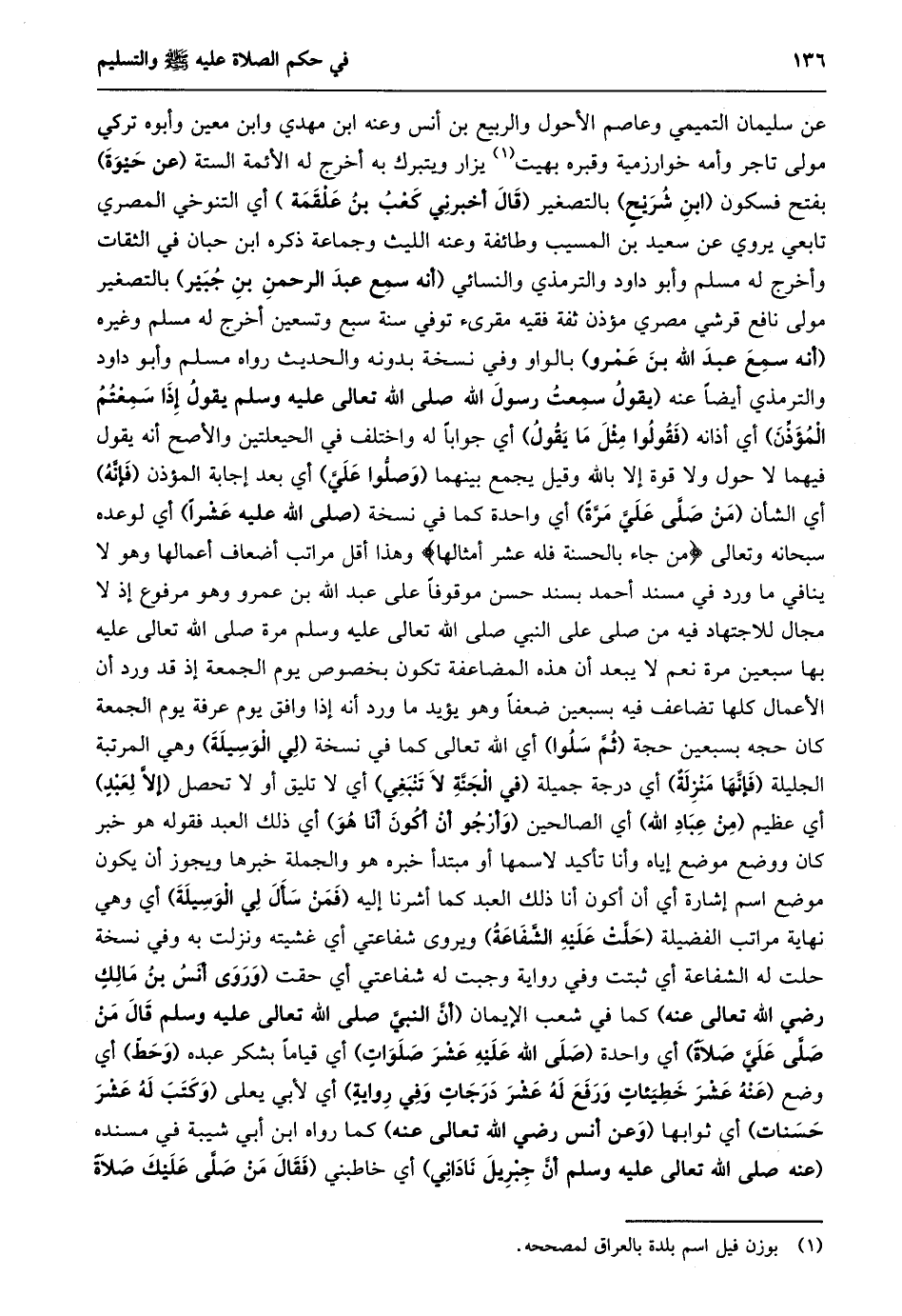 عن سليمان التميمي وعاصم الأحوال والربيع بن أنس وعنه ابن مهدي وابن معين وأبوه تركي مولى تاجر وأمه خوارزمية وقبره بهيت «1» يزار ويتبرك به أخرج له الأئمة الستة (عن حيوة) بفتح فسكون (ابن شريح) بالتصغير (قال أخبرني كعب بن علقمة) أي التنوخي المصري تابعي يروي عن سعيد بن المسيب وطائفة وعنه الليث وجماعة ذكره ابن حبان في الثقات وأخرج له مسلم وأبو داود والترمذي والنسائي (أنه سمع عبد الرحمن بن جبير) بالتصغير مولى نافع قرشي مصري مؤذن ثفة فقيه مقرىء توفي سنة سبع وتسعين أخرج له مسلم وغيره (أنه سمع عبد الله بن عمرو) بالواو وفي نسخة بدونه والحديث رواه مسلم وأبو داود والترمذي أيضا عنه (يقول سمعت رسول الله صلى الله تعالى عليه وسلم يقول إذا سمعتم المؤذّن) أي أذانه (فقولوا مثل ما يقول) أي جوابا له واختلف في الحيعلتين والأصح أنه يقول فيهما لا حول ولا قوة إلا بالله وقيل يجمع بينهما (وصلّوا عليّ) أي بعد إجابة المؤذن (فإنّه) أي الشأن (من صلّى عليّ مرّة) أي واحدة كما في نسخة (صلى الله عليه عشرا) أي لوعده سبحانه وتعالى مَنْ جاءَ بِالْحَسَنَةِ فَلَهُ عَشْرُ أَمْثالِها وهذا أقل مراتب أضعاف أعمالها وهو لا ينافي ما ورد في مسند أحمد بسند حسن موقوفا على عبد الله بن عمرو وهو مرفوع إذ لا مجال للاجتهاد فيه من صلى على النبي صلى الله تعالى عليه وسلم مرة صلى الله تعالى عليه بها سبعين مرة نعم لا يبعد أن هذه المضاعفة تكون بخصوص يوم الجمعة إذ قد ورد أن الأعمال كلها تضاعف فيه بسبعين ضعفا وهو يؤيد ما ورد أنه إذا وافق يوم عرفة يوم الجمعة كان حجه بسبعين حجة (ثمّ سلوا) أي الله تعالى كما في نسخة (لي الوسيلة) وهي المرتبة الجليلة (فإنّها منزلة) أي درجة جميلة (في الجنّة لا تنبغي) أي لا تليق أو لا تحصل (إلّا لعبد) أي عظيم (من عباد الله) أي الصالحين (وأرجو أن أكون أنا هو) أي ذلك العبد فقوله هو خبر كان ووضع موضع إياه وأنا تأكيد لاسمها أو مبتدأ خبره هو والجملة خبرها ويجوز أن يكون موضع اسم إشارة أي أن أكون أنا ذلك العبد كما أشرنا إليه (فمن سأل لي الوسيلة) أي وهي نهاية مراتب الفضيلة (حلّت عليه الشّفاعة) ويروى شفاعتي أي غشيته ونزلت به وفي نسخة حلت له الشفاعة أي ثبتت وفي رواية وجبت له شفاعتي أي حقت (وروى أنس بن مالك رضي الله تعالى عنه) كما في شعب الإيمان (أنّ النبيّ صلى الله تعالى عَلَيْهِ وَسَلَّمَ قَالَ مَنْ صَلَّى عَلَيَّ صَلَاةً) أي واحدة (صلى الله عليه عشر صلوات) أي قياما بشكر عبده (وحطّ) أي وضع (عَنْهُ عَشْرَ خَطِيئَاتٍ وَرَفَعَ لَهُ عَشْرَ دَرَجَاتٍ وفي رواية) أي لأبي يعلى (وكتب له عشر حسنات) أي ثوابها (وعن أنس رضي الله تعالى عنه) كما رواه ابن أبي شيبة في مسنده (عنه صلى الله تعالى عليه وسلم أنّ جبريل ناداني) أي خاطبني (فقال من صلّى عليك صلاة