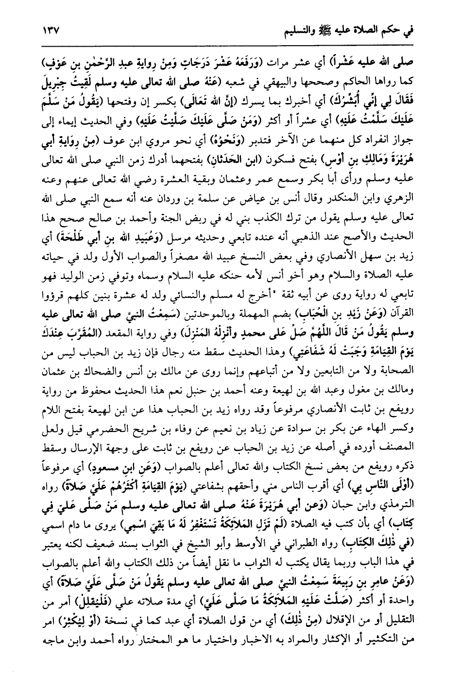 صلى الله عليه عشرا) أي عشر مرات (وَرَفَعَهُ عَشْرَ دَرَجَاتٍ وَمِنْ رِوَايَةِ عَبْدِ الرَّحْمَنِ بن عوف) كما رواها الحاكم وصححها والبيهقي في شعبه (عنه صلى الله تعالى عَلَيْهِ وَسَلَّمَ لَقِيتُ جِبْرِيلَ فَقَالَ لِي إِنِّي أبشّرك) أي أخبرك بما يسرك (إنّ الله تعالى) بكسر إن وفتحها (يقول من سلّم عليك سلّمت عليه) أي عشرا أو أكثر (ومن صلّى عليك صلّيت عليه) وفي الحديث إيماء إلى جواز انفراد كل منهما عن الآخر فتدبر (ونحوه) أي نحو مروي ابن عوف (مِنْ رِوَايَةِ أَبِي هُرَيْرَةَ وَمَالِكِ بْنِ أَوْسِ) بفتح فسكون (ابن الحدثان) بفتحهما أدرك زمن النبي صلى الله تعالى عليه وسلم ورأى أبا بكر وسمع عمر وعثمان وبقية العشرة رضي الله تعالى عنهم وعنه الزهري وابن المنكدر وقال أنس بن عياض عن سلمة بن وردان عنه أنه سمع النبي صلى الله تعالى عليه وسلم يقول من ترك الكذب بني له في ربض الجنة وأحمد بن صالح صحح هذا الحديث والأصح عند الذهبي أنه عنده تابعي وحديثه مرسل (وعبيد الله بن أبي طلحة) أي زيد بن سهل الأنصاري وفي بعض النسخ عبيد الله مصغرا والصواب الأول ولد في حياته عليه الصلاة والسلام وهو أخو أنس لأمه حنكه عليه السلام وسماه وتوفي زمن الوليد فهو تابعي له رواية روى عن أبيه ثقة أخرج له مسلم والنسائي ولد له عشرة بنين كلهم قرؤوا القرآن (وعن زيد بن الحباب) بضم المهملة وبالموحدتين (سمعت النبيّ صلى الله تعالى عَلَيْهِ وَسَلَّمَ يَقُولُ مَنْ قَالَ اللَّهُمَّ صَلِّ على محمد وأنزله المنزل) وفي رواية المقعد (الْمُقَرَّبَ عِنْدَكَ يَوْمَ الْقِيَامَةِ وَجَبَتْ لَهُ شَفَاعَتِي) وهذا الحديث سقط منه رجال فإن زيد بن الحباب ليس من الصحابة ولا من التابعين ولا من أتباعهم وإنما روى عن مالك بن أنس والضحاك بن عثمان ومالك بن مغول وعبد الله بن لهيعة وعنه أحمد بن حنبل نعم هذا الحديث محفوظ من رواية رويفع بن ثابت الأنصاري مرفوعا وقد رواه زيد بن الحباب هذا عن ابن لهيعة بفتح اللام وكسر الهاء عن بكر بن سوادة عن زياد بن نعيم عن وفاء بن شريح الحضرمي قيل ولعل المصنف أورده في أصله عن زيد بن الحباب عن رويفع بن ثابت على وجهة الإرسال وسقط ذكره رويفع من بعض نسخ الكتاب والله تعالى أعلم بالصواب (وعن ابن مسعود) أي مرفوعا (أولى النّاس بي) أي أقرب الناس مني وأحقهم بشفاعتي (يوم القيامة أكثرهم عليّ صلاة) رواه الترمذي وابن حبان (وعن أبي هريرة عنه صلى الله تعالى عَلَيْهِ وَسَلَّمَ مَنْ صَلَّى عَلَيَّ فِي كِتَابٍ) أي بأن كتب فيه الصلاة (لَمْ تَزَلِ الْمَلَائِكَةُ تَسْتَغْفِرُ لَهُ مَا بَقِيَ اسمي) يروى ما دام اسمي (في ذلك الكتاب) رواه الطبراني في الأوسط وأبو الشيخ في الثواب بسند ضعيف لكنه يعتبر في هذا الباب وربما يقال يكتب له الثواب ما نقل أيضا من ذلك الكتاب والله أعلم بالصواب (وَعَنْ عَامِرِ بْنِ رَبِيعَةَ سَمِعْتُ النَّبِيَّ صَلَّى الله تعالى عَلَيْهِ وَسَلَّمَ يَقُولُ مَنْ صَلَّى عَلَيَّ صَلَاةً) أي واحدة أو أكثر (صلّت عليه الملائكة ما صلّى عليّ) أي مدة صلاته علي (فليقلل) أمر من التقليل أو من الإقلال (من ذلك) أي من قول الصلاة أي عبد كما في نسخة (أو ليكثر) امر من التكثير أو الإكثار والمراد به الاخبار واختيار ما هو المختار رواه أحمد وابن ماجه