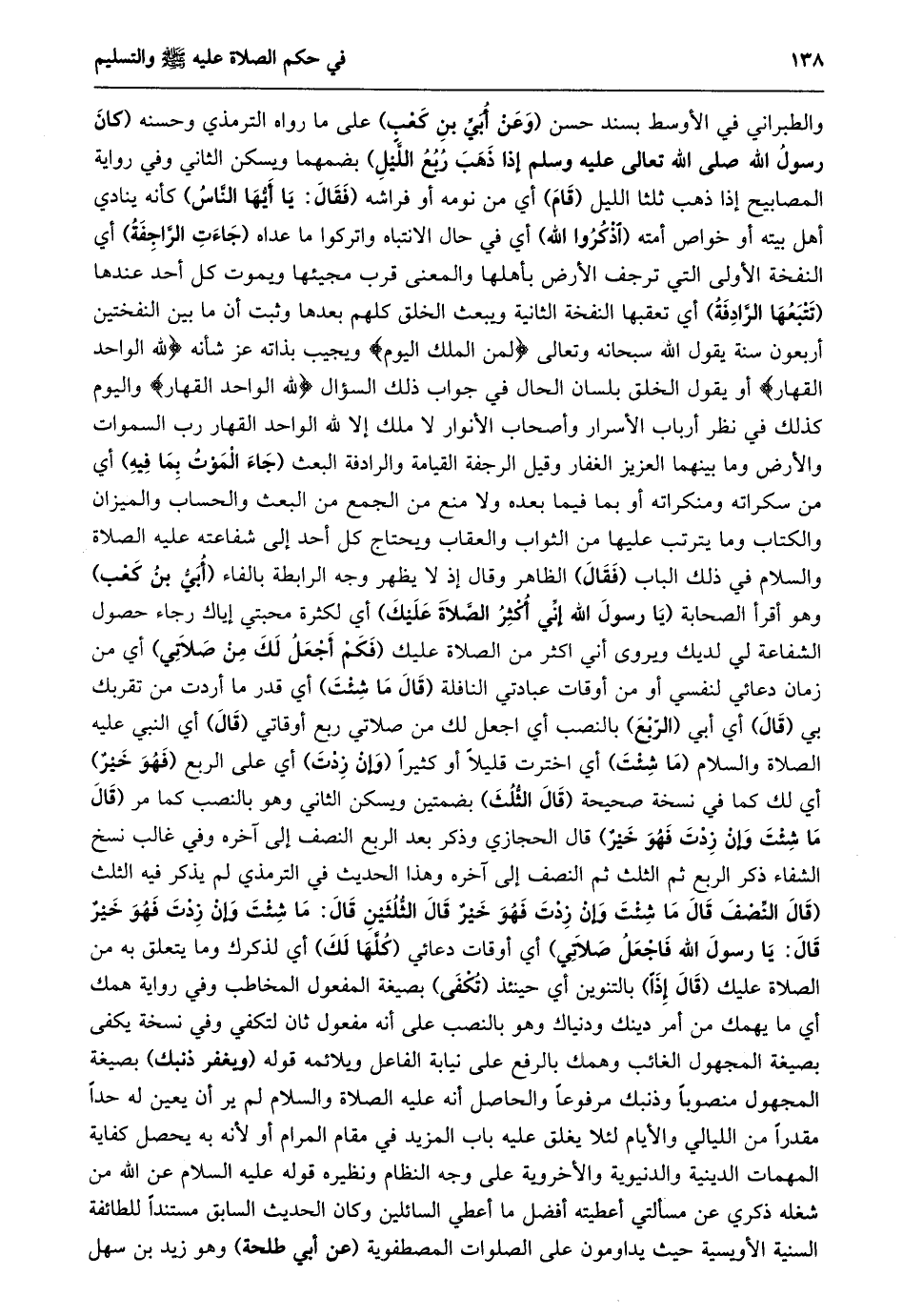 والطبراني في الأوسط بسند حسن (وعن أبيّ بن كعب) على ما رواه الترمذي وحسنه (كان رسول الله صلى الله تعالى عليه وسلم إذا ذهب ربع اللّيل) بضمهما ويسكن الثاني وفي رواية المصابيح إذا ذهب ثلثا الليل (قام) أي من نومه أو فراشه (فقال: يا أيّها النّاس) كأنه ينادي أهل بيته أو خواص أمته (اذكروا الله) أي في حال الانتباه واتركوا ما عداه (جاءت الرّاجفة) أي النفخة الأولى التي ترجف الأرض بأهلها والمعنى قرب مجيئها ويموت كل أحد عندها (تتبعها الرّادفة) أي تعقبها النفخة الثانية ويبعث الخلق كلهم بعدها وثبت أن ما بين النفختين أربعون سنة يقول الله سبحانه وتعالى لِمَنِ الْمُلْكُ الْيَوْمَ ويجيب بذاته عز شأنه لِلَّهِ الْواحِدِ الْقَهَّارِ أو يقول الخلق بلسان الحال في جواب ذلك السؤال لِلَّهِ الْواحِدِ الْقَهَّارِ واليوم كذلك في نظر أرباب الأسرار وأصحاب الأنوار لا ملك إلا لله الواحد القهار رب السموات والأرض وما بينهما العزيز الغفار وقيل الرجفة القيامة والرادفة البعث (جاء الموت بما فيه) أي من سكراته ومنكراته أو بما فيما بعده ولا منع من الجمع من البعث والحساب والميزان والكتاب وما يترتب عليها من الثواب والعقاب ويحتاج كل أحد إلى شفاعته عليه الصلاة والسلام في ذلك الباب (فقال) الظاهر وقال إذ لا يظهر وجه الرابطة بالفاء (أبيّ بن كعب) وهو أقرأ الصحابة (يَا رَسُولَ اللَّهِ إِنِّي أُكْثِرُ الصَّلَاةَ عَلَيْكَ) أي لكثرة محبتي إياك رجاء حصول الشفاعة لي لديك ويروى أني اكثر من الصَّلَاةَ عَلَيْكَ (فَكَمْ أَجْعَلُ لَكَ مِنْ صَلَاتِي) أي من زمان دعائي لنفسي أو من أوقات عبادتي النافلة (قال ما شئت) أي قدر ما أردت من تقربك بي (قال) أي أبي (الرّبع) بالنصب أي اجعل لك من صلاتي ربع أوقاتي (قال) أي النبي عليه الصلاة والسلام (ما شئت) أي اخترت قليلا أو كثيرا (وإن زدت) أي على الربع (فهو خير) أي لك كما في نسخة صحيحة (قال الثّلث) بضمتين ويسكن الثاني وهو بالنصب كما مر (قَالَ مَا شِئْتَ وَإِنْ زِدْتَ فَهُوَ خَيْرٌ) قال الحجازي وذكر بعد الربع النصف إلى آخره وفي غالب نسخ الشفاء ذكر الربع ثم الثلث ثم النصف إلى آخره وهذا الحديث في الترمذي لم يذكر فيه الثلث (قَالَ النِّصْفَ قَالَ مَا شِئْتَ وَإِنْ زِدْتَ فَهُوَ خَيْرٌ قَالَ الثُّلُثَيْنِ قَالَ: مَا شِئْتَ وَإِنْ زِدْتَ فَهُوَ خَيْرٌ قَالَ: يَا رَسُولَ الله فاجعل صلاتي) أي أوقات دعائي (كلّها لك) أي لذكرك وما يتعلق به من الصلاة عليك (قال إذا) بالتنوين أي حينئذ (تكفى) بصيغة المفعول المخاطب وفي رواية همك أي ما يهمك من أمر دينك ودنياك وهو بالنصب على أنه مفعول ثان لتكفي وفي نسخة يكفى بصيغة المجهول الغائب وهمك بالرفع على نيابة الفاعل ويلائمه قوله (ويغفر ذنبك) بصيغة المجهول منصوبا وذنبك مرفوعا والحاصل أنه عليه الصلاة والسلام لم ير أن يعين له حدا مقدرا من الليالي والأيام لئلا يغلق عليه باب المزيد في مقام المرام أو لأنه به يحصل كفاية المهمات الدينية والدنيوية والأخروية على وجه النظام ونظيره قوله عليه السلام عن الله من شغله ذكري عن مسألتي أعطيته أفضل ما أعطي السائلين وكان الحديث السابق مستندا للطائفة السنية الأويسية حيث يداومون على الصلوات المصطفوية (عن أبي طلحة) وهو زيد بن سهل