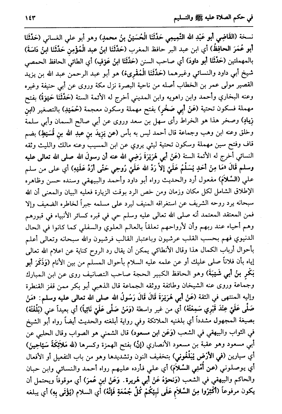 نسخة (القاضي أبو عَبْدُ اللَّهِ التَّمِيمِيُّ حَدَّثَنَا الْحُسَيْنُ بْنُ مُحَمَّدٍ) وهو أبو علي الغساني (حدّثنا أبو عمر الحافظ) أي ابن عبد البر حافظ المغرب (حَدَّثَنَا ابْنُ عَبْدِ الْمُؤْمِنِ حَدَّثَنَا ابْنُ دَاسَةَ) بالمهملتين (حدّثنا أبو داود) أي صاحب السنن (حدّثنا ابن عوف) أي الطائي الحافظ الحمصي شيخ أبي داود والنسائي وغيرهما (حدّثنا المقرىء) هو أبو عبد الرحمن عبد الله بن يزيد القصير مولى عمر بن الخطاب أصله من ناحية البصرة نزل مكة وروى عن أبي حنيفة وغيره وعنه البخاري وأحمد وابن راهويه وابن المديني أخرج له الأئمة الستة (حدّثنا حيوة) بفتح مهملة فسكون تحتية (عن أبي صخر) بفتح مهملة وسكون معجمة (حميد) بالتصغير (ابن زياد) وصخر هذا هو الخراط رأى سهل بن سعد وروى عن أبي صالح السمان وأبي سلمة وخلق وعنه ابن وهب وجماعة قال أحمد ليس به بأس (عن يزيد بن عبد الله بن قسيط) بضم قاف وفتح سين مهملة وسكون تحتية ليثي يروي عن ابن المسيب وعنه مالك والليث وثقه النسائي أخرج له الأئمة الستة (عَنْ أَبِي هُرَيْرَةَ رَضِيَ اللَّهُ عَنْهُ أَنَّ رسول الله صلى الله تعالى عَلَيْهِ وَسَلَّمَ قَالَ «مَا مِنْ أَحَدٍ يُسَلِّمُ عَلَيَّ إِلَّا رَدَّ اللَّهُ عَلَيَّ رُوحِي حَتَّى أردّ عليه) أي على من سلم علي (السّلام) مفعول أرد والحديث رواه أبو داود وأحمد والبيهقي وسنده حسن وظاهره الإطلاق الشامل لكل مكان وزمان ومن خص الرد بوقت الزيارة فعليه البيان والمعنى أن الله سبحانه يرد روحه الشريف عن استغراقه المنيف ليرد على مسلمه جبرا لخاطره الضعيف وإلا فمن المعتقد المعتمد أنه صلى الله تعالى عليه وسلم حي في قبره كسائر الأنبياء في قبورهم وهم أحياء عند ربهم وأن لأرواحهم تعلقا بالعالم العلوي والسلفي كما كانوا في الحال الدنيوي فهم بحسب القلب عرشيون وباعتبار القالب فرشيون والله سبحانه وتعالى أعلم بأحوال أرباب الكمال هذا وقال الأنطاكي يمكن أن يقال رد الروح كناية عن اعلام الله تعالى إياه بأن فلانا صلى عليك أو عن علمه عليه السلام بأحوال المسلم من بين الأنام (وذكر أبو بكر بن أبي شيبة) وهو الحافظ الكبير الحجة صاحب التصانيف روى عن ابن المبارك وجماعة وروى عنه الشيخان وطائفة ووثقه الجماعة قال الذهبي أبو بكر ممن قفز القنطرة وإليه المنتهى في الثقة (عَنْ أَبِي هُرَيْرَةَ قَالَ قَالَ رَسُولُ اللَّهِ صلى الله تعالى عَلَيْهِ وَسَلَّمَ: «مَنْ صَلَّى عَلَيَّ عِنْدَ قَبْرِي سمعته) أي من غير واسطة (ومن صلّى عليّ نائيا) أي بعيدا عني (بلّغته) بصيغة المجهول مشددا أي بلغنيه الملائكة وفي رواية أبلغته والحديث أيضا رواه أبو الشيخ في الثواب والبيهقي في الشعب (وعن ابن مسعود) قال الشمني هو الصواب وقال الحلبي عن أبي مسعود وهو عقبة بن مسعود الأنصاري (إنّ) بفتح الهمزة وكسرها (لله ملائكة سيّاحين) أي سيارين (في الأرض يبلّغوني) بتخفيف النون وتشديدها وهو من باب التفعيل أو الأفعال أي يوصلوني (عن أمّتي السّلام) أي علي فأرده عليهم رواه أحمد والنسائي وابن حبان والحاكم والبيهقي في الشعب (وَنَحْوُهُ عَنْ أَبِي هُرَيْرَةَ. وَعَنِ ابْنِ عُمَرَ) أي موقوفا ويحتمل أن يكون مرفوعا (أَكْثِرُوا مِنَ السَّلَامِ عَلَى نَبِيِّكُمْ كُلَّ جُمُعَةٍ فإنّه) أي السلام (يؤتى به) أي يبلغه