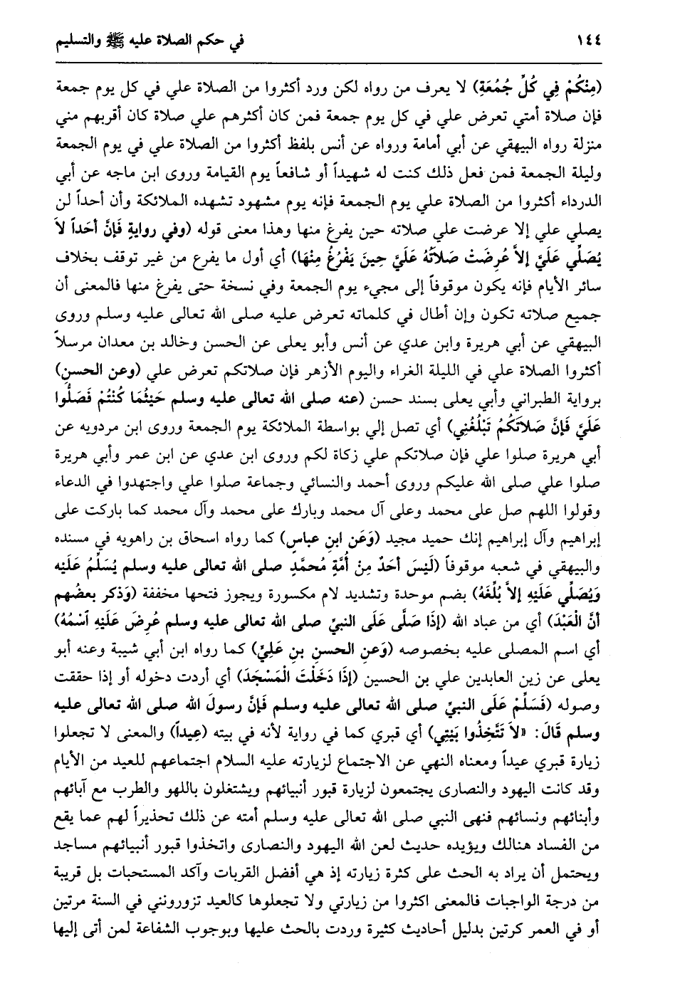 (منكم في كلّ جمعة) لا يعرف من رواه لكن ورد أكثروا من الصلاة علي في كل يوم جمعة فإن صلاة أمتي تعرض علي في كل يوم جمعة فمن كان أكثرهم علي صلاة كان أقربهم مني منزلة رواه البيهقي عن أبي أمامة ورواه عن أنس بلفظ أكثروا من الصلاة علي في يوم الجمعة وليلة الجمعة فمن فعل ذلك كنت له شهيدا أو شافعا يوم القيامة وروى ابن ماجه عن أبي الدرداء أكثروا من الصلاة علي يوم الجمعة فإنه يوم مشهود تشهده الملائكة وأن أحدا لن يصلي علي إلا عرضت علي صلاته حين يفرغ منها وهذا معنى قوله (وَفِي رِوَايَةٍ فَإِنَّ أَحَدًا لَا يُصَلِّي عَلَيَّ إِلَّا عُرِضَتْ صَلَاتُهُ عَلَيَّ حِينَ يَفْرُغُ مِنْهَا) أي أول ما يفرع من غير توقف بخلاف سائر الأيام فإنه يكون موقوفا إلى مجيء يوم الجمعة وفي نسخة حتى يفرغ منها فالمعنى أن جميع صلاته تكون وإن أطال في كلماته تعرض عليه صلى الله تعالى عليه وسلم وروى البيهقي عن أبي هريرة وابن عدي عن أنس وأبو يعلى عن الحسن وخالد بن معدان مرسلا أكثروا الصلاة علي في الليلة الغراء واليوم الأزهر فإن صلاتكم تعرض علي (وعن الحسن) برواية الطبراني وأبي يعلى بسند حسن (عنه صلى الله تعالى عَلَيْهِ وَسَلَّمَ حَيْثُمَا كُنْتُمْ فَصَلُّوا عَلَيَّ فَإِنَّ صلاتكم تبلغني) أي تصل إلي بواسطة الملائكة يوم الجمعة وروى ابن مردويه عن أبي هريرة صلوا علي فإن صلاتكم علي زكاة لكم وروى ابن عدي عن ابن عمر وأبي هريرة صلوا علي صلى الله عليكم وروى أحمد والنسائي وجماعة صلوا علي واجتهدوا في الدعاء وقولوا اللَّهُمَّ صَلِّ عَلَى مُحَمَّدٍ وَعَلَى آلِ مُحَمَّدٍ وَبَارِكْ عَلَى مُحَمَّدٍ وَآلِ مُحَمَّدٍ كَمَا بَارَكْتَ على إبراهيم وآل إبراهيم إنك حميد مجيد (وعن ابن عباس) كما رواه اسحاق بن راهويه في مسنده والبيهقي في شعبه موقوفا (ليس أحد من أمّة محمّد صلى الله تعالى عليه وسلم يسلّم عليه ويصلّي عليه إلّا بلّغه) بضم موحدة وتشديد لام مكسورة ويجوز فتحها مخففة (وذكر بعضهم أنّ العبد) أي من عباد الله (إذا صلّى على النبيّ صلى الله تعالى عليه وسلم عرض عليه اسمه) أي اسم المصلى عليه بخصوصه (وعن الحسن بن عليّ) كما رواه ابن أبي شيبة وعنه أبو يعلى عن زين العابدين علي بن الحسين (إذا دخلت المسجد) أي أردت دخوله أو إذا حققت وصوله (فسلّم على النبيّ صلى الله تعالى عَلَيْهِ وَسَلَّمَ فَإِنَّ رَسُولَ اللَّهِ صَلَّى اللَّهُ تعالى عليه وسلم قال: «لا تتّخذوا بيتي» أي قبري كما في رواية لأنه في بيته (عيدا) والمعنى لا تجعلوا زيارة قبري عيدا ومعناه النهي عن الاجتماع لزيارته عليه السلام اجتماعهم للعيد من الأيام وقد كانت اليهود والنصارى يجتمعون لزيارة قبور أنبيائهم ويشتغلون باللهو والطرب مع آبائهم وأبنائهم ونسائهم فنهى النبي صلى الله تعالى عليه وسلم أمته عن ذلك تحذيرا لهم عما يقع من الفساد هنالك ويؤيده حديث لعن الله اليهود والنصارى واتخذوا قبور أنبيائهم مساجد ويحتمل أن يراد به الحث على كثرة زيارته إذ هي أفضل القربات وآكد المستحبات بل قريبة من درجة الواجبات فالمعنى اكثروا من زيارتي ولا تجعلوها كالعيد تزورونني في السنة مرتين أو في العمر كرتين بدليل أحاديث كثيرة وردت بالحث عليها وبوجوب الشفاعة لمن أتى إليها