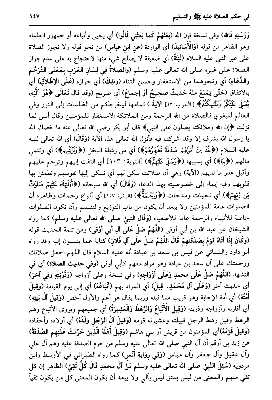 ورسله فالله) وفي نسخة فإن الله (بعثهم كما بعثني قالوا) أي يحيى وأتباعه أو جمهور العلماء وهو الظاهر من قوله (والأسانيد) أي الواردة (عن ابن عباس) من نحو قوله ولا تجوز الصلاة على غير النبي عليه السلام (ليّنة) أي ضعيفة لا يصلح شيء منها لاحتجاج به على عدم جواز الصلاة على غيره صلى الله تعالى عليه وسلم (وَالصَّلَاةُ فِي لِسَانِ الْعَرَبِ بِمَعْنَى التَّرَحُّمِ وَالدُّعَاءِ) أي وتحوهما من الاستغفار وحسن الثناء (وذلك) أي جوازه (على الإطلاق) أي بالاتفاق (حَتَّى يَمْنَعَ مِنْهُ حَدِيثٌ صَحِيحٌ أَوْ إِجْمَاعٌ) أي صريح (وَقَدْ قَالَ تَعَالَى هُوَ الَّذِي يُصَلِّي عَلَيْكُمْ وَمَلائِكَتُهُ [الأحزاب: 43] الآية) تمامها ليخرجكم من الظلمات إلى النور وفي العالم للبغوي فالصلاة من الله الرحمة ومن الملائكة الاستغفار للمؤمنين وقال أنس لما نزلت إِنَّ اللَّهَ وَمَلائِكَتَهُ يُصَلُّونَ عَلَى النَّبِيِّ قال أبو بكر رضي الله تعالى عنه ما خصك الله يا رسول الله بشرف إلا وقد اشركتنا فيه فأنزل الله تعالى هذه الآية (وقال) أي الله تعالى لنبيه عليه السلام (خُذْ مِنْ أَمْوالِهِمْ صَدَقَةً تُطَهِّرُهُمْ) أي من رذيلة البخل (وَتُزَكِّيهِمْ) أي وتنمي مالهم (بِها أي بسببها (وَصَلِّ عَلَيْهِمْ) [التوبة: 103] أي التفت إليهم وترحم عليهم وأقبل عذر ما لديهم (الآية) وهي أن صلاتك سكن لهم أي تسكن إليها نفوسهم وتطمئن بها قلوبهم وفيه إيماء إلى خصوصيته بهذا الدعاء (وقال) أي الله سبحانه (أُولئِكَ عَلَيْهِمْ صَلَواتٌ مِنْ رَبِّهِمْ) أي تحيات ومدحات (وَرَحْمَةٌ) [البقرة: 157] أي أنواع رحمات وظاهره أن الصلوات عامة للمؤمنين ولا يبعد أن يكون من باب التوزيع والتقسيم وأن تكون الصلوات خاصة للأنبياء والرحمة عامة للأصفياء (وقال النبيّ صلى الله تعالى عليه وسلم) كما رواه الشيخان عن عبد الله بن أبي أوفى (اللهمّ صلّ على آل أبي أوفى) ومن تتمة الحديث قوله (وَكَانَ إِذَا أَتَاهُ قَوْمٌ بِصَدَقَتِهِمْ قَالَ اللَّهُمَّ صلّ على آل فلان) كناية عما ينسبون إليه وقد رواه أبو داود والنسائي عن قيس بن سعد بن عبادة أنه عليه السلام قال اللهم اجعل صلاتك ورحمتك على آل سعد بن عبادة وهو مراد معهم كأبي أوفى (وفي حديث الصلاة) أي في التشهد (اللهمّ صلّ على محمد وعلى أزواجه) وفي نسخة وعلى أزواجه (وذرّيته وفي آخر) أي حديث آخر (وعلى آل محمّد، قيل) أي المراد بهم (أتباعه) أي إلى يوم القيامة (وقيل أمّته) أي أمة الإجابة وهو قريب مما قبله وربما يقال هو أعم والأول أخص (وقيل آل بيته) أي أقاربه وأزواجه وذريته (وقيل الأتباع والرّهط والعشيرة) أي جميعهم ويروى الأتباع وهم الرهط وقيل رهط الرجل قبيلته وعشيرته قومه (وقيل آل الرّجل ولده) أي أولاده وأحفاده (وقيل قومه) أي المؤمنون من قريش أو بني هاشم (وقيل أهله الّذين حرّمت عليهم الصّدقة) عن زيد بن أرقم أن آل النبي صلى الله تعالى عليه وسلم من حرم الصدقة عليه وهم آل علي وآل عقيل وآل جعفر وآل عباس (وفي رواية أنس) كما رواه الطبراني في الأوسط وابن مردويه (سئل النّبيّ صلى الله تعالى عَلَيْهِ وَسَلَّمَ مَنْ آلُ مُحَمَّدٍ قَالَ كُلُّ تقيّ) الظاهر إن كل تقي منهم والمعنى من ليس بمتق ليس بآلي ولا يبعد أن يكون المعنى كل من يكون تقيا
