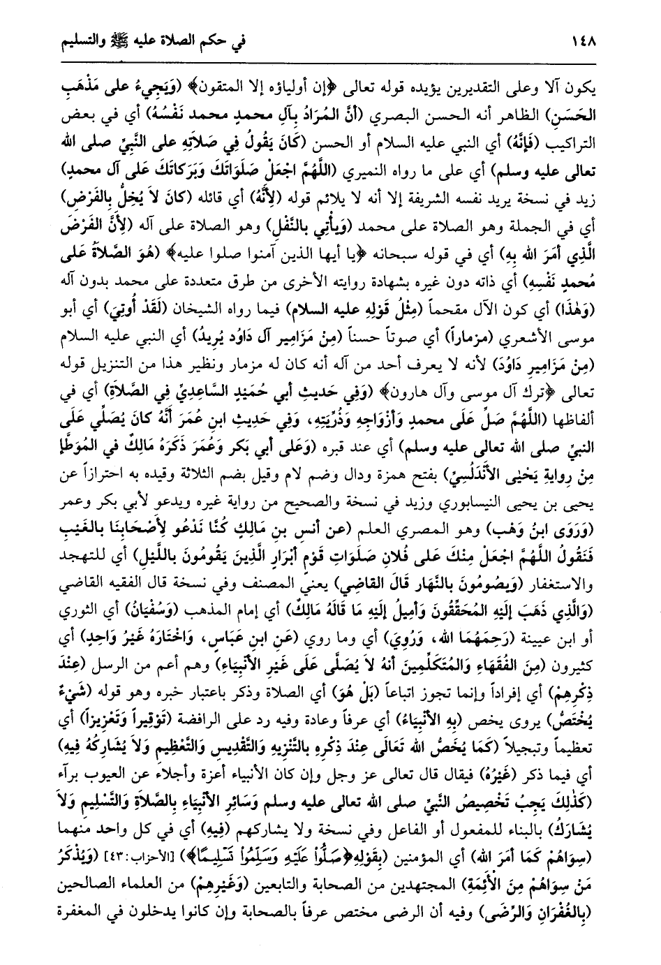 يكون آلا وعلى التقديرين يؤيده قوله تعالى إِنْ أَوْلِياؤُهُ إِلَّا الْمُتَّقُونَ (ويجيء على مذهب الحسن) الظاهر أنه الحسن البصري (أنّ المراد بآل محمد محمد نفسه) أي في بعض التراكيب (فإنّه) أي النبي عليه السلام أو الحسن (كان يقول في صلاته على النّبيّ صلى الله تعالى عليه وسلم) أي على ما رواه النميري (اللَّهُمَّ اجْعَلْ صَلَوَاتِكَ وَبَرَكَاتِكَ عَلَى آلِ مُحَمَّدٍ) زيد في نسخة يريد نفسه الشريفة إلا أنه لا يلائم قوله (لأنّه) أي قائله (كان لا يخلّ بالفرض) أي في الجملة وهو الصلاة على محمد (ويأتي بالنّفل) وهو الصلاة على آله (لأنّ الفرض الّذي أمر الله به) أي في قوله سبحانه يا أَيُّهَا الَّذِينَ آمَنُوا صَلُّوا عَلَيْهِ (هو الصّلاة على محمد نفسه) أي ذاته دون غيره بشهادة روايته الأخرى من طرق متعددة على محمد بدون آله (وهذا) أي كون الآل مقحما (مثل قوله عليه السلام) فيما رواه الشيخان (لقد أوتي) أي أبو موسى الأشعري (مزمارا) أي صوتا حسنا (من مزامير آل داود يريد) أي النبي عليه السلام (من مزامير داود) لأنه لا يعرف أحد من آله أنه كان له مزمار ونظير هذا من التنزيل قوله تعالى تَرَكَ آلُ مُوسى وَآلُ هارُونَ (وَفِي حَدِيثِ أَبِي حُمَيْدٍ السَّاعِدِيِّ فِي الصَّلَاةِ) أي في ألفاظها (اللَّهُمَّ صَلِّ عَلَى مُحَمَّدٍ وَأَزْوَاجِهِ وَذُرِّيَّتِهِ، وَفِي حَدِيثِ ابْنِ عُمَرَ أَنَّهُ كَانَ يُصَلِّي عَلَى النبيّ صلى الله تعالى عليه وسلم) أي عند قبره (وَعَلَى أَبِي بَكْرٍ وَعُمَرَ ذَكَرَهُ مَالِكٌ فِي الموطّإ من رواية يحيى الأندلسيّ) بفتح همزة ودال وضم لام وقيل بضم الثلاثة وقيده به احترازا عن يحيى بن يحيى النيسابوري وزيد في نسخة وَالصَّحِيحُ مِنْ رِوَايَةِ غَيْرِهِ وَيَدْعُو لِأَبِي بَكْرٍ وعمر (وروى ابن وهب) وهو المصري العلم (عَنْ أَنَسِ بْنِ مَالِكٍ كُنَّا نَدْعُو لِأَصْحَابِنَا بِالْغَيْبِ فَنَقُولُ اللَّهُمَّ اجْعَلْ مِنْكَ عَلَى فُلَانٍ صلوات قوم أبرار الّذين يقومون باللّيل) أي للتهجد والاستغفار (ويصومون بالنّهار قال القاضي) يعني المصنف وفي نسخة قال الفقيه الْقَاضِي (وَالَّذِي ذَهَبَ إِلَيْهِ الْمُحَقِّقُونَ وَأَمِيلُ إِلَيْهِ ما قاله مالك) أي إمام المذهب (وسفيان) أي الثوري أو ابن عيينة (رحمهما الله، وروي) أي وما روي (عن ابن عباس، واختاره غير واحد) أي كثيرون (مِنَ الْفُقَهَاءِ وَالْمُتَكَلِّمِينَ أَنَّهُ لَا يُصَلَّى عَلَى غير الأنبياء) وهم أعم من الرسل (عند ذكرهم) أي إفرادا وإنما تجوز اتباعا (بل هو) أي الصلاة وذكر باعتبار خبره وهو قوله (شيء يختصّ) يروى يخص (به الأنبياء) أي عرفا وعادة وفيه رد على الرافضة (توقيرا وتعزيزا) أي تعظيما وتبجيلا (كَمَا يُخَصُّ اللَّهُ تَعَالَى عِنْدَ ذِكْرِهِ بِالتَّنْزِيهِ والتّقديس والتّعظيم ولا يشاركه فيه) أي فيما ذكر (غيره) فيقال قال تعالى عز وجل وإن كان الأنبياء أعزة وأجلاء عن العيوب برآء (كذلك يجب تخصيص النّبيّ صلى الله تعالى عَلَيْهِ وَسَلَّمَ وَسَائِرِ الْأَنْبِيَاءِ بِالصَّلَاةِ وَالتَّسْلِيمِ وَلَا يشارك) بالبناء للمفعول أو الفاعل وفي نسخة ولا يشاركهم (فيه) أي في كل واحد منهما (سواهم كما أمر الله) أي المؤمنين (بِقَوْلِهِ صَلُّوا عَلَيْهِ وَسَلِّمُوا تَسْلِيماً) [الْأَحْزَابِ: 43] (وَيُذْكَرُ من سواهم من الأئمة) المجتهدين من الصحابة والتابعين (وغيرهم) من العلماء الصالحين (بالغفران والرّضى) وفيه أن الرضى مختص عرفا بالصحابة وإن كانوا يدخلون في المغفرة