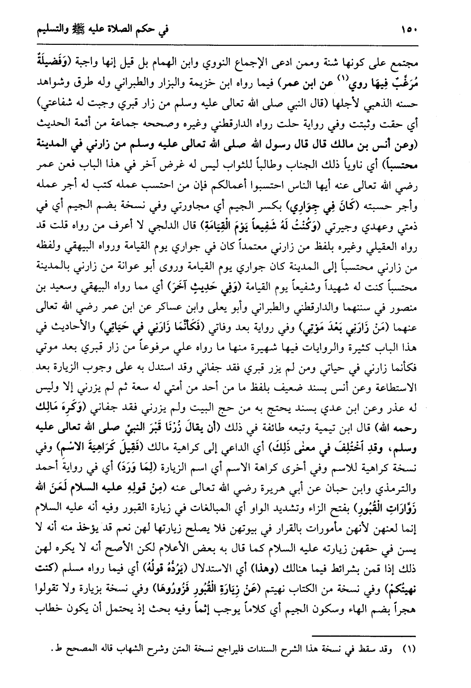 مجتمع على كونها شنة وممن ادعى الإجماع النووي وابن الهمام بل قيل إنها واجبة (وفضيلة مرغّب فيها روي «1» عن ابن عمر) فيما رواه ابن خزيمة والبزار والطبراني وله طرق وشواهد حسنه الذهبي لأجلها (قال النبي صلى الله تعالى عَلَيْهِ وَسَلَّمَ مَنْ زَارَ قَبْرِي وَجَبَتْ لَهُ شفاعتي) أي حقت وثبتت وفي رواية حلت رواه الدارقطني وغيره وصححه جماعة من أئمة الحديث (وَعَنْ أَنَسِ بْنِ مَالِكٍ قَالَ قَالَ رَسُولُ الله صلى الله تعالى عَلَيْهِ وَسَلَّمَ مَنْ زَارَنِي فِي الْمَدِينَةِ مُحْتَسِبًا) أي ناويا ذلك الجناب وطالبا للثواب ليس له غرض آخر في هذا الباب فعن عمر رضي الله تعالى عنه أيها الناس احتسبوا أعمالكم فإن من احتسب عمله كتب له أجر عمله وأجر حسبته (كان في جواري) بكسر الجيم أي مجاورتي وفي نسخة بضم الجيم أي في ذمتي وعهدي وجيرتي (وكنت له شفيعا يوم القيامة) قال الدلجي لا أعرف من رواه قلت قد رواه العقيلي وغيره بلفظ من زارني معتمدا كان في جواري يوم القيامة ورواه البيهقي ولفظه من زارني محتسبا إلى المدينة كان جواري يوم القيامة وروى أبو عوانة من زارني بالمدينة محتسبا كنت له شهيدا وشفيعا يوم القيامة (وفي حديث آخر) أي مما رواه البيهقي وسعيد بن منصور في سننهما والدارقطني والطبراني وأبو يعلى وابن عساكر عن ابن عمر رضي الله تعالى عنهما (من زارني بعد موتي) وفي رواية بعد وفاتي (فكأنّما زارني في حياتي) والأحاديث في هذا الباب كثيرة والروايات فيها شهيرة منها ما رواه علي مرفوعا من زار قبري بعد موتي فكأنما زارني في حياتي ومن لم يزر قبري فقد جفاني وقد استدل به على وجوب الزيارة بعد الاستطاعة وعن أنس بسند ضعيف بلفظ ما من أحد من أمتي له سعة ثم لم يزرني إلا وليس له عذر وعن ابن عدي بسند يحتج به من حج البيت ولم يزرني فقد جفاني (وكره مالك رحمه الله) قال ابن تيمية وتبعه طائفة في ذلك (أَنْ يُقَالَ زُرْنَا قَبْرَ النَّبِيِّ صَلَّى اللَّهُ تعالى عَلَيْهِ وَسَلَّمَ، وَقَدِ اخْتُلِفَ فِي مَعْنَى ذَلِكَ) أي الداعي إلى كراهية مالك (فقيل كراهية الاسم) وفي نسخة كراهية للاسم وفي أخرى كراهة الاسم أي اسم الزيارة (لما ورد) أي في رواية أحمد والترمذي وابن حبان عن أبي هريرة رضي الله تعالى عنه (من قوله عليه السلام لعن الله زوّارات القبور) بفتح الزاء وتشديد الواو أي المبالغات في زيارة القبور وفيه أنه عليه السلام إنما لعنهن لأنهن مأمورات بالقرار في بيوتهن فلا يصلح زيارتها لهن نعم قد يؤخذ منه أنه لا يسن في حقهن زيارته عليه السلام كما قال به بعض الأعلام لكن الأصح أنه لا يكره لهن ذلك إذا قمن بشرائط فيما هنالك (وهذا) أي الاستدلال (يردّه قوله) أي فيما رواه مسلم (كنت نهيتكم) وفي نسخة من الكتاب نهيتم (عن زيارة القبور فزوروها) وفي نسخة بزيارة ولا تقولوا هجرا بضم الهاء وسكون الجيم أي كلاما يوجب إثما وفيه بحث إذ يحتمل أن يكون خطاب