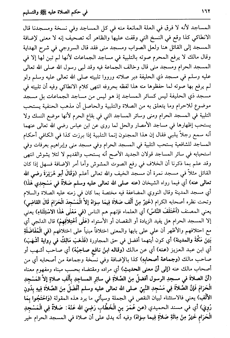 المساجد لأنه لا فرق في العلة المانعة منه في كل المساجد وفي نسخة ومسجدنا قال الانطاكي كذا وقع في النسخ التي وقفت عليها والظاهر أنه تصحيف إنه لا معنى لإضافة المسجد إلى القائل هنا ولعل الصواب ومسجد منى فقد قال السروجي في شرح الهداية وقال مالك لا يرفع المحرم صوته بالتلبية في مساجد الجماعات لأنها لم تبن لها إلا في المسجد الحرام ومسجد منى قال وخالف الجماعة فيه وقد لبى رسول الله صلى الله تعالى عليه وسلم في مسجد ذي الحليفة دبر صلاته ورووا تلبيته صلى الله تعالى عليه وسلم ولو لم يرفع بها صوته لما حفظوها منه هذا لفظه بحروفه انتهى كلام الانطاكي وفيه أن تلبيته في مسجد ذي الحليفة ليس كسائر المساجد إذ هو ليس من مساجد الجماعات بل مسجد موضوع للاحرام وما يتعلق به من الصلاة والتلبية والحاصل أن مذهب الحنفية يستحب التلبية في المسجد الحرام ومنى وسائر المساجد التي في بقاع الحرم لأنها موضع النسك ولا يستحب إظهارها في مساجد الأمصار والحل لما روى عن ابن عباس رضي الله تعالى عنهما أنه سمع رجلا يلبي فقال إن هذا المجنون إنما التلبية إذا برزت كذا في الكافي أحكام المساجد للشافعية يستحب التلبية في المسجد الحرام وفي مسجد منى وإبراهيم بعرفات وفي استحبابه في سائر المساجد قولان الجديد الأصح أنه يستحب والقديم لا لئلا يشوش انتهى وقد علم بما ذكرنا أن الخلاف في رفع الصوت المشوش وأما أمر الإضافة فسهل إذا كان القائل مثلا في مسجد نمرة أن مسجد الخيف والله تعالى أعلم (وقال أبو هريرة رضي الله تعالى عنه) أي فيما رواه الشيخان (عنه صلى الله تعالى عليه وسلم صلاة في مسجدي هذا) أي مسجد المدينة وقال النووي المضاعفة فيه مختصة بما كان في زمنه عليه الصلاة والسلام وتحت نظره أصحابه الكرام (خَيْرٌ مِنْ أَلْفِ صَلَاةٍ فِيمَا سِوَاهُ إِلَّا المسجد الحرام قال القاضي) يعني المصنف (اختلف النّاس) أي العلماء فإنهم هم الناس (في معنى هذا الاستثناء) يعني إلا المسجد الحرام هل يفيد الزيادة أو النقصان أو الأستواء (على اختلافهم) قال الدلجي أي مع احتلافهم والأظهر أن علي على بابها والمعنى اختلافا مبنيا عَلَى اخْتِلَافِهِمْ (فِي الْمُفَاضَلَةِ بَيْنَ مَكَّةَ وَالْمَدِينَةِ) أي كون أيتهما أفضل في حق المجاورة (فذهب مالك في رواية أشهب) أي ابن عبد العزيز (عنه) أي عن مالك (وقاله ابن نافع صاحبه) أي صاحب أشهب أو صاحب مالك (وجماعة أصحابه) كذا بالإضافة وفي نسخة وجماعة من أصحابه أي من أصحاب مالك عنه (إلى أنّ معنى الحديث) أي مراده ومقتضاه بحسب مبناه ومفهوم معناه (أَنَّ الصَّلَاةَ فِي مَسْجِدِ الرَّسُولِ أَفْضَلُ مِنَ الصَّلَاةِ فِي سَائِرِ الْمَسَاجِدِ بِأَلْفِ صَلَاةٍ إِلَّا الْمَسْجِدَ الْحَرَامَ فَإِنَّ الصَّلَاةَ فِي مَسْجِدِ النَّبِيِّ صلى الله تعالى عَلَيْهِ وَسَلَّمَ أَفْضَلُ مِنَ الصَّلَاةِ فِيهِ بِدُونِ الألف) يعني فالاستثناء لبيان النقص في الجملة وسيأتي ما يرد هذه المقولة (واحتجوا بما روي) أي في مسند الحميدي (عَنْ عُمَرَ بْنِ الْخَطَّابِ رَضِيَ اللَّهُ عَنْهُ: صَلَاةٌ فِي الْمَسْجِدِ الْحَرَامِ خَيْرٌ مِنْ مِائَةِ صلاة فيما سواه) وفيه أنه يدل على أن صَلَاةٌ فِي الْمَسْجِدِ الْحَرَامِ خَيْرٌ