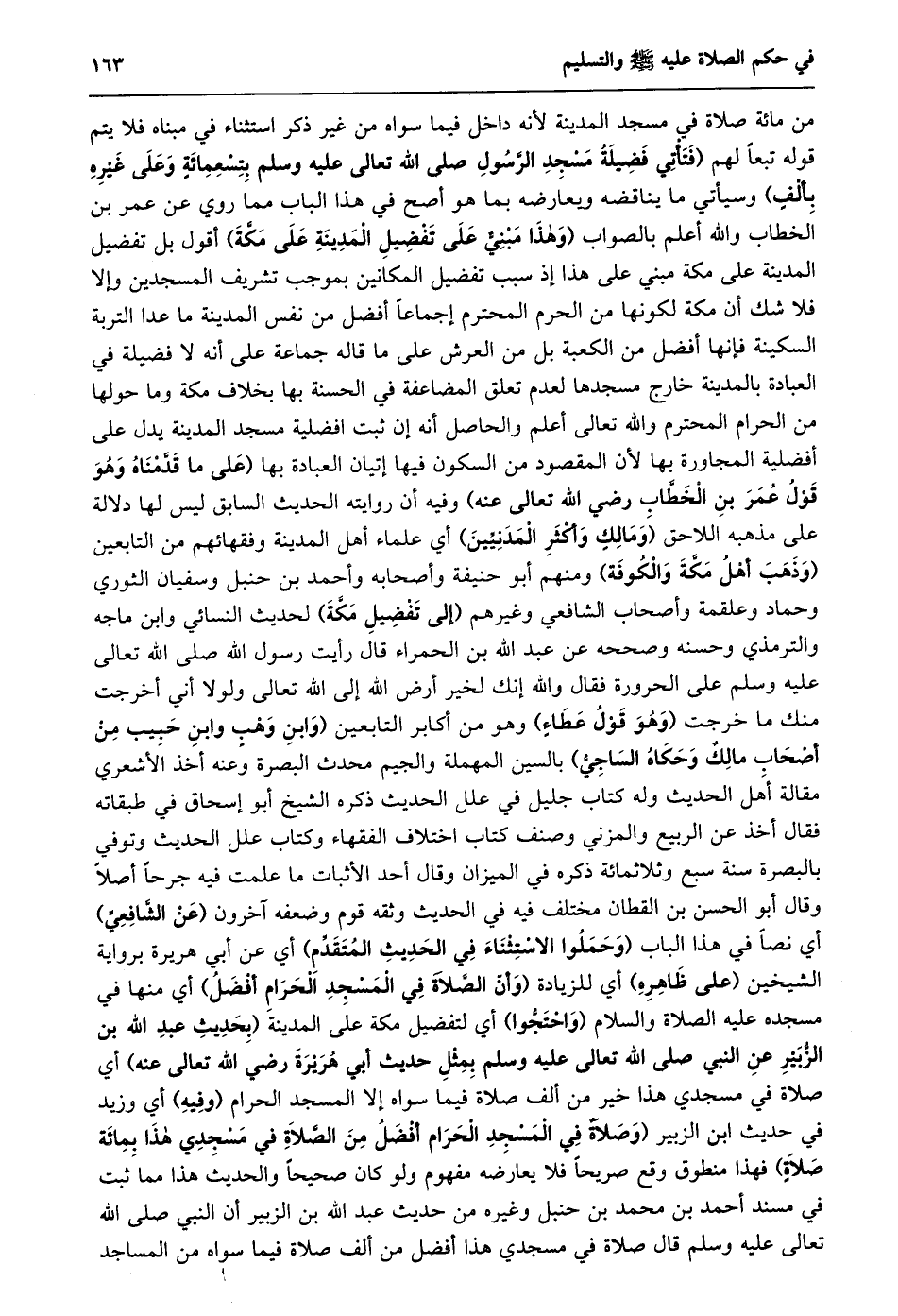 من مائة صلاة في مسجد المدينة لأنه داخل فيما سواه من غير ذكر استثناء في مبناه فلا يتم قوله تبعا لهم (فتأتي فضيلة مسجد الرّسول صلى الله تعالى عليه وسلم بتسعمائة وعلى غيره بألف) وسيأتي ما يناقضه ويعارضه بما هو أصح في هذا الباب مما روي عن عمر بن الخطاب والله أعلم بالصواب (وَهَذَا مَبْنِيٌّ عَلَى تَفْضِيلِ الْمَدِينَةِ عَلَى مَكَّةَ) أقول بل تفضيل المدينة على مكة مبني على هذا إذ سبب تفضيل المكانين بموجب تشريف المسجدين وإلا فلا شك أن مكة لكونها من الحرم المحترم إجماعا أفضل من نفس المدينة ما عدا التربة السكينة فإنها أفضل من الكعبة بل من العرش على ما قاله جماعة على أنه لا فضيلة في العبادة بالمدينة خارج مسجدها لعدم تعلق المضاعفة في الحسنة بها بخلاف مكة وما حولها من الحرام المحترم والله تعالى أعلم والحاصل أنه إن ثبت افضلية مسجد المدينة يدل على أفضلية المجاورة بها لأن المقصود من السكون فيها إتيان العبادة بها (عَلَى مَا قَدَّمْنَاهُ وَهُوَ قَوْلُ عُمَرَ بْنِ الخطّاب رضي الله تعالى عنه) وفيه أن روايته الحديث السابق ليس لها دلالة على مذهبه اللاحق (ومالك وأكثر المدنيّين) أي علماء أهل المدينة وفقهائهم من التابعين (وذهب أهل مكّة والكوفة) ومنهم أبو حنيفة وأصحابه وأحمد بن حنبل وسفيان الثوري وحماد وعلقمة وأصحاب الشافعي وغيرهم (إلى تفضيل مكّة) لحديث النسائي وابن ماجه والترمذي وحسنه وصححه عن عبد الله بن الحمراء قال رأيت رسول الله صلى الله تعالى عليه وسلم على الحرورة فقال والله إنك لخير أرض الله إلى الله تعالى ولولا أني أخرجت منك ما خرجت (وهو قول عطاء) وهو من أكابر التابعين (وَابْنِ وَهْبٍ وَابْنِ حَبِيبٍ مِنْ أَصْحَابِ مَالِكٍ وحكاه الساجيّ) بالسين المهملة والجيم محدث البصرة وعنه أخذ الأشعري مقالة أهل الحديث وله كتاب جليل في علل الحديث ذكره الشيخ أبو إسحاق في طبقاته فقال أخذ عن الربيع والمزني وصنف كتاب اختلاف الفقهاء وكتاب علل الحديث وتوفي بالبصرة سنة سبع وثلاثمائة ذكره في الميزان وقال أحد الأثبات ما علمت فيه جرحا أصلا وقال أبو الحسن بن القطان مختلف فيه في الحديث وثقه قوم وضعفه آخرون (عن الشّافعيّ) أي نصا في هذا الباب (وحملوا الاستثناء في الحديث المتقدّم) أي عن أبي هريرة برواية الشيخين (على ظاهره) أي للزيادة (وأنّ الصّلاة في المسجد الحرام أفضل) أي منها في مسجده عليه الصلاة والسلام (واحتجّوا) أي لتفضيل مكة على المدينة (بِحَدِيثِ عَبْدِ اللَّهِ بْنِ الزُّبَيْرِ عَنِ النَّبِيِّ صلى الله تعالى عليه وسلم بمثل حديث أبي هريرة رضي الله تعالى عنه) أي صَلَاةٌ فِي مَسْجِدِي هَذَا خَيْرٌ مِنْ أَلْفِ صلاة فيما سواه إلا المسجد الحرام (وفيه) أي وزيد في حديث ابن الزبير (وَصَلَاةٌ فِي الْمَسْجِدِ الْحَرَامِ أَفْضَلُ مِنَ الصَّلَاةِ في مسجدي هذا بمائة صلاة) فهذا منطوق وقع صريحا فلا يعارضه مفهوم ولو كان صحيحا والحديث هذا مما ثبت في مسند أحمد بن محمد بن حنبل وغيره من حديث عبد الله بن الزبير أن النبي صلى الله تعالى عليه وسلم قال صلاة في مسجدي هذا أفضل من ألف صلاة فيما سواه من المساجد
