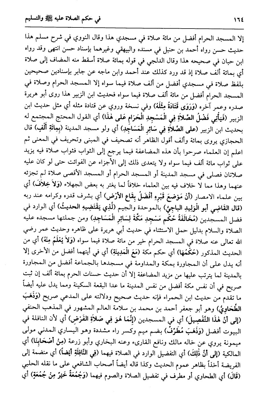 إلا المسجد الحرام أفضل من مائة صلاة في مسجدي هذا وقال النووي في شرح مسلم هذا حديث حسن رواه أحمد بن حنبل في مسنده والبيهقي وغيرهما بإسناد حسن انتهى وقد رواه ابن حبان في صحيحه هذا وقال الدلجي في قوله بمائة صلاة أسقط منه المضاف إلى صلاة أي بمائة ألف صلاة إذ قد ورد كذلك عند أحمد وابن ماجه عن جابر بإسنادين صحيحين بلفظ صلاة في مسجدي أفضل مِنْ أَلْفِ صَلَاةٍ فِيمَا سِوَاهُ إِلَّا الْمَسْجِدَ الحرام وصلاة في المسجد الحرام أفضل من مائة ألف صلاة فيما سواه فحديث ابن الزبير هذا روى أبو هريرة صدره وعمر آخره (وروى قتادة مثله) وفي نسخة وروي عن قتادة مثله أي مثل حديث ابن الزبير (فَيَأْتِي فَضْلُ الصَّلَاةِ فِي الْمَسْجِدِ الْحَرَامِ عَلَى هذا) أي القول المحتج المجتمع له بحديث ابن الزبير (على الصّلاة في سائر المساجد) أي ولو مسجد المدينة (بمائة ألف) قال الحجازي يروى بمائة وألف أقول الظاهر أنه تصحيف في المبنى وتحريف في المعنى ثم اعلم إن العلماء صرحوا بأن هذه المضاعفة فيما يرجع إلى الثواب فثواب صلاة فيه يزيد على ثواب مائة ألف فيما سواه ولا يتعدى ذلك إلى الأجزاء عن الفوائت حتى لو كان عليه صلاتان فصلى في مسجد المدينة أو المسجد الحرام أو المسجد الأقصي صلاة لم تجزئه عنهما وهذا مما لا خلاف فيه بين العلماء خلافا لما يغتر به بعض الجهلاء (ولا خلاف) أي بين علماء الامصار (أن موضع قبره أفضل بقاع الأرض) أي بشرف قدره وكرامه عند ربه (قال القاضي أبو الوليد الباجيّ) بالموحدة والجيم (لّذي يقتضيه الحديث) أي الوارد في فضل المسجدين (مخالفة حكم مسجد مكّة لسائر المساجد) ومن جملتها مسجده عليه الصلاة والسلام بدليل حمل الاستثناء في حديث أبي هريرة على ظاهره وحديث عمر رضي الله تعالى عَنْهُ صَلَاةٌ فِي الْمَسْجِدِ الْحَرَامِ خَيْرٌ مِنْ مائة صلاة فيما سواه (ولا يعلم منه) أي من الحديث المذكور (حكمها) أي حكم مكة (مع المدينة) أي في أيتهما أفضل من الأخرى إلا أنه يدل على أن المجاورة بمكة والمداومة في مسجدها بالجماعة أفضل من المجاورة بالمدينة لما يترتب عليها من مزيد المضاعفة إلا أن حديث حسنات الحرم بمائة ألف إن ثبت صريح في أن نفس مكة أفضل من نفس المدينة ما عدا البقعة السكينة ومما يدل عليه أيضا ما تقدم من حديث ابن الحمراء فإنه حديث صحيح ودلالته على المدعي صريح (وذهب الطّحاويّ) وهو أبو جعفر أحمد بن محمد بن سلامة العالم المشهور في المذهب الحنفي (إلى أنّ هذا التّفصيل) أي في المسجدين (إنّما هو في صلاة الفرض) أي لأن النافلة في البيوت أفضل (وذهب مطرّف) بضم ميم وكسر راء مشددة وهو اليساري المدني مولى ميمونة يروي عن خاله مالك ونافع القارىء وعنه البخاري وأبو زرعة (من أصحابنا) أي المالكية (إلى أنّ ذلك) أي التفضيل الوارد في الصلاة فيهما (في النّافلة أيضا) أي منضمة إلى الفريضة أخذا بظاهر عموم الحديث وكذا قاله أيضا أصحاب الشافعي على ما نقله الحلبي (قال) أي الطحاوي أو مطرف في تفضيل الصلاة والصوم فيهما (وجمعة خير من جمعة) أي