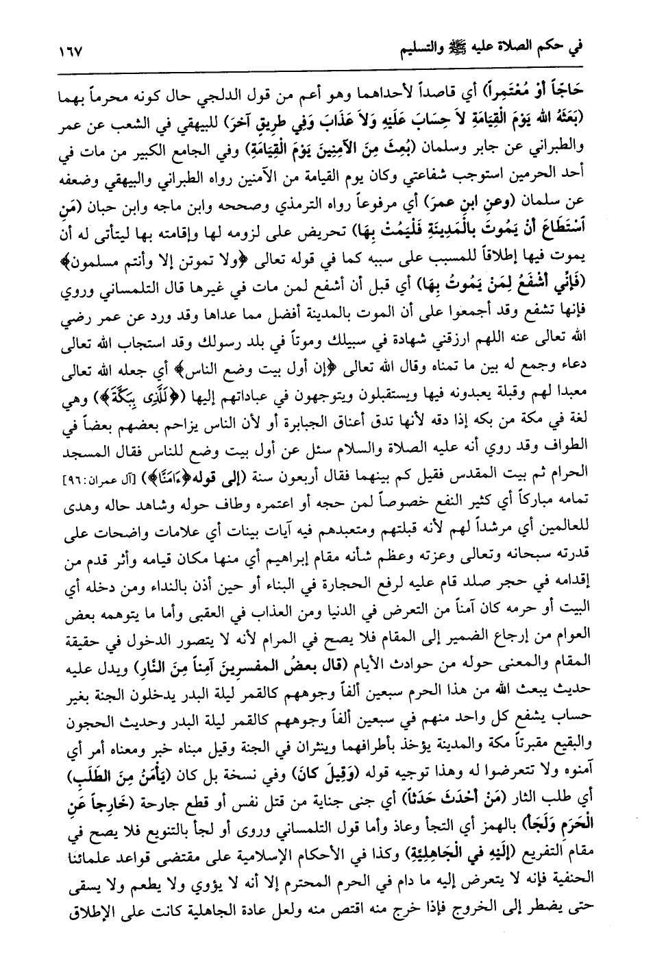 حاجّا أو معتمرا) أي قاصدا لأحداهما وهو أعم من قول الدلجي حال كونه محرما بهما (بَعَثَهُ اللَّهُ يَوْمَ الْقِيَامَةِ لَا حِسَابَ عَلَيْهِ ولا عذاب وفي طريق آخر) للبيهقي في الشعب عن عمر والطبراني عن جابر وسلمان (بعث من الآمنين يوم القيامة) وفي الجامع الكبير من مات في أحد الحرمين استوجب شفاعتي وكان يوم القيامة من الآمنين رواه الطبراني والبيهقي وضعفه عن سلمان (وعن ابن عمر) أي مرفوعا رواه الترمذي وصححه وابن ماجه وابن حبان (مَنِ اسْتَطَاعَ أَنْ يَمُوتَ بِالْمَدِينَةِ فَلْيَمُتْ بِهَا) تحريض على لزومه لها وإقامته بها ليتأتى له أن يموت فيها إطلاقا للمسبب على سببه كما في قوله تعالى وَلا تَمُوتُنَّ إِلَّا وَأَنْتُمْ مُسْلِمُونَ (فإنّي أشفع لمن يموت بها) أي قبل أن أشفع لمن مات في غيرها قال التلمساني وروي فإنها تشفع وقد أجمعوا على أن الموت بالمدينة أفضل مما عداها وقد ورد عن عمر رضي الله تعالى عنه اللهم ارزقني شهادة في سبيلك وموتا في بلد رسولك وقد استجاب الله تعالى دعاء وجمع له بين ما تمناه وقال الله تعالى إِنَّ أَوَّلَ بَيْتٍ وُضِعَ لِلنَّاسِ أي جعله الله تعالى معبدا لهم وقبلة يعبدونه فيها ويستقبلون ويتوجهون في عباداتهم إليها (لَلَّذِي بِبَكَّةَ) وهي لغة في مكة من بكه إذا دقه لأنها تدق أعناق الجبابرة أو لأن الناس يزاحم بعضهم بعضا في الطواف وقد روي أنه عليه الصلاة والسلام سئل عن أول بيت وضع للناس فقال المسجد الحرام ثم بيت المقدس فقيل كم بينهما فقال أربعون سنة (إلى قوله آمَنَّا) [آل عمران: 96] تمامه مباركا أي كثير النفع خصوصا لمن حجه أو اعتمره وطاف حوله وشاهد حاله وهدى للعالمين أي مرشدا لهم لأنه قبلتهم ومتعبدهم فيه آيات بينات أي علامات واضحات على قدرته سبحانه وتعالى وعزته وعظم شأنه مقام إبراهيم أي منها مكان قيامه وأثر قدم من إقدامه في حجر صلد قام عليه لرفع الحجارة في البناء أو حين أذن بالنداء ومن دخله أي البيت أو حرمه كان آمنا من التعرض في الدنيا ومن العذاب في العقبى وأما ما يتوهمه بعض العوام من إرجاع الضمير إلى المقام فلا يصح في المرام لأنه لا يتصور الدخول في حقيقة المقام والمعنى حوله من حوادث الأيام (قال بعض المفسرين آمنا من النّار) ويدل عليه حديث يبعث الله من هذا الحرم سبعين ألفا وجوههم كالقمر ليلة البدر يدخلون الجنة بغير حساب يشفع كل واحد منهم في سبعين ألفا وجوههم كالقمر ليلة البدر وحديث الحجون والبقيع مقبرتا مكة والمدينة يؤخذ بأطرافهما وينثران في الجنة وقيل مبناه خبر ومعناه أمر أي آمنوه ولا تتعرضوا له وهذا توجيه قوله (وقيل كان) وفي نسخة بل كان (يأمن من الطلب) أي طلب الثار (من أحدث حدثا) أي جنى جناية من قتل نفس أو قطع جارحة (خارجا عن الحرم ولجأ) بالهمز أي التجأ وعاذ وأما قول التلمساني وروى أو لجأ بالتنويع فلا يصح في مقام التفريع (إليه في الجاهليّة) وكذا في الأحكام الإسلامية على مقتضى قواعد علمائنا الحنفية فإنه لا يتعرض إليه ما دام في الحرم المحترم إلا أنه لا يؤوي ولا يطعم ولا يسقى حتى يضطر إلى الخروج فإذا خرج منه ولعل عادة الجاهلية كانت على الإطلاق
