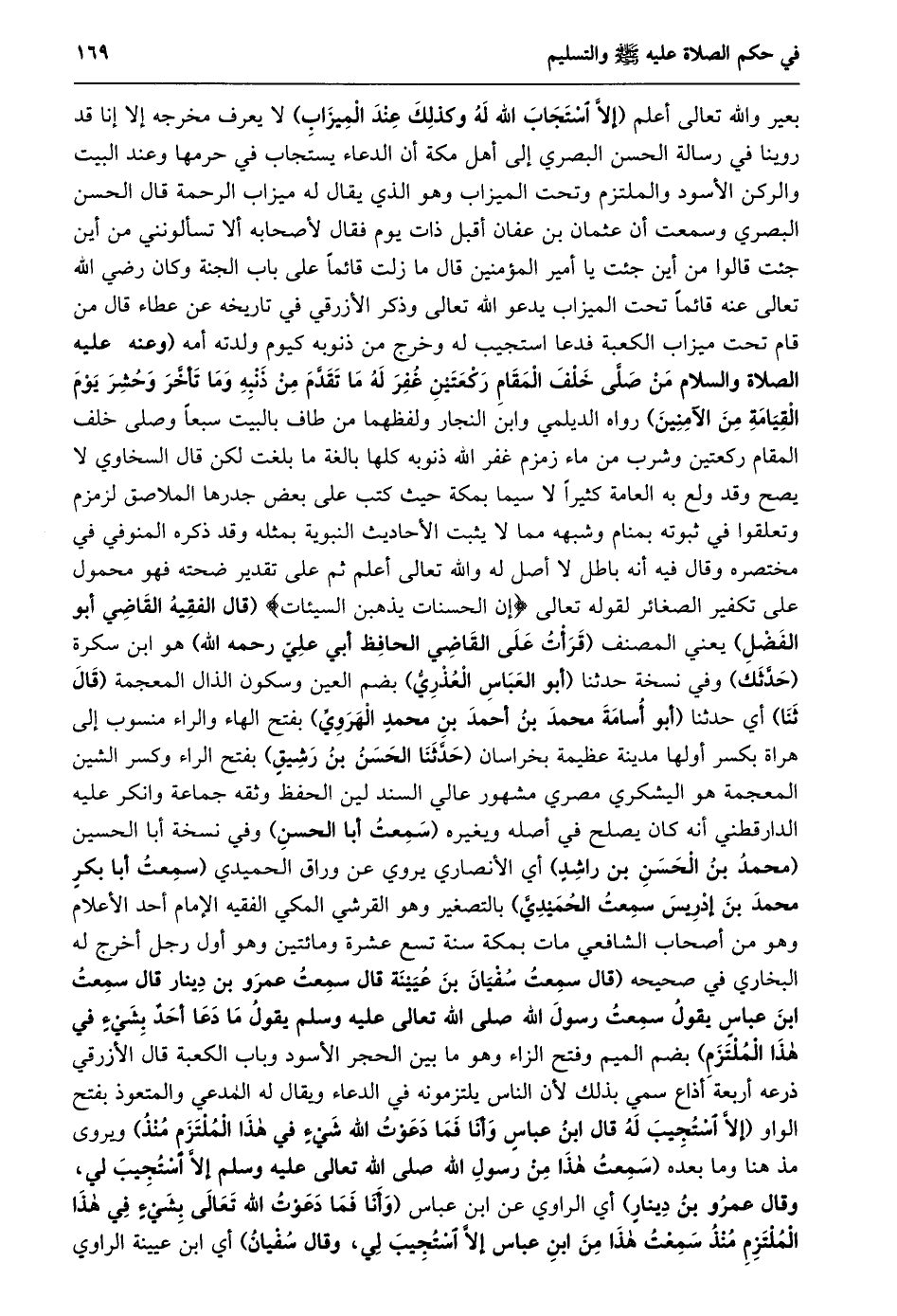بعير والله تعالى أعلم (إِلَّا اسْتَجَابَ اللَّهُ لَهُ وَكَذَلِكَ عِنْدَ الْمِيزَابِ) لا يعرف مخرجه إلا إنا قد روينا في رسالة الحسن البصري إلى أهل مكة أن الدعاء يستجاب في حرمها وعند البيت والركن الأسود والملتزم وتحت الميزاب وهو الذي يقال له ميزاب الرحمة قال الحسن البصري وسمعت أن عثمان بن عفان أقبل ذات يوم فقال لأصحابه ألا تسألونني من أين جئت قالوا من أين جئت يا أمير المؤمنين قال ما زلت قائما على باب الجنة وكان رضي الله تعالى عنه قائما تحت الميزاب يدعو الله تعالى وذكر الأزرقي في تاريخه عن عطاء قال من قام تحت ميزاب الكعبة فدعا استجيب له وخرج من ذنوبه كيوم ولدته أمه (وعنه عليه الصلاة والسلام مَنْ صَلَّى خَلْفَ الْمَقَامِ رَكْعَتَيْنِ غُفِرَ لَهُ مَا تَقَدَّمَ مِنْ ذَنْبِهِ وَمَا تَأَخَّرَ وَحُشِرَ يوم القيامة من الآمنين) رواه الديلمي وابن النجار ولفظهما من طاف بالبيت سبعا وصلى خلف المقام ركعتين وشرب من ماء زمزم غفر الله ذنوبه كلها بالغة ما بلغت لكن قال السخاوي لا يصح وقد ولع به العامة كثيرا لا سيما بمكة حيث كتب على بعض جدرها الملاصق لزمزم وتعلقوا في ثبوته بمنام وشبهه مما لا يثبت الأحاديث النبوية بمثله وقد ذكره المنوفي في مختصره وقال فيه أنه باطل لا أصل له والله تعالى أعلم ثم على تقدير ضحته فهو محمول على تكفير الصغائر لقوله تعالى إِنَّ الْحَسَناتِ يُذْهِبْنَ السَّيِّئاتِ (قال الفقيه القاضي أبو الفضل) يعني المصنف (قرأت على القاضي الحافظ أبي عليّ رحمه الله) هو ابن سكرة (حدّثك) وفي نسخة حدثنا (أبو العباس العذريّ) بضم العين وسكون الذال المعجمة (قال ثنا) أي حَدَّثَنَا (أَبُو أُسَامَةَ مُحَمَّدُ بْنُ أَحْمَدَ بْنِ محمد الهرويّ) بفتح الهاء والراء منسوب إلى هراة بكسر أولها مدينة عظيمة بخراسان (حدّثنا الحسن بن رشيق) بفتح الراء وكسر الشين المعجمة هو اليشكري مصري مشهور عالي السند لين الحفظ وثقه جماعة وانكر عليه الدارقطني أنه كان يصلح في أصله ويغيره (سمعت أبا الحسن) وفي نسخة أبا الحسين (محمد بن الحسن بن راشد) أي الأنصاري يروي عن وراق الحميدي (سَمِعْتُ أَبَا بَكْرٍ مُحَمَّدَ بْنَ إِدْرِيسَ سَمِعْتُ الحميديّ) بالتصغير وهو القرشي المكي الفقيه الإمام أحد الأعلام وهو من أصحاب الشافعي مات بمكة سنة تسع عشرة ومائتين وهو أول رجل أخرج له البخاري في صحيحه (قَالَ سَمِعْتُ سُفْيَانَ بْنَ عُيَيْنَةَ قَالَ سَمِعْتُ عَمْرَو بْنَ دِينَارٍ قَالَ سَمِعْتُ ابْنَ عَبَّاسٍ يقول سمعت رسول الله صلى الله تعالى عَلَيْهِ وَسَلَّمَ يَقُولُ مَا دَعَا أَحَدٌ بِشَيْءٍ في هذا الملتزم) بضم الميم وفتح الزاء وهو ما بين الحجر الأسود وباب الكعبة قال الأزرقي ذرعه أربعة أذاع سمي بذلك لأن الناس يلتزمونه في الدعاء ويقال له المدعي والمتعوذ بفتح الواو (إِلَّا اسْتُجِيبَ لَهُ قَالَ ابْنُ عَبَّاسٍ وَأَنَا فما دعوت الله شيء في هذا الملتزم منذ) ويروى مذ هنا وما بعده (سَمِعْتُ هَذَا مِنْ رَسُولِ اللَّهِ صَلَّى اللَّهُ تعالى عَلَيْهِ وَسَلَّمَ إِلَّا اسْتُجِيبَ لِي، وَقَالَ عَمْرُو بن دينار) أي الراوي عن ابن عباس (وَأَنَا فَمَا دَعَوْتُ اللَّهَ تَعَالَى بِشَيْءٍ فِي هذا الملتزم منذ سمعت هذا من ابْنِ عَبَّاسٍ إِلَّا اسْتُجِيبَ لِي، وَقَالَ سُفْيَانُ) أي ابن عيينة الراوي