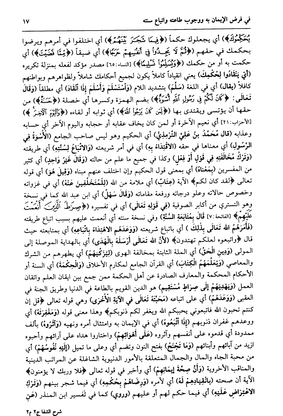 يُحَكِّمُوكَ) أي يجعلوك حكما (فِيما شَجَرَ بَيْنَهُمْ) أي اختلفوا في أمرهم ويرضوا بحكمك في حقهم (ثُمَّ لا يَجِدُوا فِي أَنْفُسِهِمْ حَرَجاً) أي ضيقا (مِمَّا قَضَيْتَ) أي حكمت به أو من حكمك (وَيُسَلِّمُوا تَسْلِيماً) [النساء: 65] مصدر مؤكد لفعله بمنزلة تكريره (أي ينقادوا لحكمك) يعني انقيادا كاملا يكون لجميع أحكامك شاملا ولظواهرهم وبواطنهم كافلا (يقال) أي في اللغة (سلّم) بتشديد اللام (واستسلم وأسلم إذا انقاد) أي مطلقا (وقال تعالى: كانَ لَكُمْ فِي رَسُولِ اللَّهِ أُسْوَةٌ) بضم الهمزة وكسرها أي خصلة (حَسَنَةٌ) من حقها أن يؤتسى ويقتدى بها (لِمَنْ كانَ يَرْجُوا اللَّهَ) أي ثوابه أو لقاءه (وَالْيَوْمَ الْآخِرَ) [الأحزاب: 21] أي نعيم الآخرة أو لمن كان يخاف عقابه أو حجابه واليوم الآخر أي حسابه وعذابه (قال محمّد بن عليّ التّرمذي) أي الحكيم وهو ليس صاحب الجامع (الأسوة في الرّسول) أي معناها في حقه (الاقتداء به) أي في أمر شريعته (والاتّباع لسنّته) أي طريقته (وترك مخالفته في قول أو فعل) وكذا في جميع ما علم من حالته (وقال غير واحد) أي كثير من المفسرين (بمعناه) أي بمعنى قول الحكيم وإن اختلف عنهم مبناه (وقيل هو) أي قوله تعالى لَقَدْ كانَ لَكُمْ الآية (عتاب) أي ملامة من الله (للمتخلّفين عنه) أي في غزواته وخصوص حالاته وعلو درجاته ورفعة مقاماته (وقال سهل) أي ابن عبد الله كما في نسخة وهو التستري من أكابر الصوفية (في قوله تعالى) أي في تفسيره (صِراطَ الَّذِينَ أَنْعَمْتَ عَلَيْهِمْ) [الفاتحة: 7] قال بمتابعة السّنّة) وفي نسخة سنته أي أنعمت عليهم بسبب اتباع طريقته (فأمرهم الله تعالى بذلك) أي باتباع شريعته (ووعدهم الاهتداء باتّباعه) أي بمتابعته حيث قال وَاتَّبِعُوهُ لَعَلَّكُمْ تَهْتَدُونَ (لأنّ الله تعالى أرسله بالهدى) أي بالهداية الموصلة إلى المولى (ودين الحقّ) أي الملة الثابتة بمخالفة الهوى (ليزكّيهم) أي يطهرهم من الشرك والمعاصي (ويعلّمهم الكتاب) أي القرآن الجامع لمكارم الأخلاق (والحكمة) أي السنة أو الأحكام المحكمة والمعارف الصادرة عن أهل الحكمة ممن جمع بين ايقان العلم واتقان العمل (ويهديهم إلى صراط مستقيم) هو الدين القويم بالطاعة في الدنيا وطريق الجنة في العقبى (ووعدهم) أي على اتباعه (محبّته تعالى في الآية الأخرى) وهي قوله تعالى قُلْ إِنْ كُنْتُمْ تُحِبُّونَ اللَّهَ فَاتَّبِعُونِي يُحْبِبْكُمُ اللَّهُ وَيَغْفِرْ لَكُمْ ذُنُوبَكُمْ وهذا معنى قوله (ومغفرته) أي ووعدهم غفران ذنوبهم (إذا اتّبعوه) أي في الإيمان به وامتثال أمره ونهيه (وآثروه) بألف ممدودة أي قدموه على أنفسهم وآثروه (على أهوائهم) واختاروا هداه على آرائهم وأحبوه ازيد من آبائهم وأبنائهم (وما تجنح) بفتح النون وتضم أي وعلى ما تميل (إليه نفوسهم) أي من محبة الجاه والمال والجمال المتعلقة بالأمور الدنيوية الشاغلة عن المراتب الدينية والمناقب الأخروية (وأنّ صحّة إيمانهم) أي وأخبر في قوله تعالى فَلا وَرَبِّكَ لا يُؤْمِنُونَ الآية أن صحته (بانقيادهم له) أي لأمره (ورضاهم بحكمه) أي فيما شجر بينهم (وترك الاعتراض عليه) أي فيما حكم لهم أو عليهم (وروي) كما في تفسير ابن المنذر (عن