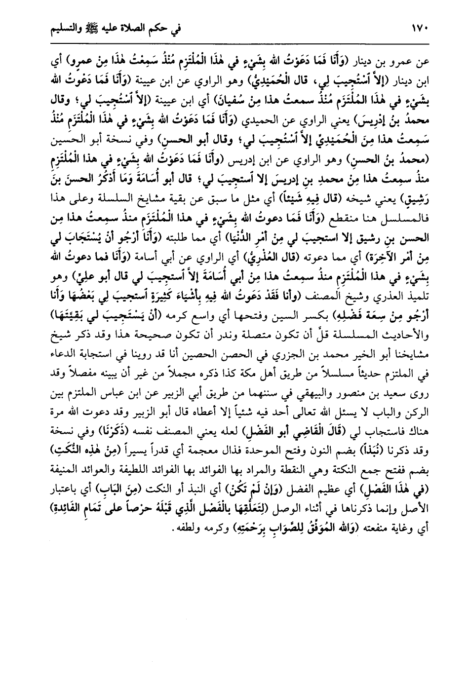 عن عَمْرُو بْنُ دِينَارٍ (وَأَنَا فَمَا دَعَوْتُ اللَّهَ بِشَيْءٍ فِي هَذَا الْمُلْتَزَمِ مُنْذُ سَمِعْتُ هَذَا من عمرو) أي ابن دينار (إلّا استجيب لي، قال الحميديّ) وهو الراوي عن ابن عيينة (وَأَنَا فَمَا دَعَوْتُ اللَّهَ بِشَيْءٍ فِي هَذَا الملتزم منذ سمعت هذا من سفيان) أي ابن عيينة (إِلَّا اسْتُجِيبَ لِي؛ وَقَالَ مُحَمَّدُ بْنُ إِدْرِيسَ) يعني الراوي عن الْحُمَيْدِيُّ (وَأَنَا فَمَا دَعَوْتُ اللَّهَ بِشَيْءٍ فِي هَذَا الْمُلْتَزَمِ مُنْذُ سَمِعْتُ هَذَا مِنَ الْحُمَيْدِيِّ إلّا استجيب لي؛ وقال أبو الحسن) وفي نسخة أبو الحسين (محمد بن الحسن) وهو الراوي عن ابن إِدْرِيسَ (وَأَنَا فَمَا دَعَوْتُ اللَّهَ بِشَيْءٍ فِي هَذَا الْمُلْتَزَمِ مُنْذُ سَمِعْتُ هَذَا مِنْ مُحَمَّدِ بْنِ إِدْرِيسَ إِلَّا اسْتُجِيبَ لِي؛ قَالَ أَبُو أسامة وما أذكر الحسن بن رشيق) يعني شيخه (قال فيه شيئا) أي مثل ما سبق عن بقية مشايخ السلسلة وعلى هذا فالمسلسل هنا منقطع (وَأَنَا فَمَا دَعَوْتُ اللَّهَ بِشَيْءٍ فِي هَذَا الْمُلْتَزَمِ مُنْذُ سَمِعْتُ هَذَا مِنَ الْحَسَنِ بْنِ رَشِيقٍ إِلَّا اسْتُجِيبَ لِي مِنْ أَمْرِ الدُّنْيَا) أي مما طلبته (وَأَنَا أَرْجُو أَنْ يُسْتَجَابَ لِي مِنْ أَمْرِ الآخرة) أي مما دعوته (قال العذريّ) أي الراوي عن أبي أسامة (وَأَنَا فَمَا دَعَوْتُ اللَّهَ بِشَيْءٍ فِي هَذَا الْمُلْتَزَمِ مُنْذُ سَمِعْتُ هَذَا مِنْ أَبِي أُسَامَةَ إلّا استجيب لي قال أبو عليّ) وهو تلميذ العذري وشيخ المصنف (وَأَنَا فَقَدَ دَعَوْتُ اللَّهَ فِيهِ بِأَشْيَاءَ كَثِيرَةٍ استجيب لي بعضها وأنا أرجو من سعة فضله) بكسر السين وفتحها أي واسع كرمه (أن يستجيب لي بقيّتها) والأحاديث المسلسلة قلّ أن تكون متصلة وندر أن تكون صحيحة هذا وقد ذكر شيخ مشايخنا أبو الخير محمد بن الجزري في الحصن الحصين أنا قد روينا في استجابة الدعاء في الملتزم حديثا مسلسلا من طريق أهل مكة كذا ذكره مجملا من غير أن يبينه مفصلا وقد روى سعيد بن منصور والبيهقي في سننهما من طريق أبي الزبير عن ابن عباس الملتزم بين الركن والباب لا يسئل الله تعالى أحد فيه شيئا إلا أعطاه قال أبو الزبير وقد دعوت الله مرة هناك فاستجاب لي (قال القاضي أبو الفضل) لعله يعني المصنف نفسه (ذكرنا) وفي نسخة وقد ذكرنا (نبذا) بضم النون وفتح الموحدة فذال معجمة أي قدرا يسيرا (من هذه النّكت) بضم ففتح جمع النكتة وهي النقطة والمراد بها الفوائد بها الفوائد اللطيفة والعوائد المنيفة (في هذا الفصل) أي عظيم الفضل (وإن لم تكن) أي النبذ أو النكت (من الباب) أي باعتبار الأصل وإنما ذكرناها في أثناء الوصل (لِتَعَلُّقِهَا بِالْفَصْلِ الَّذِي قَبْلَهُ حِرْصًا عَلَى تَمَامِ الفائدة) أي وغاية منفعته (والله الموفّق للصّواب برحمته) وكرمه ولطفه.