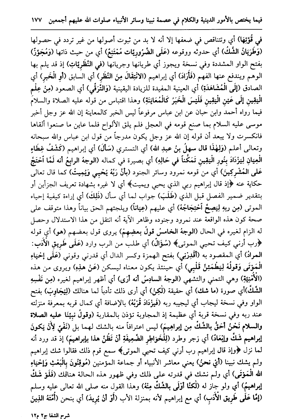 في قوّتها) أي وتتناقص في ضعفها إلا أنه لا بد من ثبوت أصولها من غير تردد في حصولها (وطريان الشّك) أي حدوثه ووقوعه (على الضّروريّات ممتنع) أي من حيث ذاتها (ومجوّز) بفتح الواو المشددة وفي نسخة ويجوز أي طريانها وجريانها (في النّظريّات) إذ قد يلم بها الوهم ويندفع عنها الفهم (فأراد) أي إبراهيم (الانتقال من النّظر) أي السابق (أو الخبر) أي الصادق (إلى المشاهدة) أي العينية المفيدة للزيادة اليقينية (والتّرقّي) أي الصعود (مِنْ عِلْمِ الْيَقِينِ إِلَى عَيْنِ الْيَقِينِ فَلَيْسَ الخبر كالمعاينة) وهذا اقتباس من قوله عليه الصلاة والسلام فيما رواه أحمد وابن حبان عن ابن عباس مرفوعا ليس الخبر كالمعاينة إن الله عز وجل أخبر موسى عليه السلام بما صنع قومه في العجل فلم يلق الألواح فلما عاين ما صنعوا ألقاها فانكسرت ولا يبعد أن قوله إن الله عز وجل يكون مدرجا من قول ابن عباس والله سبحانه وتعالى أعلم (ولهذا قال سهل بن عبد الله) أي التستري (سأل) أي إبراهيم (كَشْفَ غِطَاءِ الْعِيَانِ لِيَزْدَادَ بِنُورِ الْيَقِينِ تَمَكُّنًا في حاله) أي بصيرة في كماله (الْوَجْهُ الرَّابِعُ أَنَّهُ لَمَّا احْتَجَّ عَلَى الْمُشْرِكِينَ) أي من قومه نمرود وسائر الجنود (بأنّ ربّه يحيي ويميت) كما قال تعالى حكاية عنه إِذْ قالَ إِبْراهِيمُ رَبِّيَ الَّذِي يُحْيِي وَيُمِيتُ أي لا غيره بشهادة تعريف الجزأين أو بتقدير ضمير الفصل قبل الذي (طلب) جواب لما أي سأل (ذلك) أي إراءة كيفية إحياء الموتى (من ربه ليصحّ احتجاجه) أي عليهم (عيانا) ويلجئهم الحق بيانا وهذا متوقف على صحة كون هذه الواقعة عند نمرود وجنوده وظاهر الآية أنه انتقل من هذا الاستدلال وحصل له الزام لغيره في الحال (الوجه الخامس قول بعضهم) يروى قول بعضهم (هو) أي قوله رَبِّ أَرِنِي كَيْفَ تُحْيِ الْمَوْتى (سؤال) أي طلب من الرب وارد (على طريق الأدب: