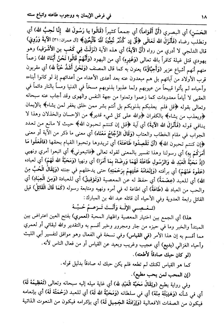 الحسن) أي البصري (أنّ أقواما) أي جمعا كثيرا (قَالُوا يَا رَسُولَ اللَّهِ إِنَّا نُحِبُّ اللَّهَ) أي ونطلب رضاه (فَأَنْزَلَ اللَّهُ تَعَالَى قُلْ إِنْ كُنْتُمْ تُحِبُّونَ اللَّهَ فَاتَّبِعُونِي [آل عمران: 31] الآية وروي) قال الدلجي لا أدري من رواه (أنّ الآية) أي هذه الآية (نزلت في كعب بن الأشرف) وهو يهودي قتل غيلة كافرا بالله تعالى (وغيره) أي من اليهود (وأنّهم قالوا نحن أبناء الله) زعما منهم أنهم أشياع عزير (وأحبّاؤه) يعنون به كما قال المصنف (ونحن أشدّ حبّا لله) أي مقربون قرب الأولاد من آبائهم بل هم مبعدون عنه بعد أعدى الأعداء من أعدائهم إذ لو كانوا أبناءه وأحباءه لم يأتوا قبيحا من عيوبهم ولما عذبوا بذنوبهم مسخا في الدنيا ومسا بالنار دائما في العقبى لا أياما معدودات كما زعموا وتمنوا من جهة النفس والهوى وقد أجاب عنه سبحانه وتعالى بقوله قُلْ فَلِمَ يُعَذِّبُكُمْ بِذُنُوبِكُمْ بَلْ أَنْتُمْ بَشَرٌ مِمَّنْ خَلَقَ يَغْفِرُ لِمَنْ يَشاءُ بالإيمان وَيُعَذِّبُ مَنْ يَشاءُ بالكفران وَاللَّهُ عَلى كُلِّ شَيْءٍ قَدِيرٌ من الإحسان والخذلان وهذا لا ينافي قوله (فأنزل الله الآية) أي آية قُلْ إِنْ كُنْتُمْ تُحِبُّونَ اللَّهَ حيث لا مانع من تعدد الجواب في مقام الخطاب والعتاب (وقال الزّجّاج معناه) أي معنى ما ذكر من الآية أو معنى إِنْ كُنْتُمْ تُحِبُّونَ اللَّهَ (أن تقصدوا طاعته) أي تريدوها وتحبوا القيام بحقها (فافعلوا ما أمركم به) أي رسولنا وهذا تفسير بالمعنى لقوله تعالى فَاتَّبِعُونِي أي اتبعوا أمري ونهيي (إِذْ مَحَبَّةُ الْعَبْدِ لِلَّهِ وَالرَّسُولِ طَاعَتُهُ لَهُمَا ورضاه بما أمرا) أي ونهيا (ومحبّة الله لهم) أي لعباده (عفوه عنهم) أي برأفته (وإنعامه عليهم برحمته) حتى يدخلهم في جنته (ويقال الحبّ من الله) أي للعبد (عصمة) أي حفظ له عن المعصية (وتوفيق) أي للعبادة (ومن العباد) أي والحب من العباد لله (طاعة) أي اطاعة له في أمره ونهيه ومتابعة رسوله (كما قال القائل) قيل القائل رابعة العدوية وفي الأحياء أن قائله عبد الله بن المبارك: