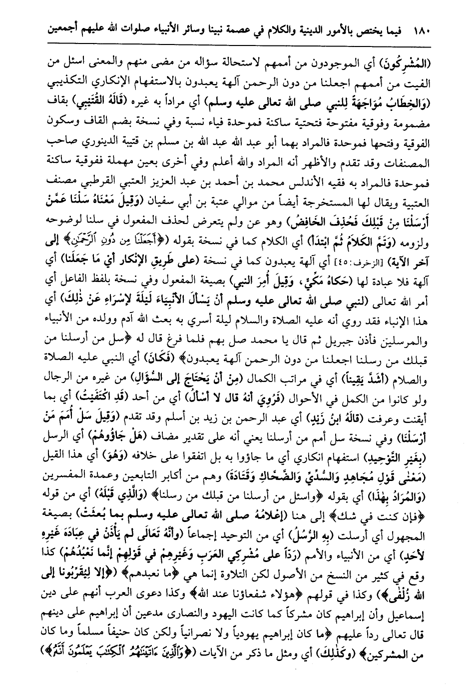 (المشركون) أي الموجودون من أممهم لاستحالة سؤاله من مضى منهم اسئل من الفيت من أممهم اجعلنا من دون الرحمن آلهة يعبدون بالاستفهام الإنكاري التكذيبي (والخطاب مواجهة للنبي صلى الله تعالى عليه وسلم) أي مرادا به غيره (قاله القتيبي) بقاف مضمومة وفوقية مفتوحة فتحتية ساكنة فموحدة فياء نسبة وفي نسخة بضم القاف وسكون الفوقية وفتحها فموحدة فالمراد بهما أبو عبد الله عبد الله بن مسلم بن قتيبة الدينوري صاحب المصنفات وقد تقدم والأظهر أنه المراد والله أعلم وفي أخرى بعين مهملة ففوقية ساكنة فموحدة فالمراد به فقيه الأندلس محمد بن أحمد بن عبد العزيز العتبي القرطبي مصنف العتبية ويقال لها المستخرجة أيضا من موالي عتبة بن أبي سفيان (وَقِيلَ مَعْنَاهُ سَلْنَا عَمَّنْ أَرْسَلْنَا مِنْ قَبْلِكَ فحذف الخافض) وهو عن ولم يتعرض لحذف المفعول في سلنا لوضوحه ولزومه (وتمّ الكلام ثمّ ابتدأ) أي الكلام كما في نسخة بقوله (أَجَعَلْنا مِنْ دُونِ الرَّحْمنِ إلى آخر الآية) [الزخرف: 45] أي آلهة يعبدون كما في نسخة (على طريق الإنكار أي ما جعلنا) أي آلهة فلا عبادة لها (حكاه مكّيّ، وقيل أمر النبي) بصيغة المفعول وفي نسخة بلفظ الفاعل أي أمر الله تعالى (لنبي صلى الله تعالى عليه وسلم أن يسأل الأنبياء ليلة لإسراء عن ذلك) أي هذا الإنباء فقد روي أنه عليه الصلاة والسلام ليلة أسري به بعث الله آدم وولده من الأنبياء والمرسلين فأذن جبريل ثم قال يا محمد صل بهم فلما فرغ قال له وَسْئَلْ مَنْ أَرْسَلْنا مِنْ قَبْلِكَ مِنْ رُسُلِنا أَجَعَلْنا مِنْ دُونِ الرَّحْمنِ آلِهَةً يُعْبَدُونَ (فكان) أي النبي عليه الصلاة والصلام (أشدّ يقينا) أي في مراتب الكمال (من أن يحتاج إلى السّؤال) من غيره من الرجال ولو كانوا من الكمل في الأحوال (فروي أنه قال لا أسأل) أي من أحد (قد اكتفيت) أي بما أيقنت وعرفت (قاله ابن زيد) أي عبد الرحمن بن زيد بن أسلم وقد تقدم (وقيل سل أمم من أرسلنا) وفي نسخة سل أمم من أرسلنا يعني أنه على تقدير مضاف (هل جاؤوهم) أي الرسل (بغير التّوحيد) استفهام انكاري أي ما جاؤوا به بل اتفقوا على خلافه (وهو) أي هذا القيل (معنى قول مجاهد والسّدّيّ والضّحّاك وقتادة) وهم من أكابر التابعين وعمدة المفسرين (والمراد بهذا) أي بقوله وَسْئَلْ مَنْ أَرْسَلْنا مِنْ قَبْلِكَ مِنْ رُسُلِنا (والّذي قبله) أي من قوله فَإِنْ كُنْتَ فِي شَكٍّ إلى هنا (إعلامه صلى الله تعالى عليه وسلم بما بعثت) بصيغة المجهول أي أرسلت (به الرّسل) أي من التوحيد إجماعا (وَأَنَّهُ تَعَالَى لَمْ يَأْذَنْ فِي عِبَادَةِ غَيْرِهِ لأحد) أي من الأنبياء والأمم (رَدًّا عَلَى مُشْرِكِي الْعَرَبِ وَغَيْرِهِمْ فِي قَوْلِهِمْ إنّما نعبدهم) كذا وقع في كثير من النسخ من الأصول لكن التلاوة إنما هي ما نَعْبُدُهُمْ (إِلَّا لِيُقَرِّبُونا إِلَى اللَّهِ زُلْفى) وكذا في قولهم هؤُلاءِ شُفَعاؤُنا عِنْدَ اللَّهِ وكذا دعوى العرب أنهم على دين إسماعيل وأن إبراهيم كان مشركا كما كانت اليهود والنصارى مدعين أن إبراهيم على دينهم قال تعالى ردا عليهم ما كانَ إِبْراهِيمُ يَهُودِيًّا وَلا نَصْرانِيًّا وَلكِنْ كانَ حَنِيفاً مُسْلِماً وَما كانَ مِنَ الْمُشْرِكِينَ (وكذلك) أي ومثل ما ذكر من الآيات (وَالَّذِينَ آتَيْناهُمُ الْكِتابَ يَعْلَمُونَ أَنَّهُ)