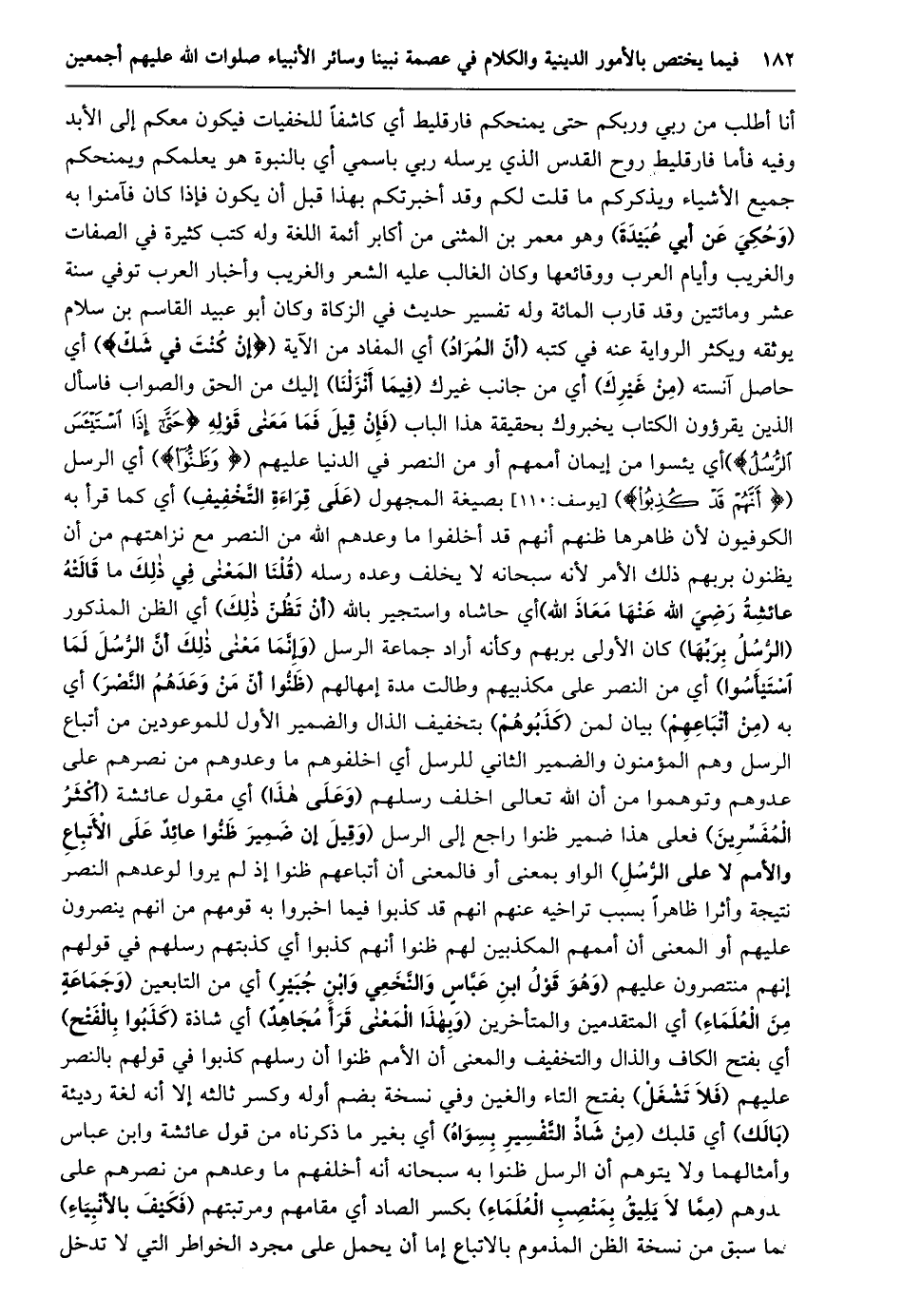 أنا أطلب من ربي وربكم حتى يمنحكم فارقليط أي كاشفا للخفيات فيكون معكم إلى الأبد وفيه فارقليط روح القدس الذي يرسله ربي باسمي أي بالنبوة هو يعلمكم ويمنحكم جميع الأشياء ويذكركم ما قلت لكم وقد أخبرتكم بهذا قبل أن يكون فإذا كان فآمنوا به (وحكي عن أبي عبيدة) وهو معمر بن المثنى من أكابر أئمة اللغة وله كتب كثيرة في الصفات والغريب وأيام العرب ووقائعها وكان الغالب عليه الشعر والغريب وأخبار العرب توفي سنة عشر ومائتين وقد قارب المائة وله تفسير حديث في الزكاة وكان أبو عبيد القاسم بن سلام يوثقه ويكثر الرواية عنه في كتبه (أنّ المراد) أي المفاد من الآية (فَإِنْ كُنْتَ فِي شَكٍّ) أي حاصل آنسته (من غيرك) أي من جانب غيرك (فيما أنزلنا) إليك من الحق والصواب فاسأل الذين يقرؤون الكتاب يخبروك بحقيقة هذا الباب (فَإِنْ قِيلَ فَمَا مَعْنَى قَوْلِهِ حَتَّى إِذَا اسْتَيْأَسَ الرُّسُلُ) أي يئسوا من إيمان أممهم أو من النصر في الدنيا عليهم (وَظَنُّوا) أي الرسل (أَنَّهُمْ قَدْ كُذِبُوا) [يوسف: 110] بصيغة المجهول (على قراءة التّخفيف) أي كما قرأ به الكوفيون لأن ظاهرها ظنهم أنهم قد أخلفوا ما وعدهم الله من النصر مع نزاهتهم من أن يظنون بربهم ذلك الأمر لأنه سبحانه لا يخلف وعده رسله (قُلْنَا الْمَعْنَى فِي ذَلِكَ مَا قَالَتْهُ عَائِشَةُ رضي الله عنها معاذ الله) أي حاشاه واستجير بالله (أن تظنّ ذلك) أي الظن المذكور (الرّسل بربّها) كان الأولى بربهم وكأنه أراد جماعة الرسل (وَإِنَّمَا مَعْنَى ذَلِكَ أَنَّ الرُّسُلَ لَمَّا اسْتَيْأَسُوا) أي من النصر على مكذبيهم وطالت مدة إمهالهم (ظنّوا أنّ من وعدهم النّصر) أي به (من أتباعهم) بيان لمن (كذبوهم) بتخفيف الذال والضمير الأول للموعودين من أتباع الرسل وهم المؤمنون والضمير الثاني للرسل أي اخلفوهم ما وعدوهم من نصرهم على عدوهم وتوهموا من أن الله تعالى اخلف رسلهم (وعلى هذا) أي مقول عائشة (أكثر المفسّرين) فعلى هذا ضمير ظنوا راجع إلى الرسل (وقيل إن ضمير ظَنُّوا عَائِدٌ عَلَى الْأَتْبَاعِ وَالْأُمَمِ لَا عَلَى الرّسل) الواو بمعنى أو فالمعنى أن أتباعهم ظنوا إذ لم يروا لوعدهم النصر نتيجة وأثرا ظاهرا بسبب تراخيه عنهم انهم قد كذبوا فيها اخبروا به قومهم من انهم ينصرون عليهم أو المعنى أن أممهم المكذبين لهم ظنوا أنهم كذبوا أي كذبتهم رسلهم في قولهم إنهم منتصرون عليهم (وَهُوَ قَوْلُ ابْنِ عَبَّاسٍ وَالنَّخَعِيِّ وَابْنِ جُبَيْرٍ) أي من التابعين (وجماعة من العلماء) أي المتقدمين والمتأخرين (وبهذا المعنى قرأ مجاهد) أي شاذة (كذبوا بالفتح) أي بفتح الكاف والذال والتخفيف والمعنى أن الأمم ظنوا أن رسلهم كذبوا في قولهم بالنصر عليهم (فلا تشغل) بفتح التاء والغين وفي نسخة بضم أوله وكسر ثالثه إلا أنه لغة رديئة (بالك) أي قلبك (من شاذّ التّفسير بسواه) أي بغير ما ذكرناه من قول عائشة وابن عباس وأمثالهما ولا يتوهم أن الرسل ظنوا به سبحانه أنه أخلفهم ما وعدهم من نصرهم على عدوهم (ممّا لا يليق بمنصب العلماء) بكسر الصاد أي مقامهم ومرتبتهم (فكيف بالأنبياء) فما سبق من نسخة الظن المذموم بالاتباع إما أن يحمل على مجرد الخواطر التي لا تدخل