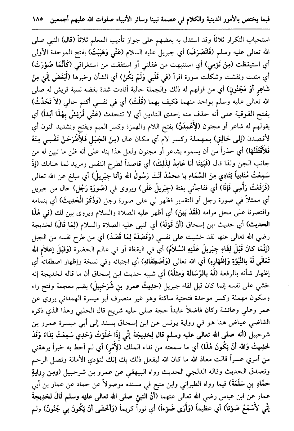 استحباب التكرار ثلاثا وقد استدل به بعضهم على جواز تأديب المعلم ثلاثا (قال) النبي صلى الله تعالى عليه وسلم (فانصرف) أي جبريل عليه السلام (عنّي وهببت) بفتح الموحدة الأولى أي استيقظت (من نومي) أي استنبهت من غفلتي أو استفقت من استغراقي (كأنّما صوّرت) أي مثلت ونقشت وشكلت سورة اقرأ (في قلبي ولم يكن) أي الشأن وخبرها (أبغض إليّ من شاعر أو مجنون) أي من قولهم له ذلك والجملة حالية أفادت شدة بغضه نسبة قريش له صلى الله تعالى عليه وسلم بواحد منهما فكيف بهما (قلت) أي في نفسي أكتم حالي (لا تحدّث) بفتح الفوقية على أنه حذف منه إحدى التاءين أي لا تتحدث (عنّي قريش بهذا أبدا) أي بقولهم له شاعر أو مجنون (لأعمدنّ) بفتح اللام والهمزة وكسر الميم ويفتح وتشديد النون أي لأقصدن (إلى حالق) بمهملة وكسر لام أي مكان عال (من الجبل فلأطرحنّ نفسي منه فلأقتلنّها) أي حذرا من أن يسموه بشاعر أو مجنون ولعل هذا بناء على أنه ظن ما تبين له من جانب الجن ولذا قال (فبينا أنا عامد لذلك) أي قاصدا لطرح النفس ومريد لما هنالك (إِذْ سَمِعْتُ مُنَادِيًا يُنَادِي مِنَ السَّمَاءِ يَا محمّد أنت رسول الله وأنا جبريل) أي مبلغ عن الله تعالى (فرفعت رأسي فإذا) أي ففاجأني بغتة (جبريل على) ويروى في (صورة رجل) حال من جبريل أي ممثلا في صورة رجل أو التقدير فظهر لي على صورة رجل (وذكر الحديث) أي بتمامه واقتصرنا على محل مرامه (فقد بيّن) أي أظهر عليه الصلاة والسلام ويروى بين لك (في هذا الحديث) أي حديث ابن إسحاق (أنّ قوله) أي النبي عليه الصلاة والسلام (لما قال) لخديجة رضي الله تعالى عنها لقد خشيت على نفسي (وقصده لما قصد) أي من طرح نفسه من الجبل (إنّما كان قبل لقاء جبريل عليه السّلام) أي في اليقظة أو في عالم الحضرة (وَقَبْلَ إِعْلَامِ اللَّهِ تَعَالَى لَهُ بِالنُّبُوَّةِ وَإِظْهَارِهِ) أي الله تعالى (واصطفائه) أي اجتبائه وفي نسخة وإظهار اصطفائه أي إظهار شأنه بالرفعة (له بالرّسالة ومثله) أي شبيه حديث ابن إسحاق أن ما قاله لخديجة إنه خشي على نفسه إنما كان قبل لقاء جبريل (حديث عمرو بن شرحبيل) بضم معجمة وفتح راء وسكون مهملة وكسر موحدة فتحتية ساكنة وهو غير منصرف أبو ميسرة الهمداني يروي عن عمر وعلي وعائشة وكان فاضلا عابدا حجة صلى عليه شريح قال الحلبي وهذا الذي ذكره القاضي عياض هنا هو في رواية يونس عن ابن إسحاق بسند إلى أبي ميسرة عمرو بن شرحبيل (أنه صلى الله تعالى عَلَيْهِ وَسَلَّمَ قَالَ لِخَدِيجَةَ إِنِّي إِذَا خَلَوْتُ وَحْدِي سَمِعْتُ نِدَاءً وَقَدْ خَشِيتُ وَاللَّهِ أَنْ يكون هذا) أي ما سمعته من نداء الملك (لأمر) أي لم أحط به خبرا يرهقني من أمري عسرا قالت معاذ الله ما كان الله ليفعل ذلك بك إنك لتؤدي الأمانة وتصل الرحم وتصدق الحديث وقاله الدلجي الحديث رواه البيهقي عن عمرو بن شرحبيل (ومن رواية حمّاد بن سلمة) فيما رواه الطبراني وابن منيع في مسنده موصولا عن حماد عن عمار بن أبي عمار عن ابن عباس رضي الله تعالى عنهما (أنّ النبيّ صلى الله تعالى عَلَيْهِ وَسَلَّمَ قَالَ لِخَدِيجَةَ إِنِّي لَأَسْمَعُ صَوْتًا) أي عظيما (وأرى ضوءا) أي نورا كريما (وأخشى أن يكون بي جنون) ولم