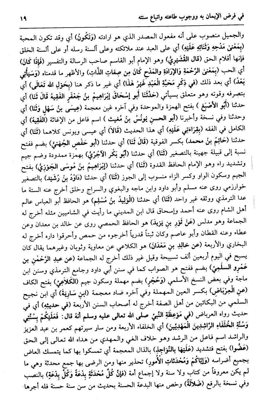 والجميل منصوب على أنه مفعول المصدر الذي هو ارادته (وتكون) أي وقد تكون المحبة (بمعنى مدحه وثنائه عليه) أي على العبد عند ملائكته وعلى ألسنة رسله أو على ألسنة الخلق فإنها أقلام الحق (قال القشيريّ) وهو الإمام أبو القاسم صاحب الرسالة والتفسير (فإذا كان) أي الحب (بِمَعْنَى الرَّحْمَةِ وَالْإِرَادَةِ وَالْمَدْحِ كَانَ مِنْ صِفَاتِ الذّات) والأظهر ما قدمناه (وسيأتي بعد) أي بعد ذلك (في ذكر محبّة العبد غير هذا) أي غير ما ذكر هنا (بحول الله تعالى) أي بتصرفه وقوته وهو متعلق بسيأتي (حَدَّثَنَا أَبُو إِسْحَاقَ إِبْرَاهِيمُ بْنُ جَعْفَرٍ الْفَقِيهُ قال ثنا) أي حدثنا (أبو الأصبغ) بفتح الهمزة والموحدة وفي آخره غين معجمة (عيسى بن سهل وثنا) أي وحدثنا وفي نسخة وأخبرنا (أبو الحسن يونس بن مغيث) اسم فاعل من الإغاثة (الفقيه) أي الكامل في الفقه (بقراءتي عليه) أي هذا الحديث (قالا) أي عيسى ويونس كلاهما (ثنا) أي حدثنا (حاتم بن محمد) بكسر الفوقية (قال ثنا) أي حدثنا (أبو حفص الجهنيّ) بضم ففتح نسبة إلى قبيلة جهينة بالتصغير (ثنا) أي حدثنا (أبو بكر الآجرّي) بهمزة ممدودة وضم جيم وتشديد راء وهو الإمام الحافظ القدوة (ثنا) أي حدثنا (إبراهيم بن موسى الجوزيّ) بفتح الجيم وسكون الواو وكسر الزاء منسوب إلى الجوز (ثنا) أي حدثنا (داود بن رشيد) بالتصغير خوارزمي روى عنه مسلم وأبو داود وابن ماجه والبغوي والسراج وخلق أخرج عنه الستة ما عدا الترمذي ووثقه غير واحد (ثنا) أي حدثنا (الوليد بن مسلم) هو الحافظ أبو العباس عالم أهل الشام روى عنه أحمد وإسحاق قال ابن المديني ما رأيت في الشاميين مثله أخرج له الجماعة وهو مدلس (عن ثور بن يزيد) هو الحافظ الحمصي روى عن خالد بن معدان وعن عطاء وعنه القطان وأبو عاصم وكان ثبتا قدريا أخرجوه من حمص وأحرقوا داره أخرج له البخاري والأربعة (عن خالد بن معدان) هو الكلاعي عن معاوية وثوبان وغيرهما يقال كان يسبح في اليوم أربعين ألف تسبيحة وقيل غير ذلك أخرج له الجماعة (عن عبد الرّحمن بن عمرو السلميّ) بضم ففتح هو الصواب كما في سنن أبي داود وجامع الترمذي وسنن ابن ماجة وفي بعض النسخ الأسلمي (وحجر) بضم مهملة وسكون جيم (الكلاعيّ) بفتح الكاف (عن العرباض) بكسر العين المهملة وفي آخره ضاد معجمة (ابن سارية) أي ابن نجيح السلمي من البكائين من أهل الصفة أخرج له أصحاب السنن الأربعة (في حديثه) أي في حديث رواه العرباض (في موعظة النّبي صلى الله تعالى عَلَيْهِ وَسَلَّمَ أَنَّهُ قَالَ: فَعَلَيْكُمْ بِسُنَّتِي وَسُنَّةِ الخلفاء الرّاشدين المهديّين) أي الخلفاء الأربعة ومن سار سيرتهم كعمر بن عبد العزيز والراشد اسم فاعل من الرشد وهو خلاف الغي والمهدي من هداه الله تعالى إلى الحق (عضّوا) بفتح فتشديد (عليها بالنّواجذ) بالذال المعجمة أي تمسكوا بها كما يتمسك العاض بجميع أضراسه (وإيّاكم ومحدثات الأمور) تحذير منها ومن الرضى بها جمع محدثة وهي ما لم يكن معروفا من كتاب ولا سنة ولا إجماع أمة (فإنّ كلّ محدثة بدعة وكلّ بدعة) بالنصب وفي نسخة بالرفع (ضلالة) وخص منها البدعة الحسنة بحديث من سن سنة حسنة فله أجرها